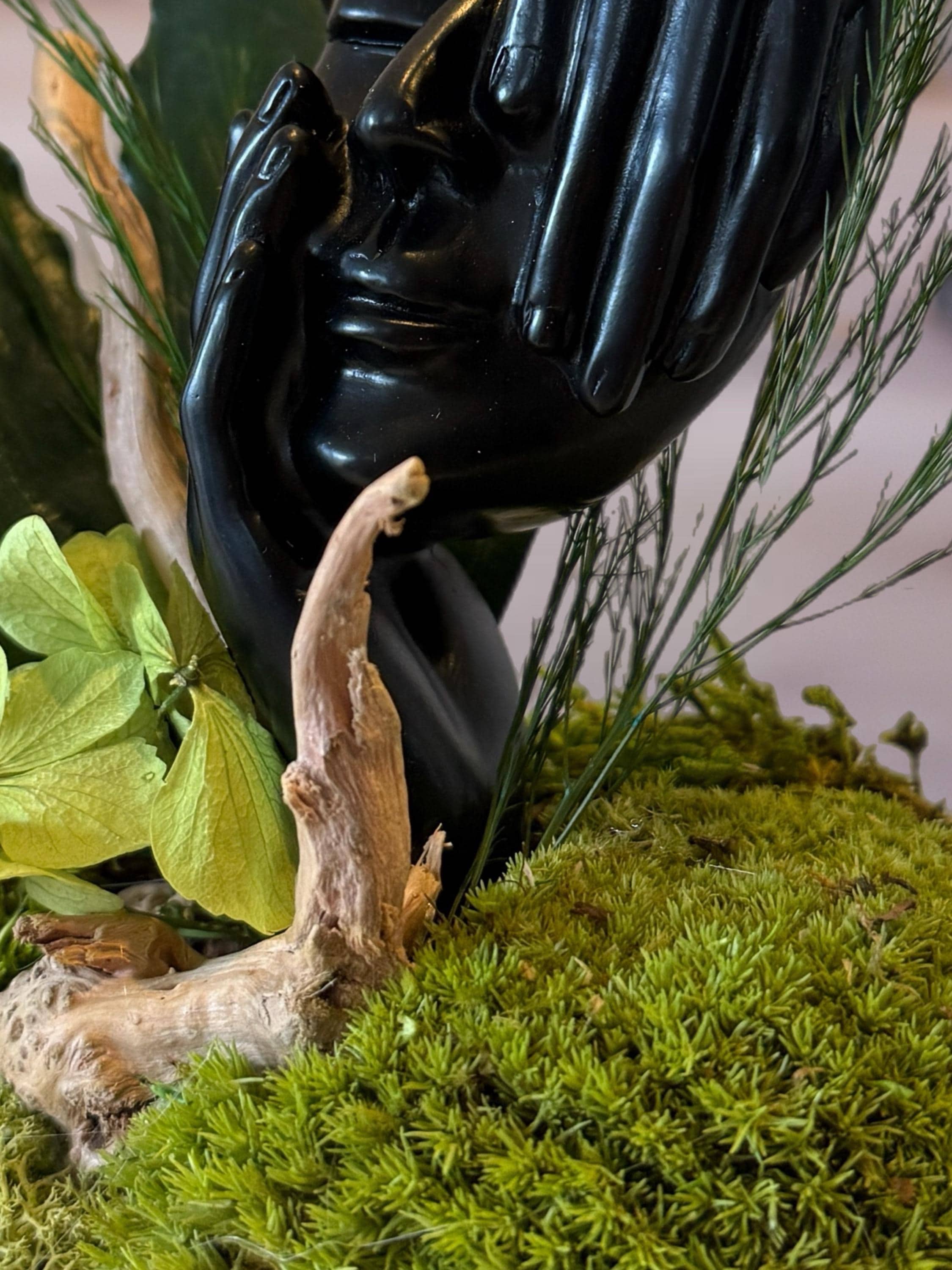 • Matériaux : mousse, fougères et feuillages stabilisés + sculpture de visage