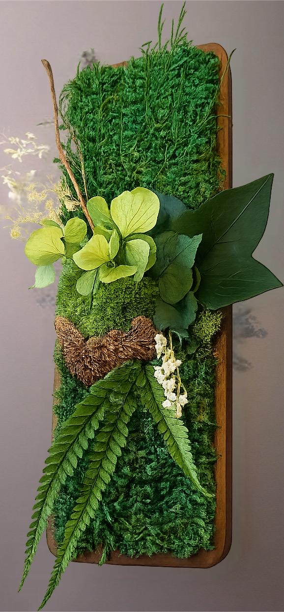 Un petit cadre végétal stabilisé au format élancé, mêlant mousse naturelle, hortensia vert stabilisé, eucalyptus et gypsophile, pour une touche végétale élégante et durable.