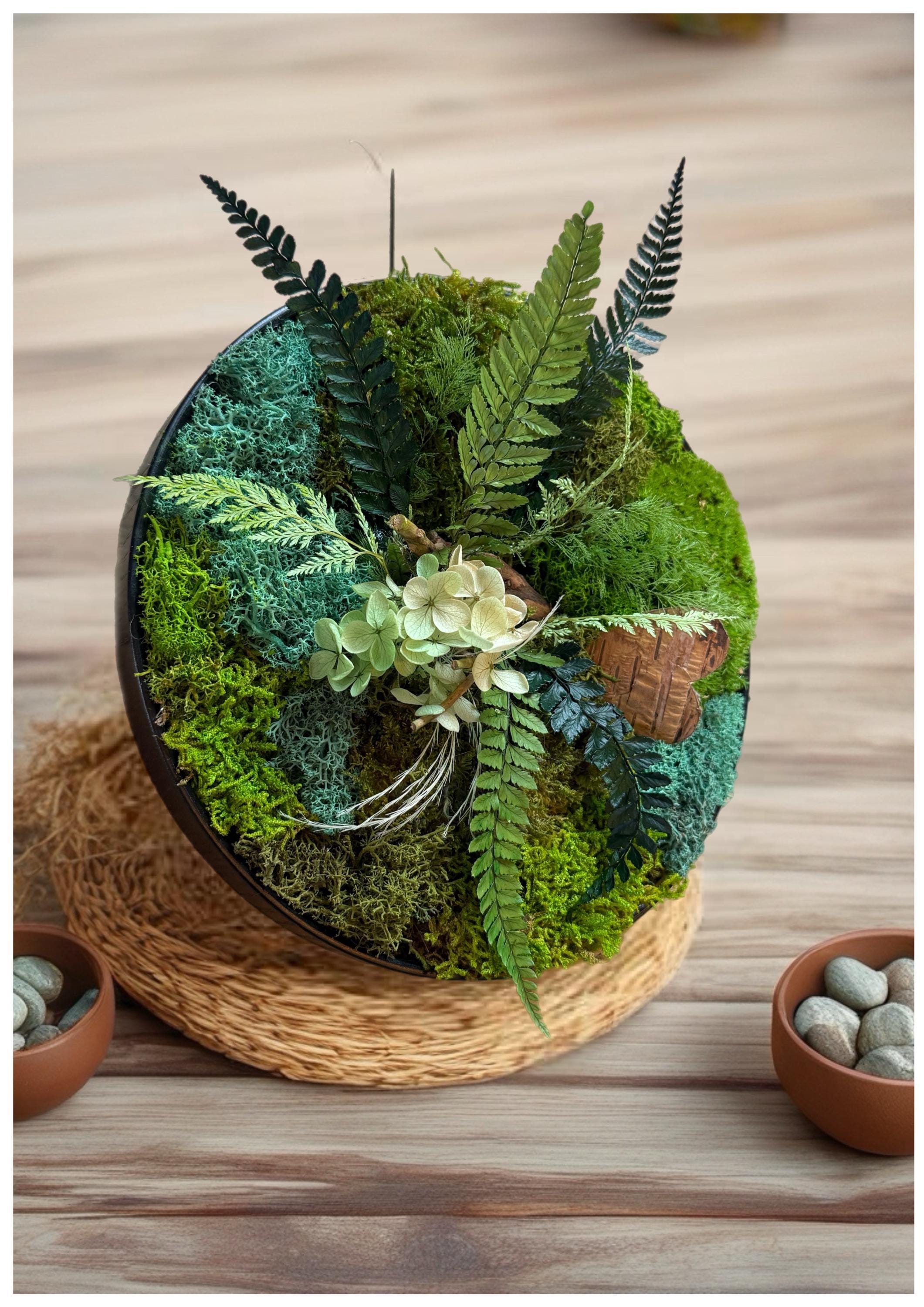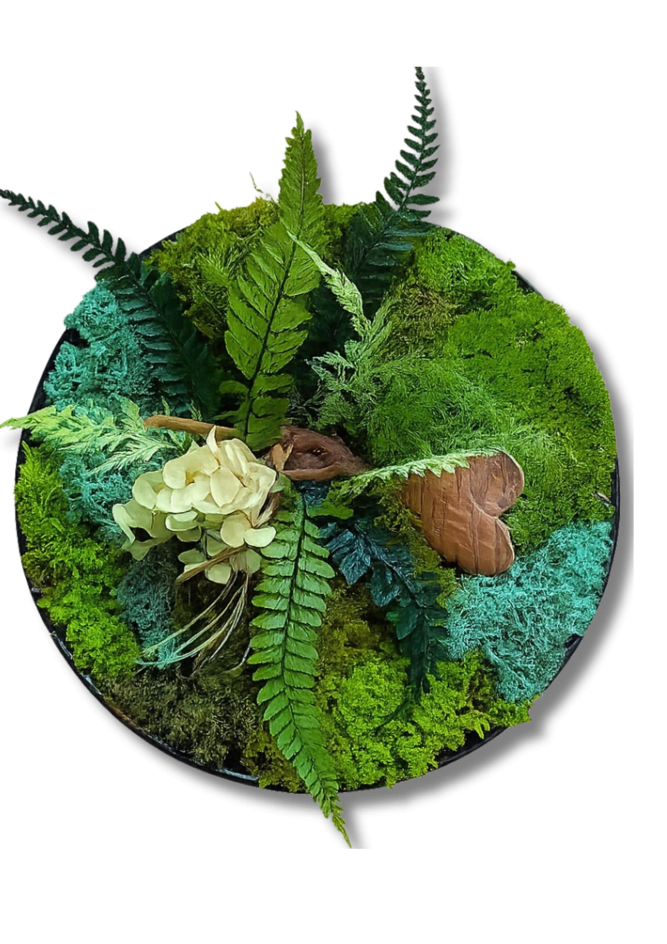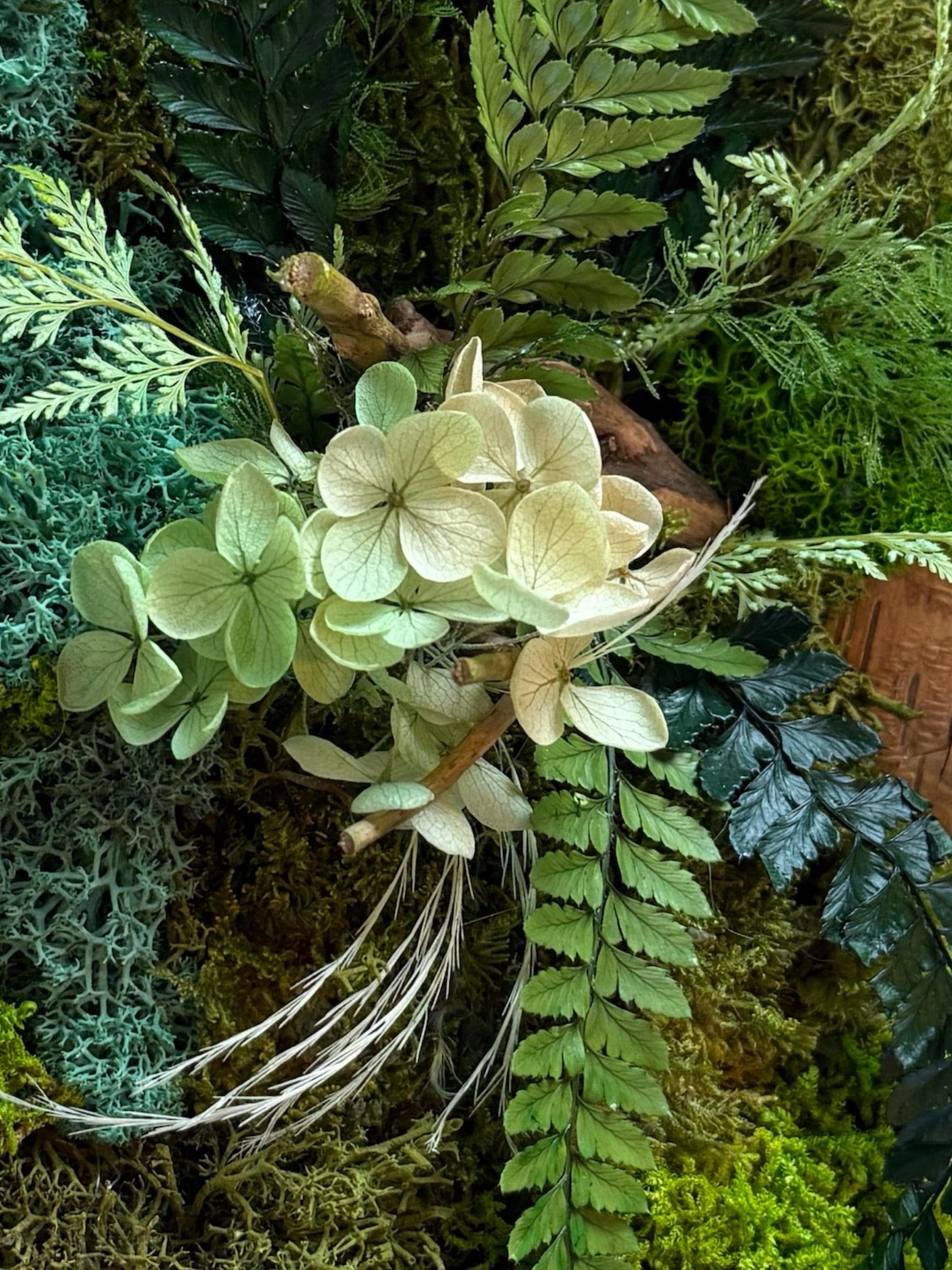 Chaque composition est réalisée entièrement à la main, avec un jeu de mousses stabilisées aux nuances de vert, de fougères délicates, de lichens texturés, et une touche florale d’hortensia stabilisé.