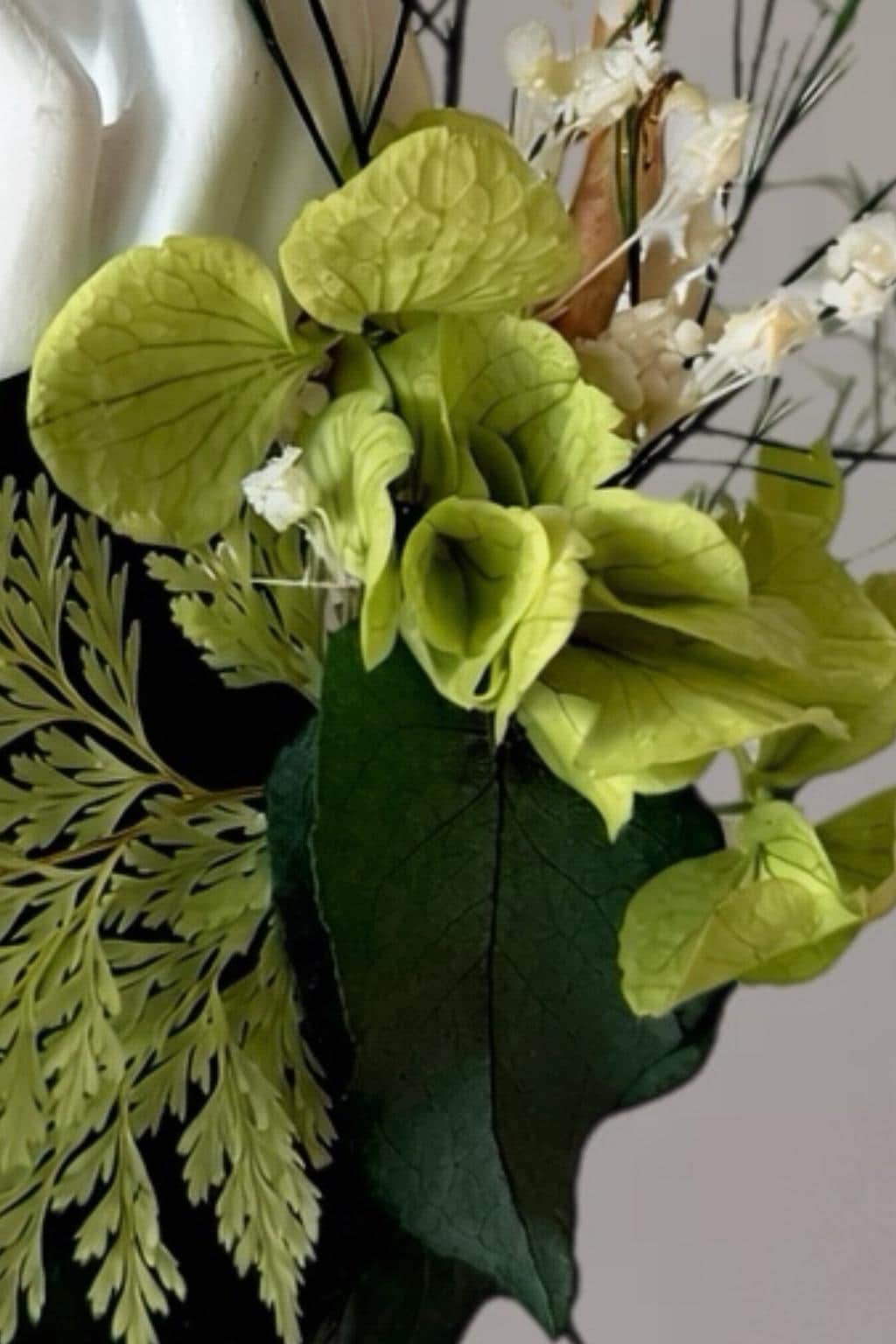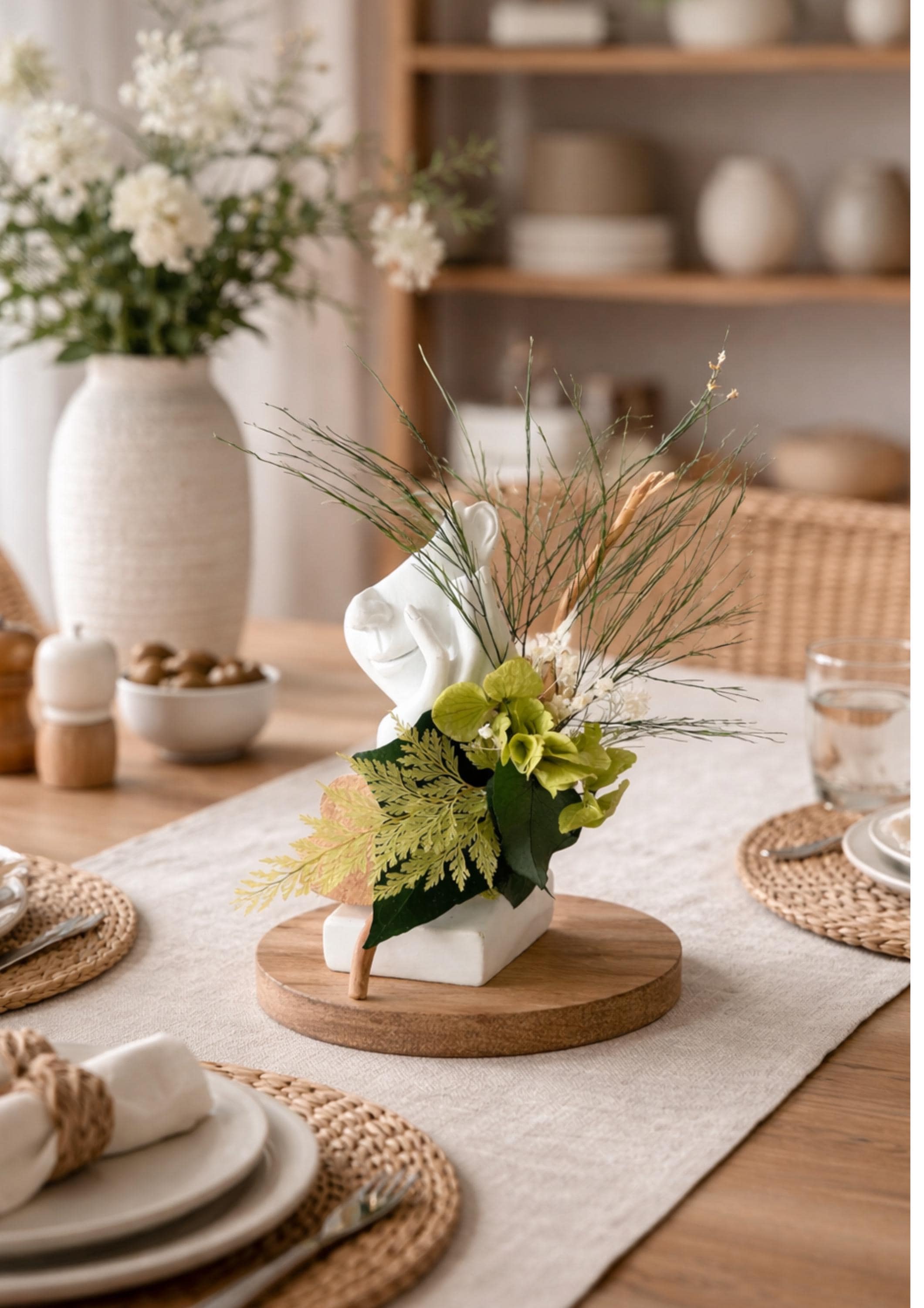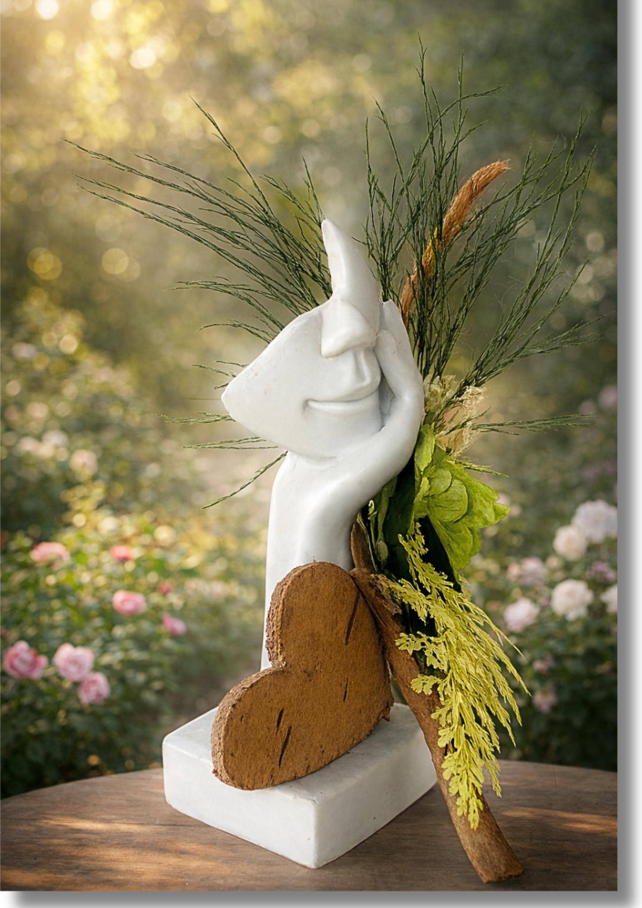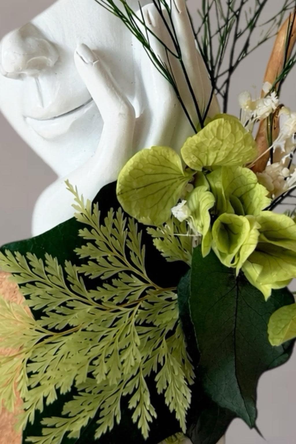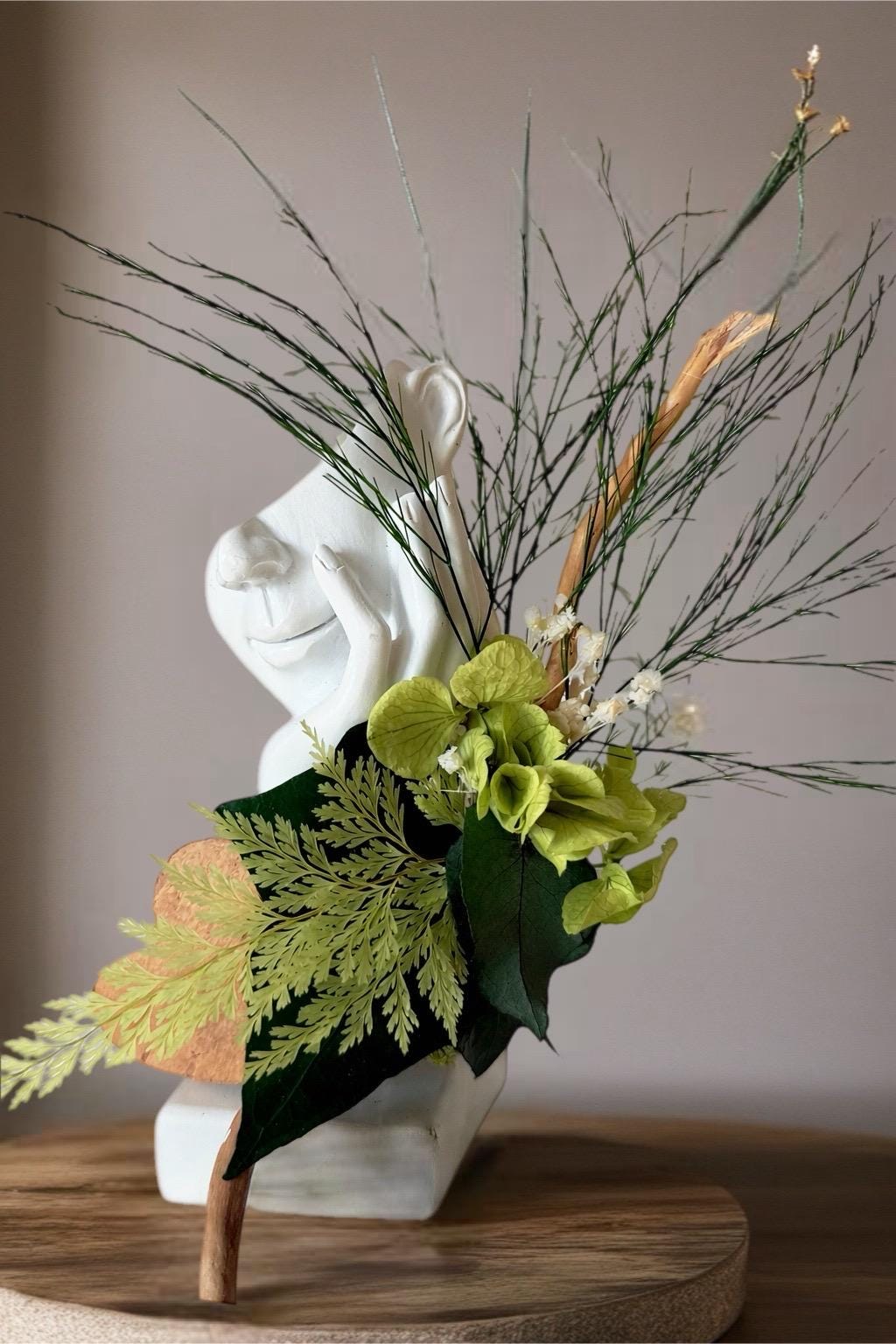 Cette création végétale unique associe la douceur d’une sculpture visage blanc à une composition de végétaux stabilisés, pour une décoration à la fois poétique, naturelle et contemporaine.