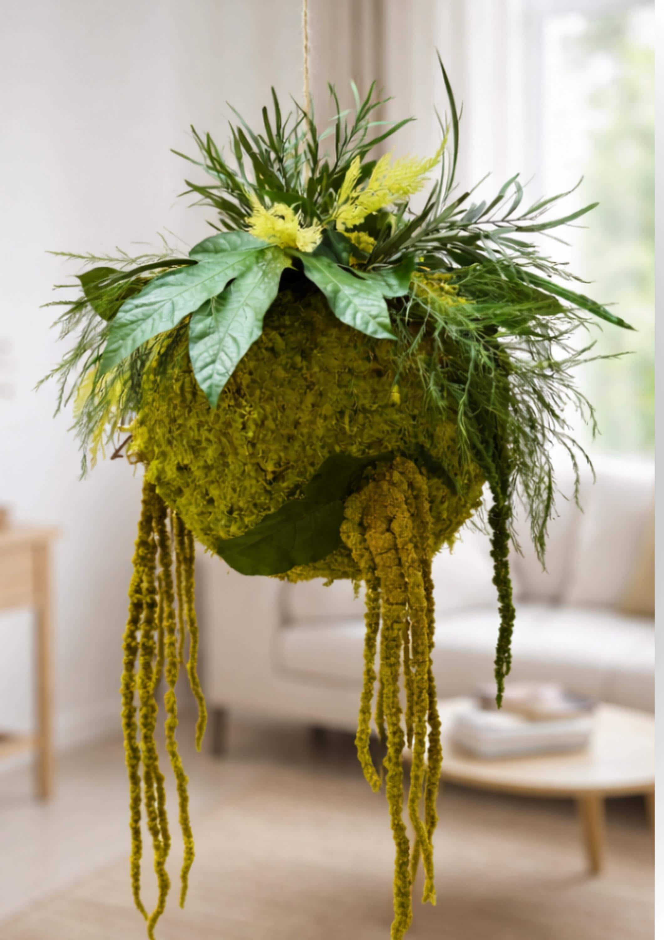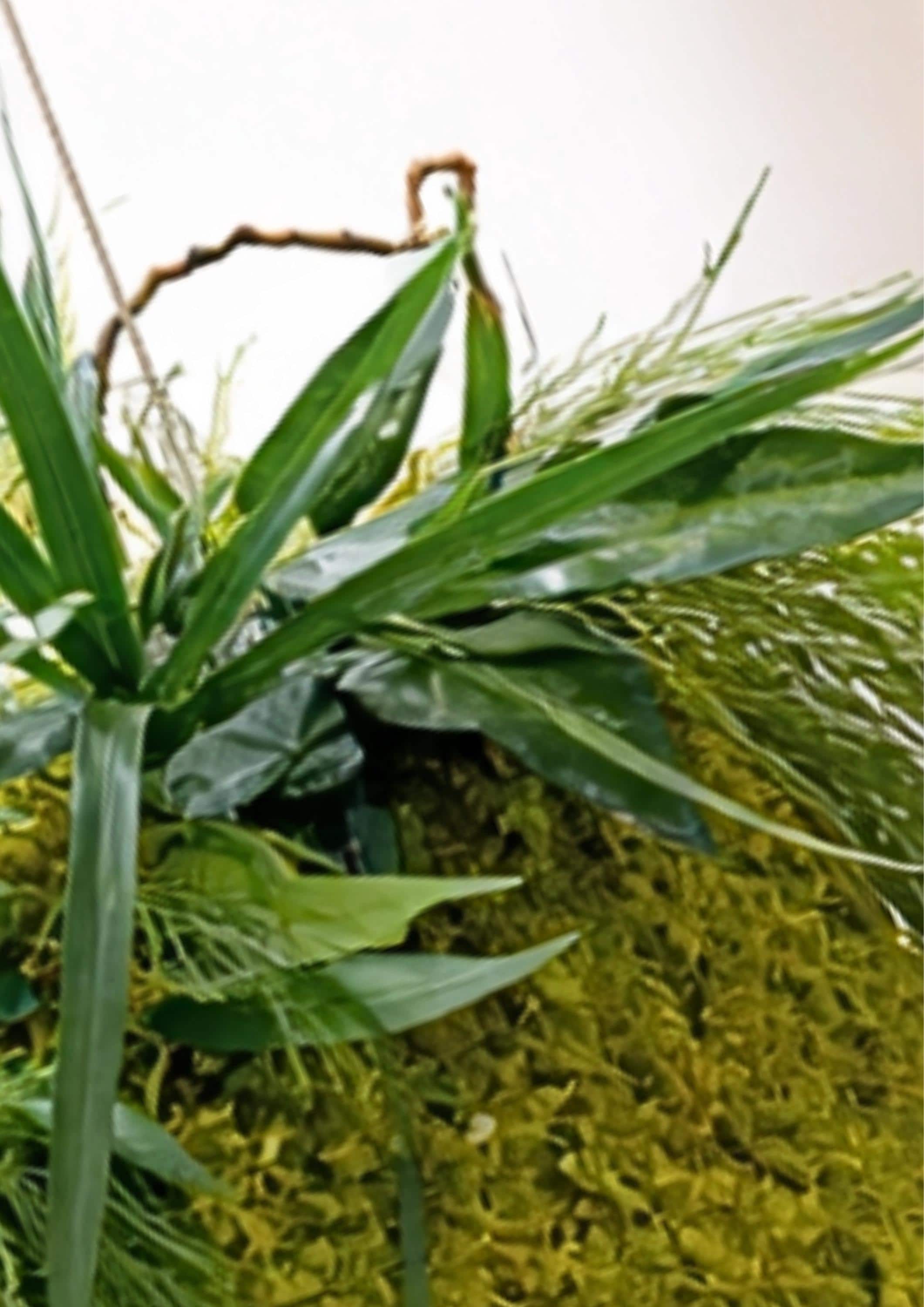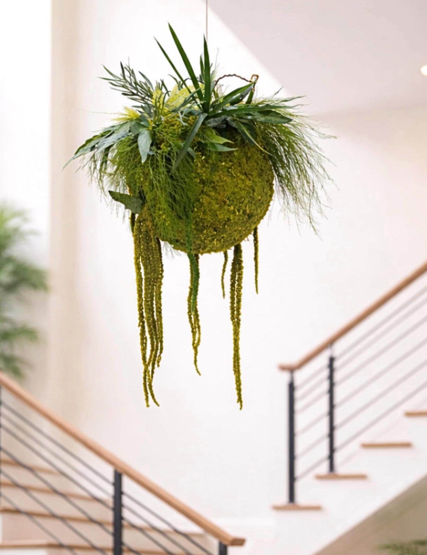Cette sphère végétale associe mousse naturelle, feuillages délicats et lignes graphiques pour créer une décoration aérienne, idéale dans un hall d’entrée, une cage d’escalier, un salon ou un espace professionnel.