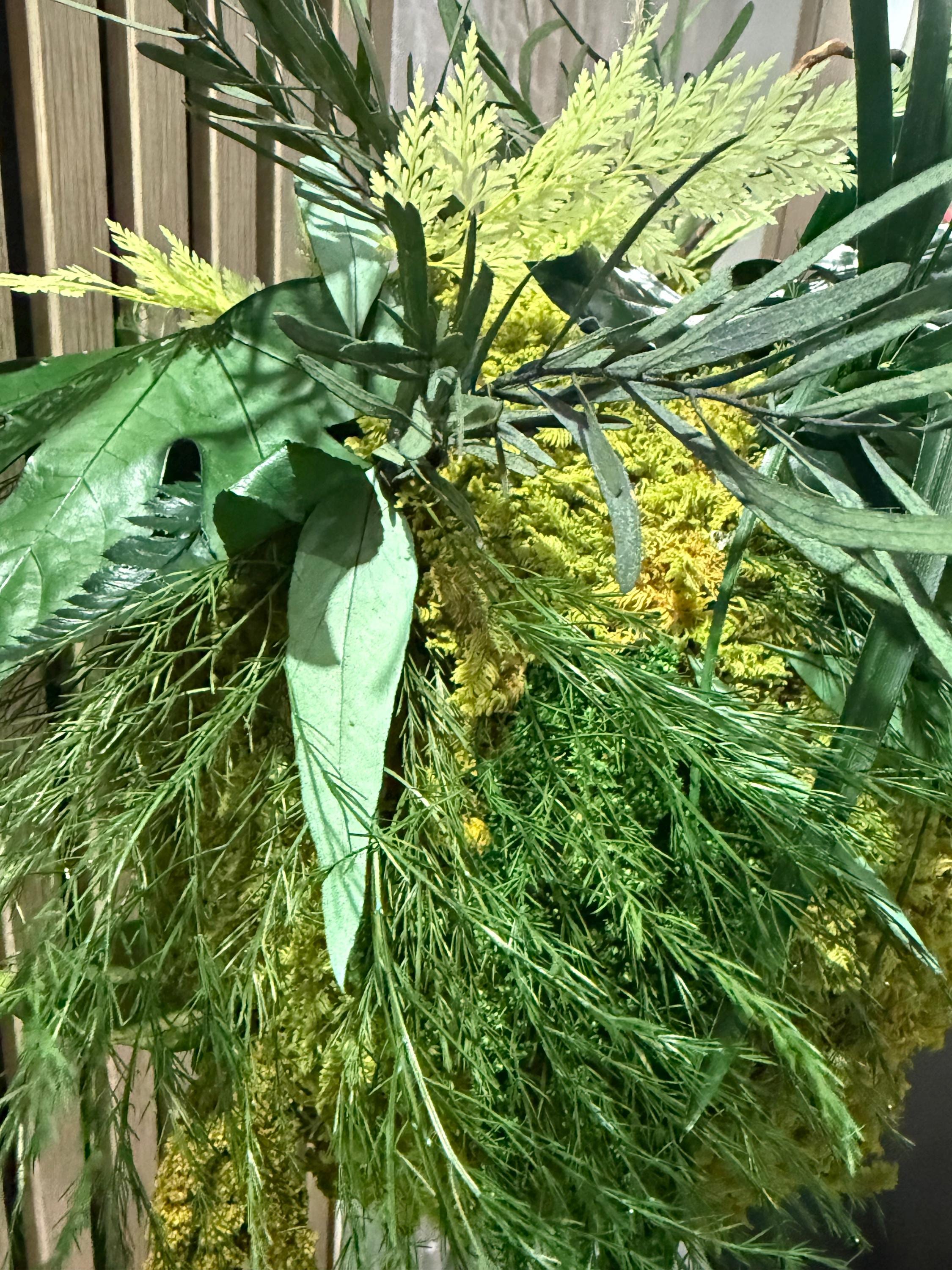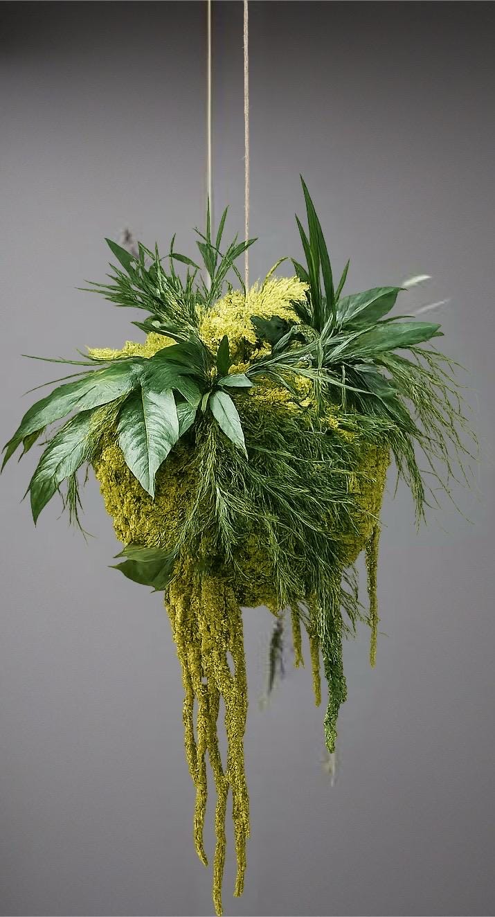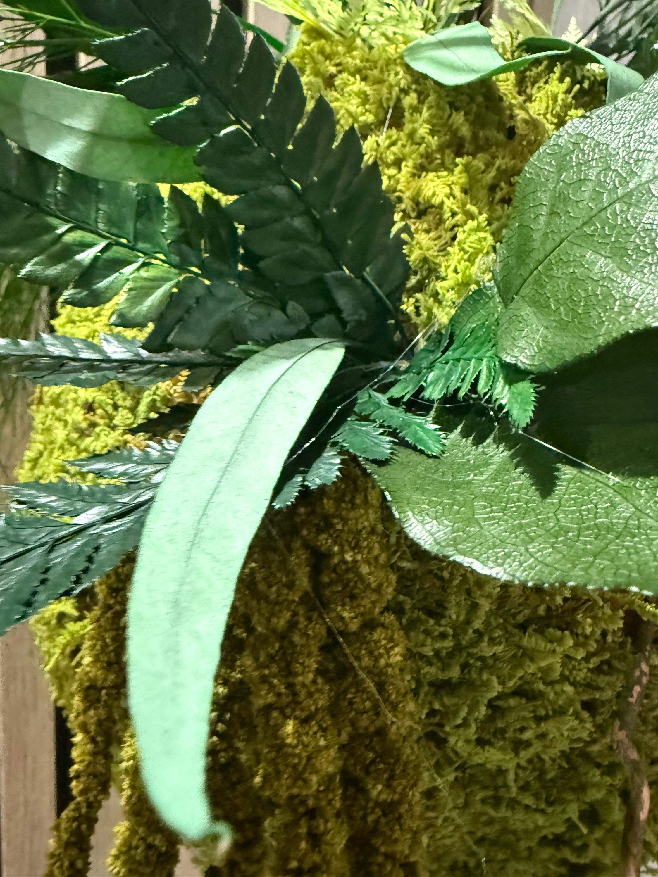 Cette sphère végétale associe mousse naturelle, feuillages délicats et lignes graphiques pour créer une décoration aérienne, idéale dans un hall d’entrée, une cage d’escalier, un salon ou un espace professionnel.