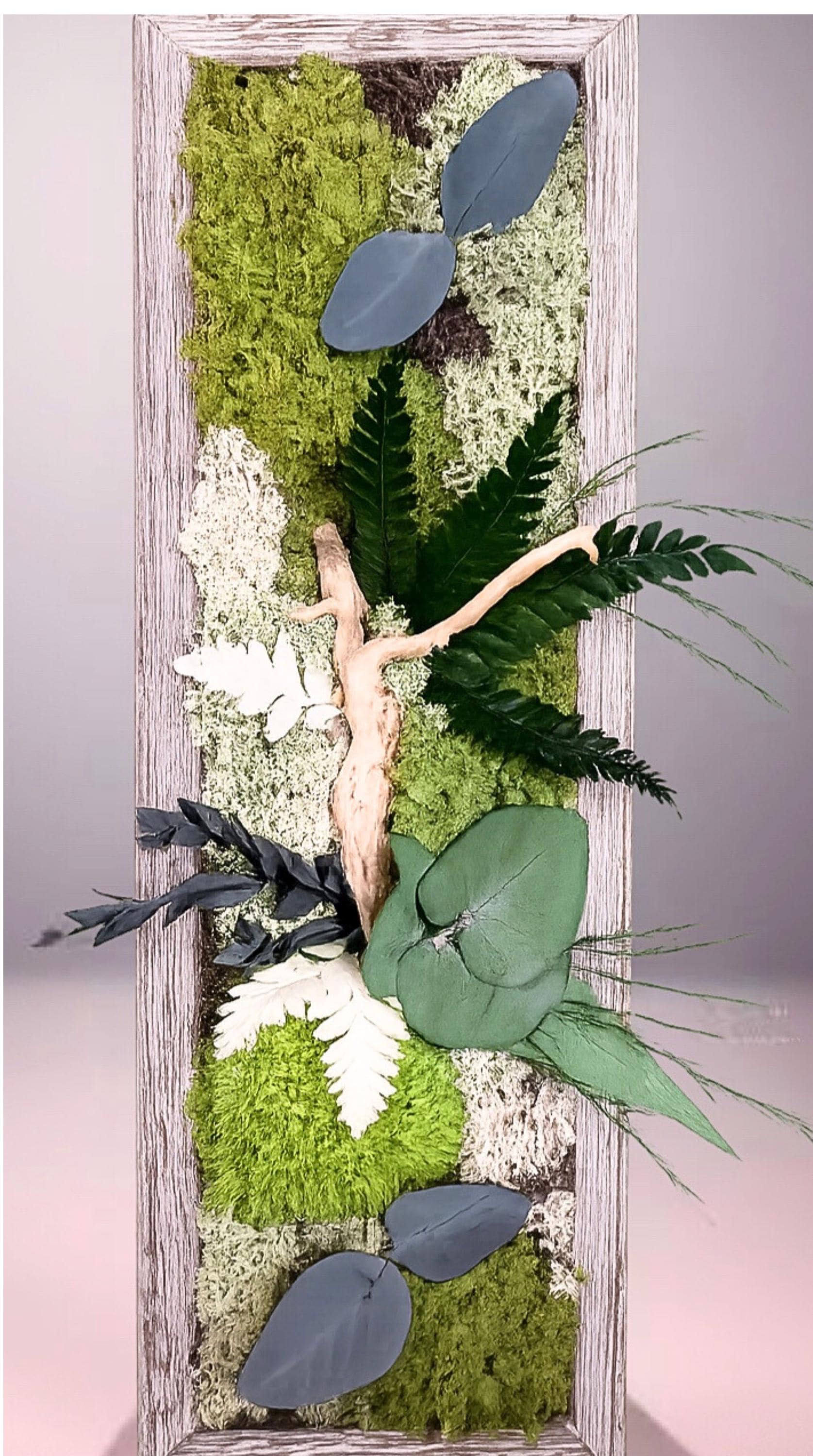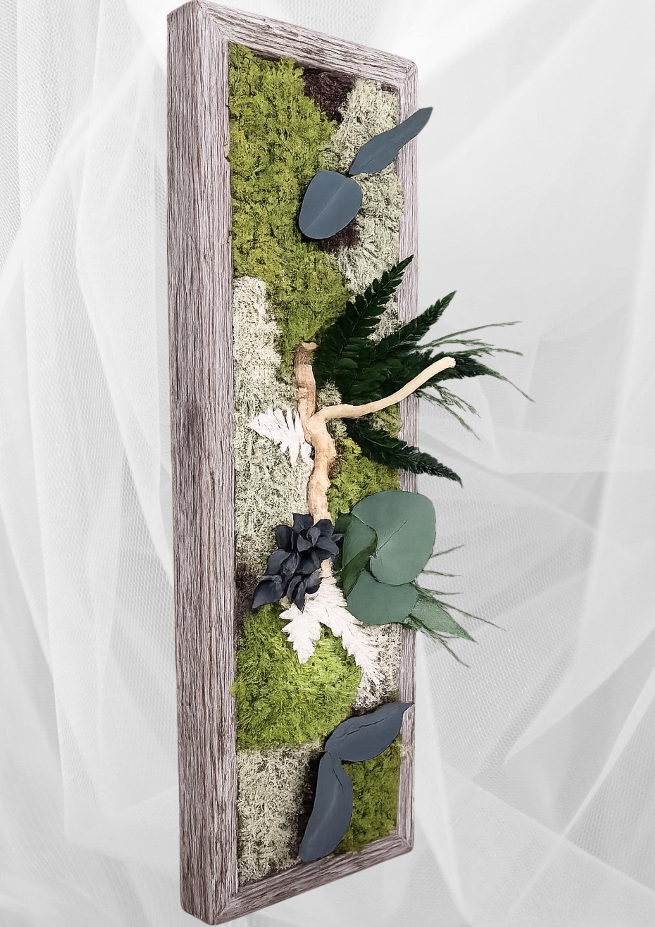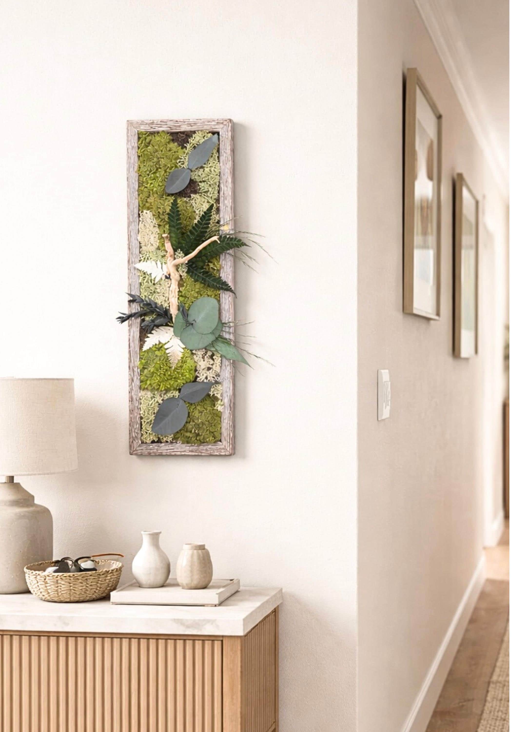Ce cadre végétal vertical au format élancé (38 × 13 cm) a été pensé pour les espaces où l’on manque de largeur mais où l’on souhaite apporter une touche de nature élégante et contemporaine.