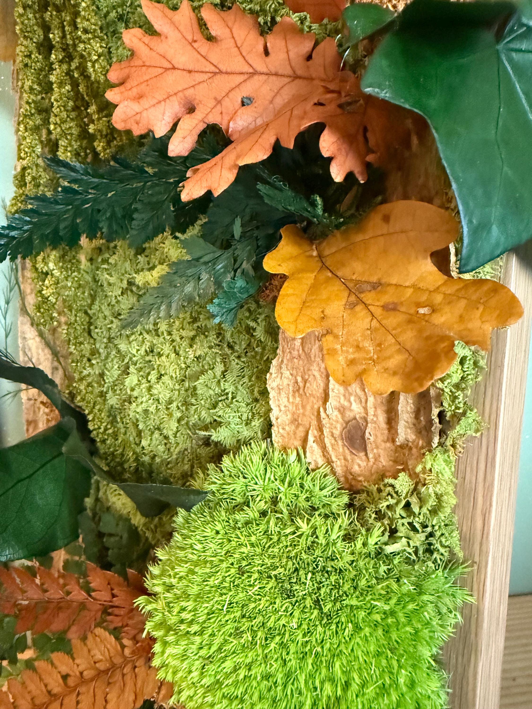 Ce cadre joue sur les contrastes de verts profonds, de beiges lumineux et de touches automnales, pour un rendu à la fois doux, organique et contemporain.