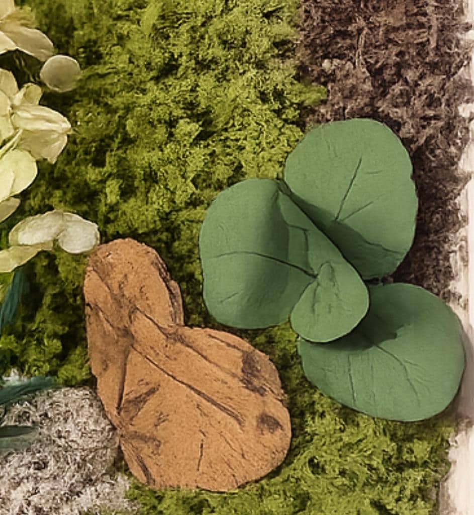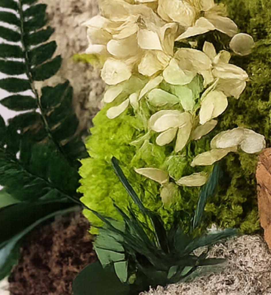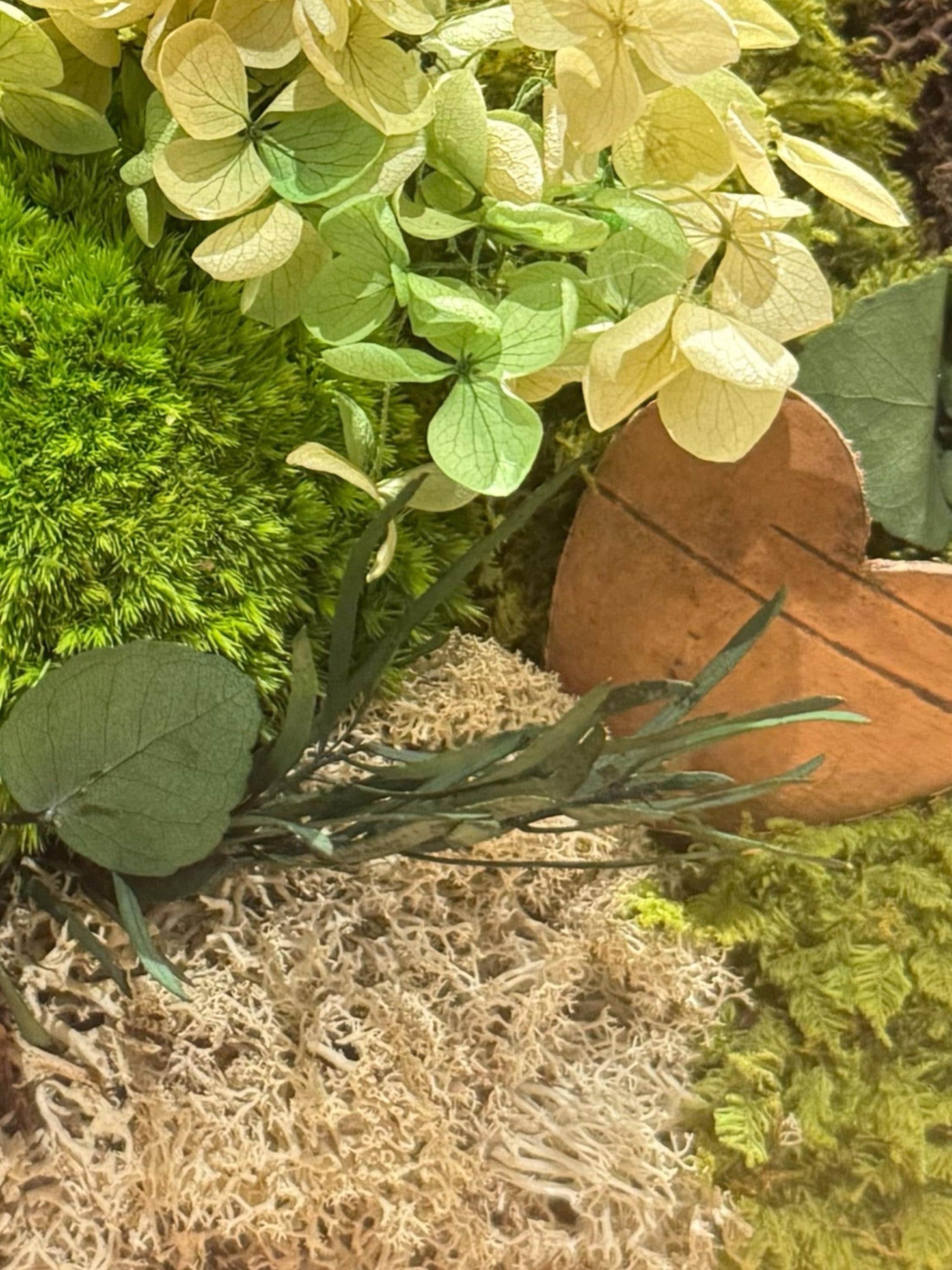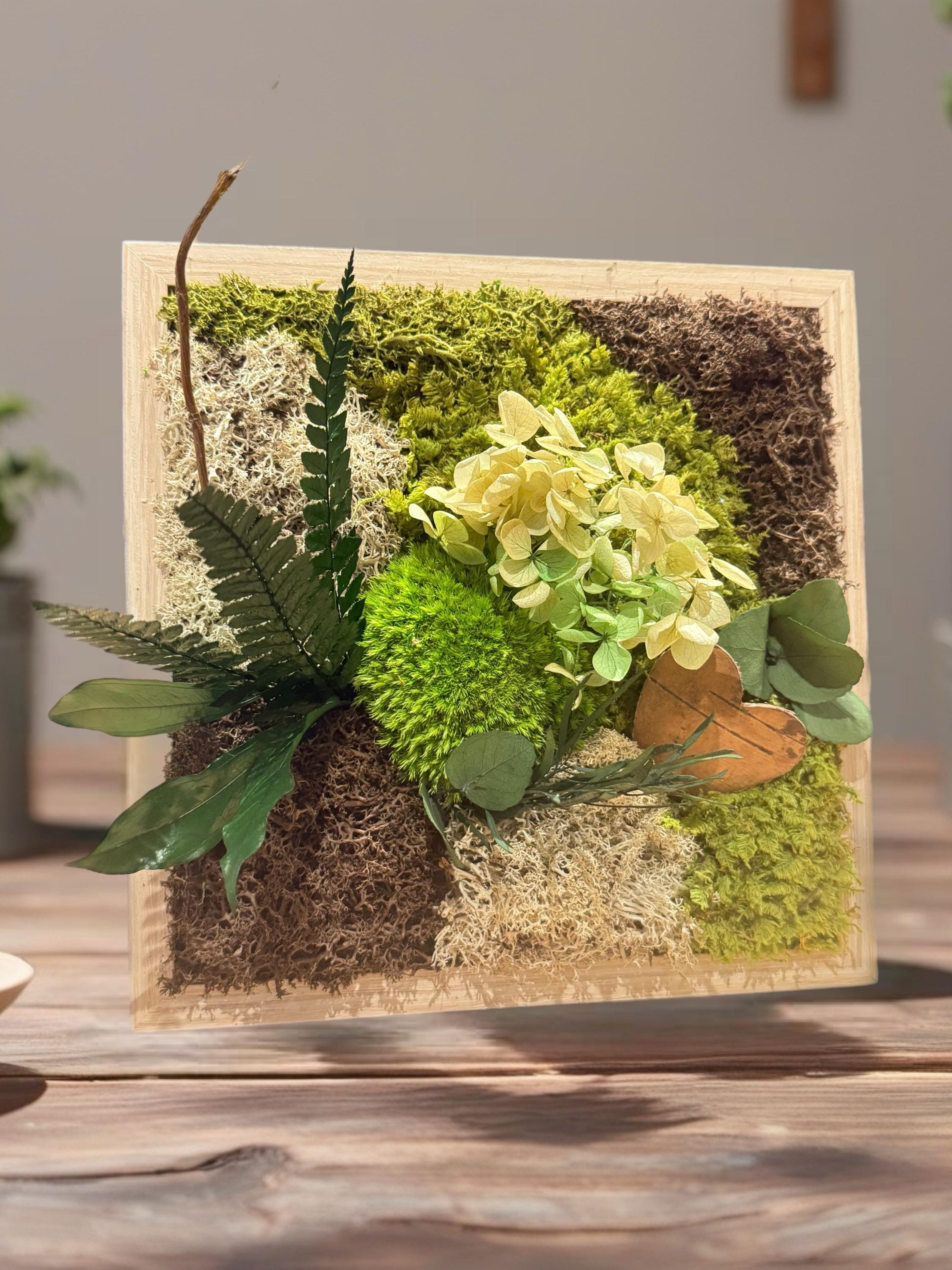 Un petit cadre végétal 22 × 22 cm, entièrement réalisé à la main, mêlant mousses stabilisées, eucalyptus et hortensia.