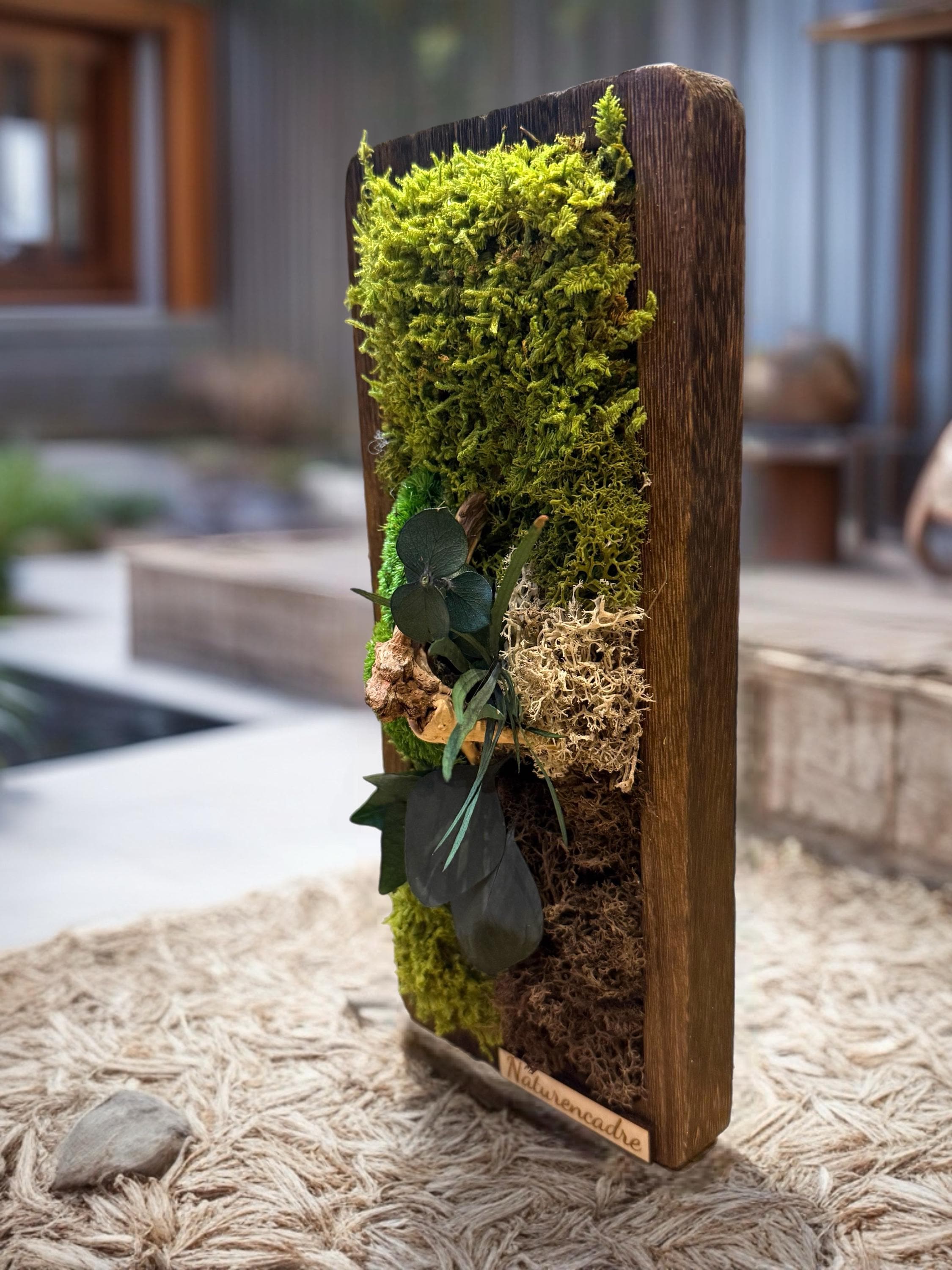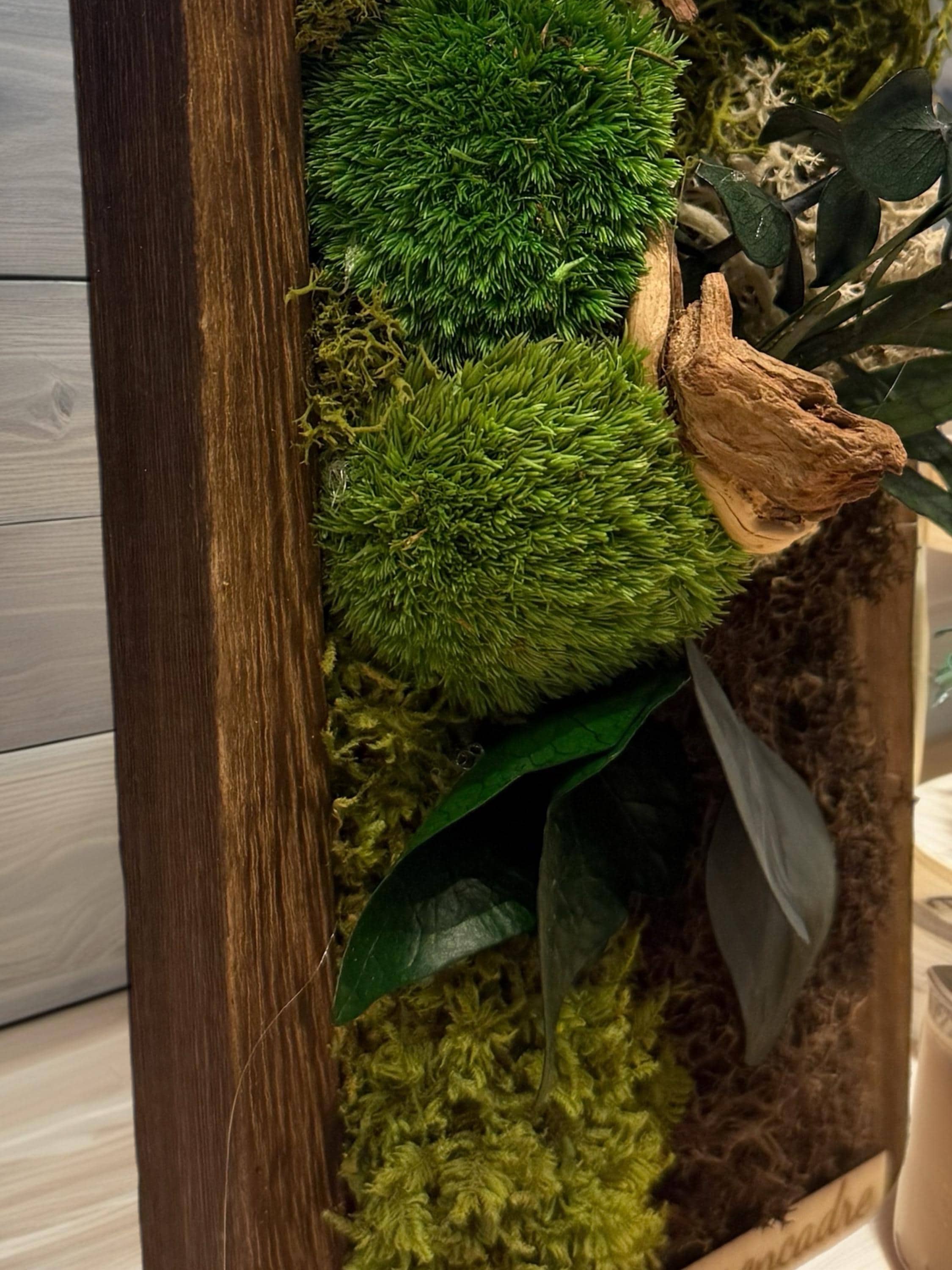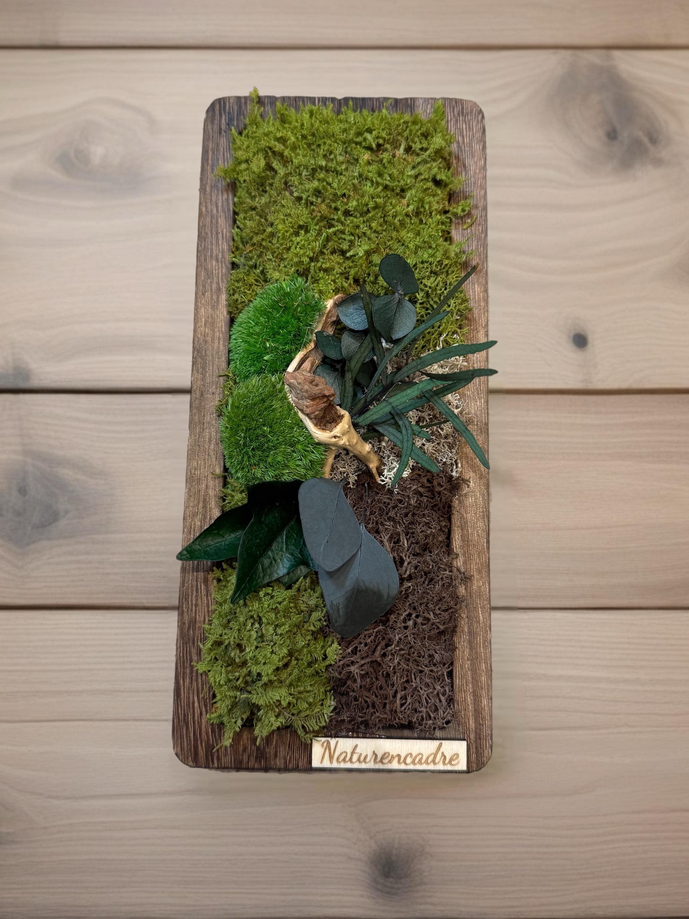 mousses naturelles, feuillages stabilisés et éléments boisés, harmonieusement intégrés dans un cadre en bois brut au caractère authentique.