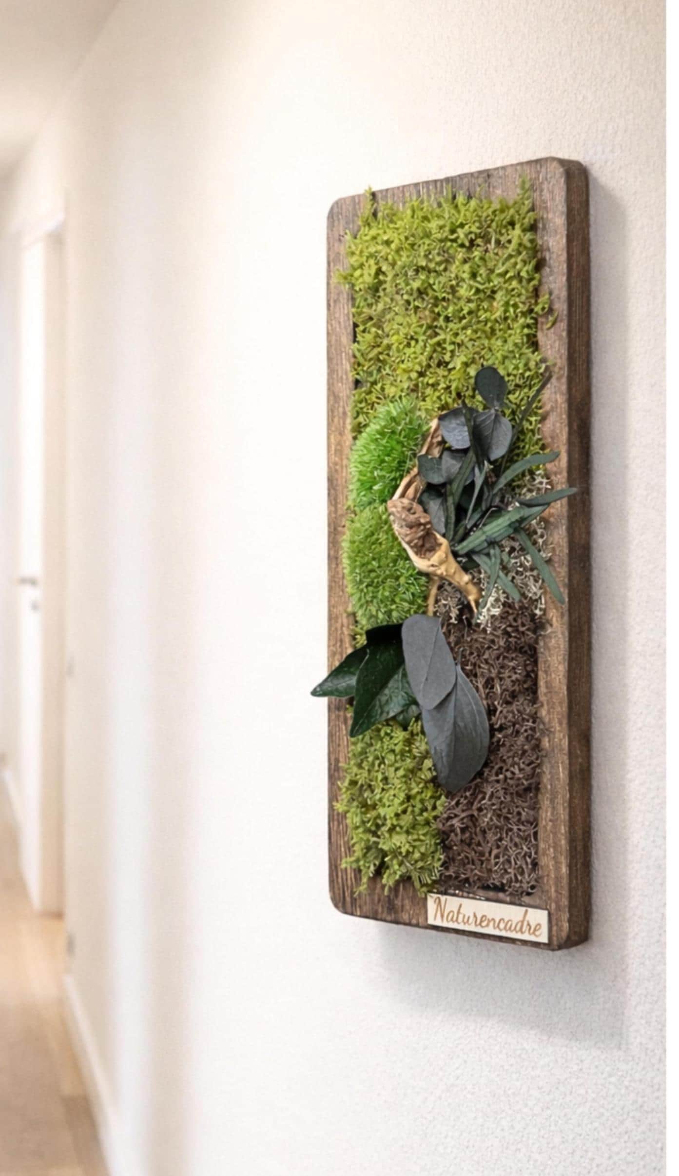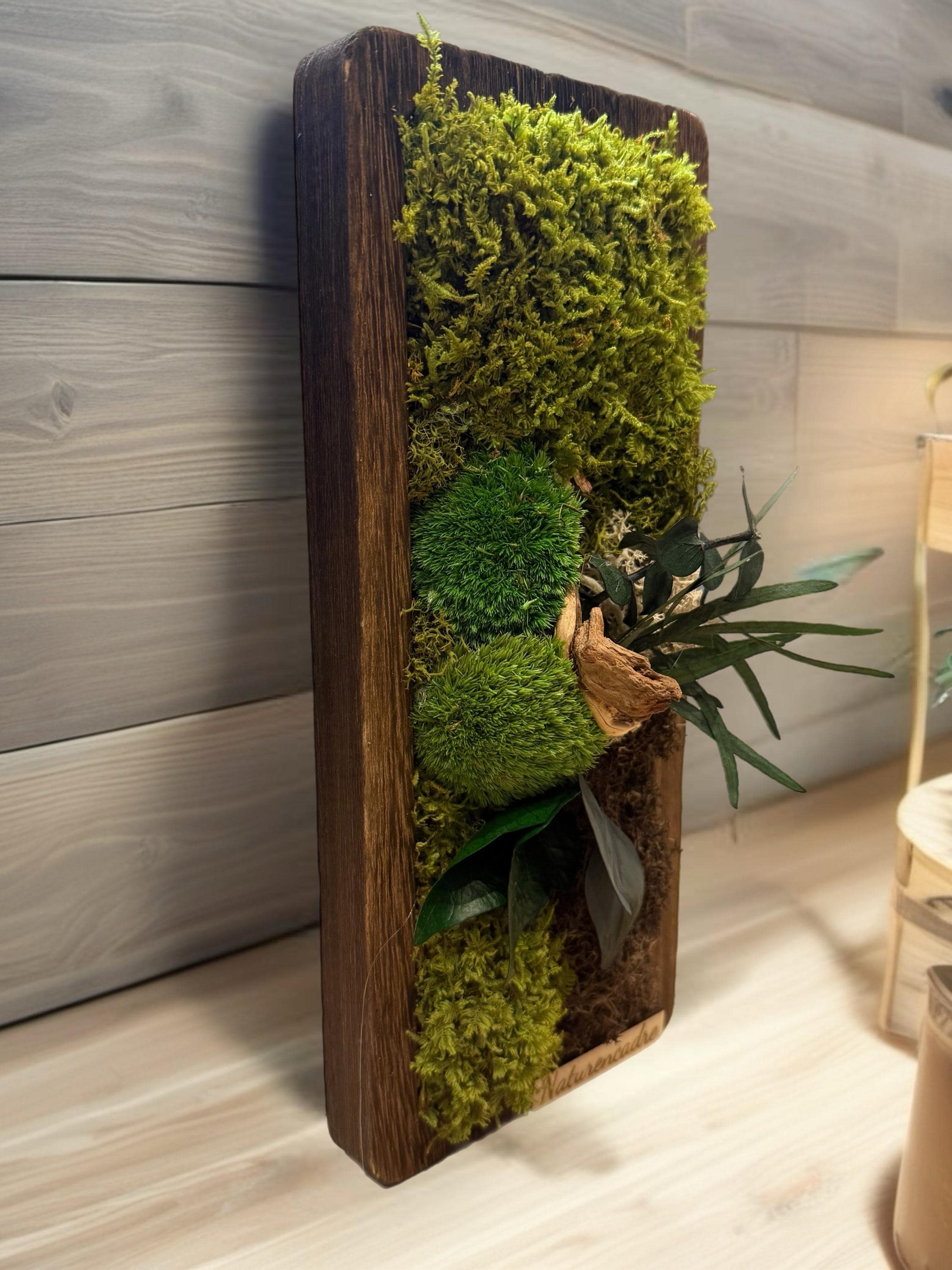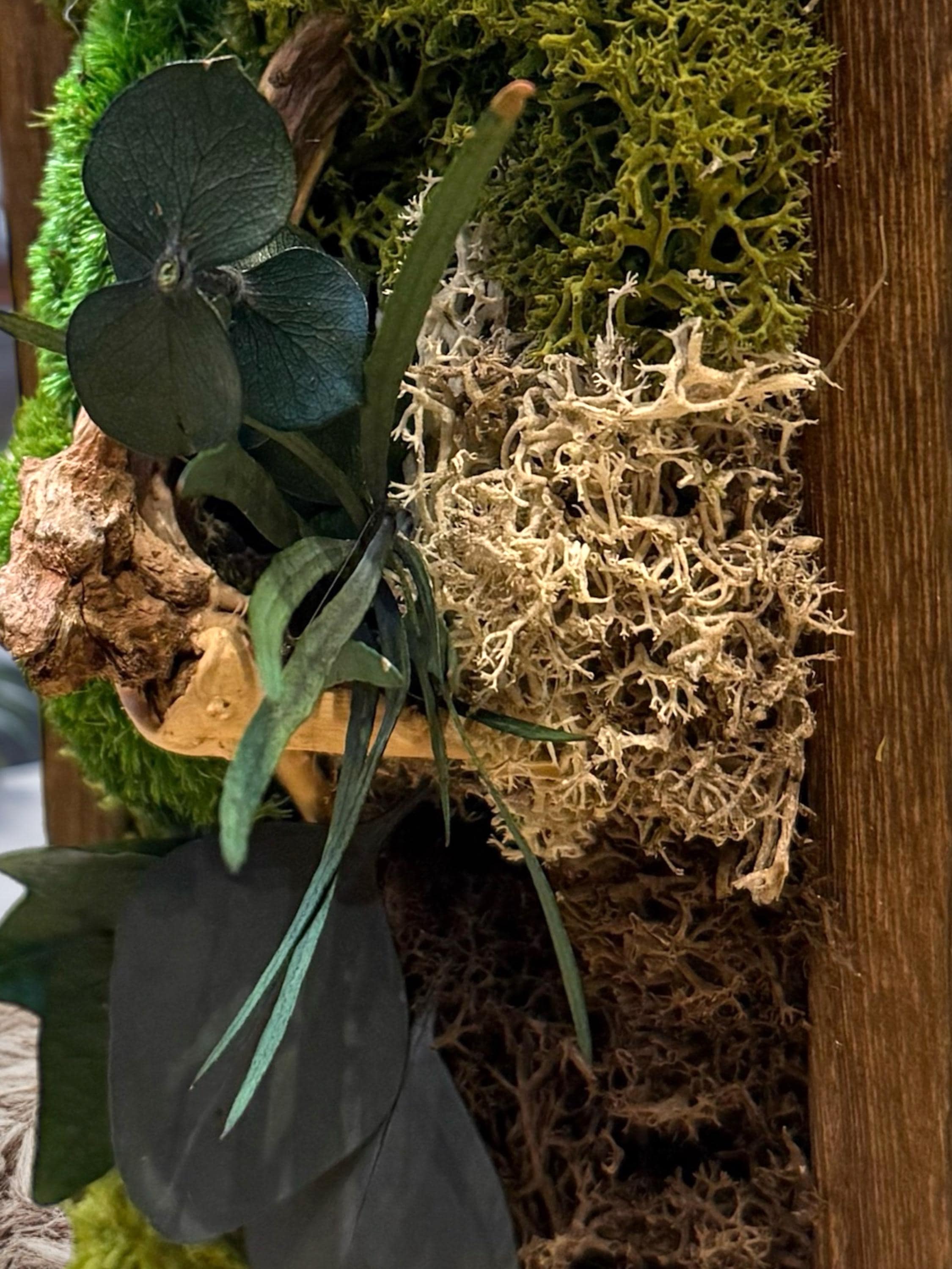 mousses naturelles, feuillages stabilisés et éléments boisés, harmonieusement intégrés dans un cadre en bois brut au caractère authentique.