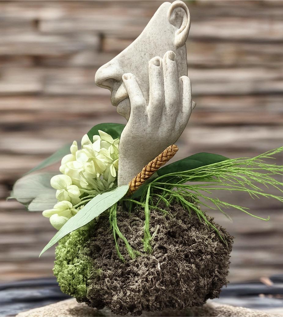 Le visage, aux lignes épurées et modernes, semble émerger d’un écrin de mousses et feuillages stabilisés, évoquant un lien fort entre l’humain et la nature. Chaque détail est pensé pour apporter équilibre, profondeur et sérénité.