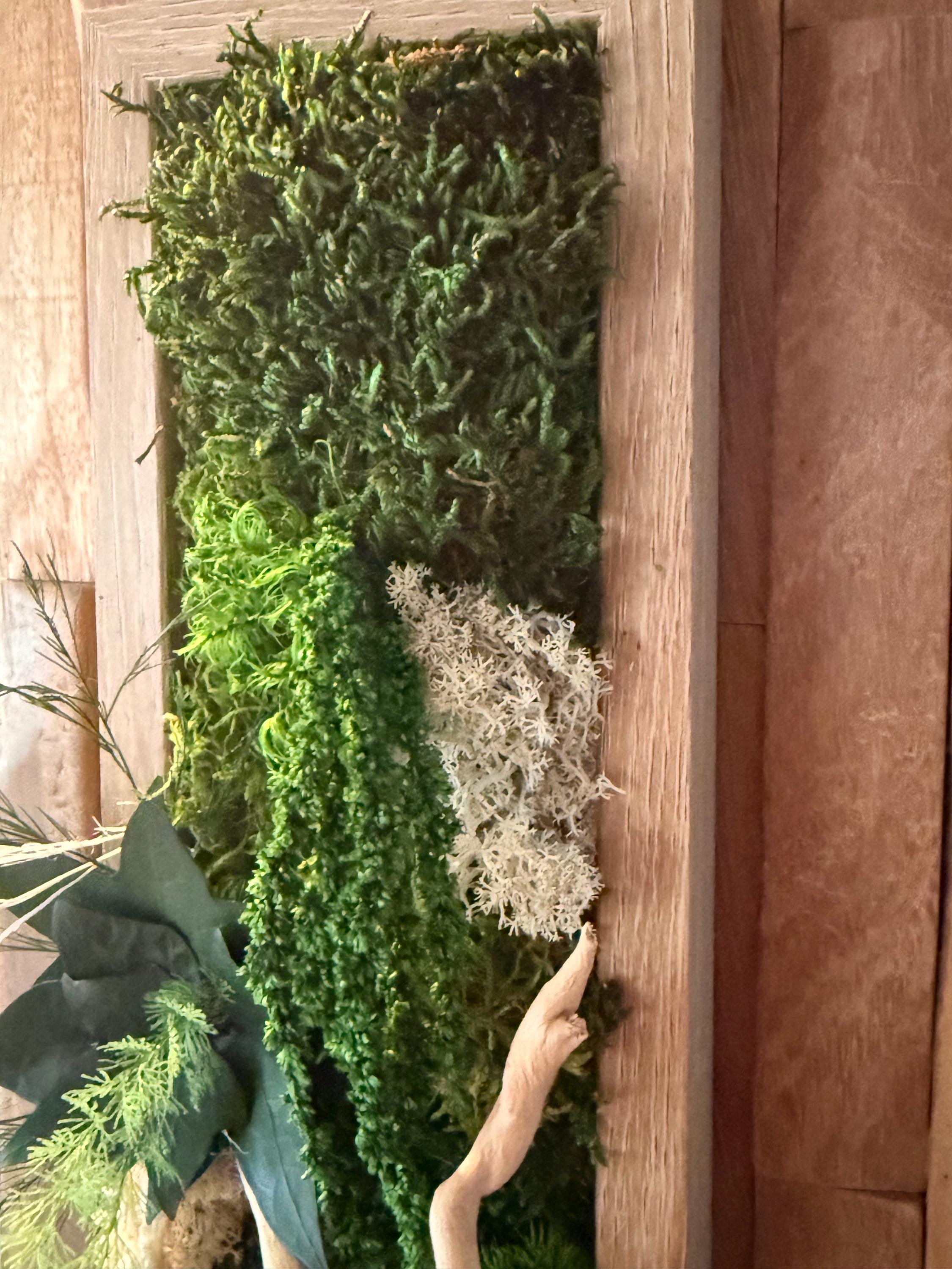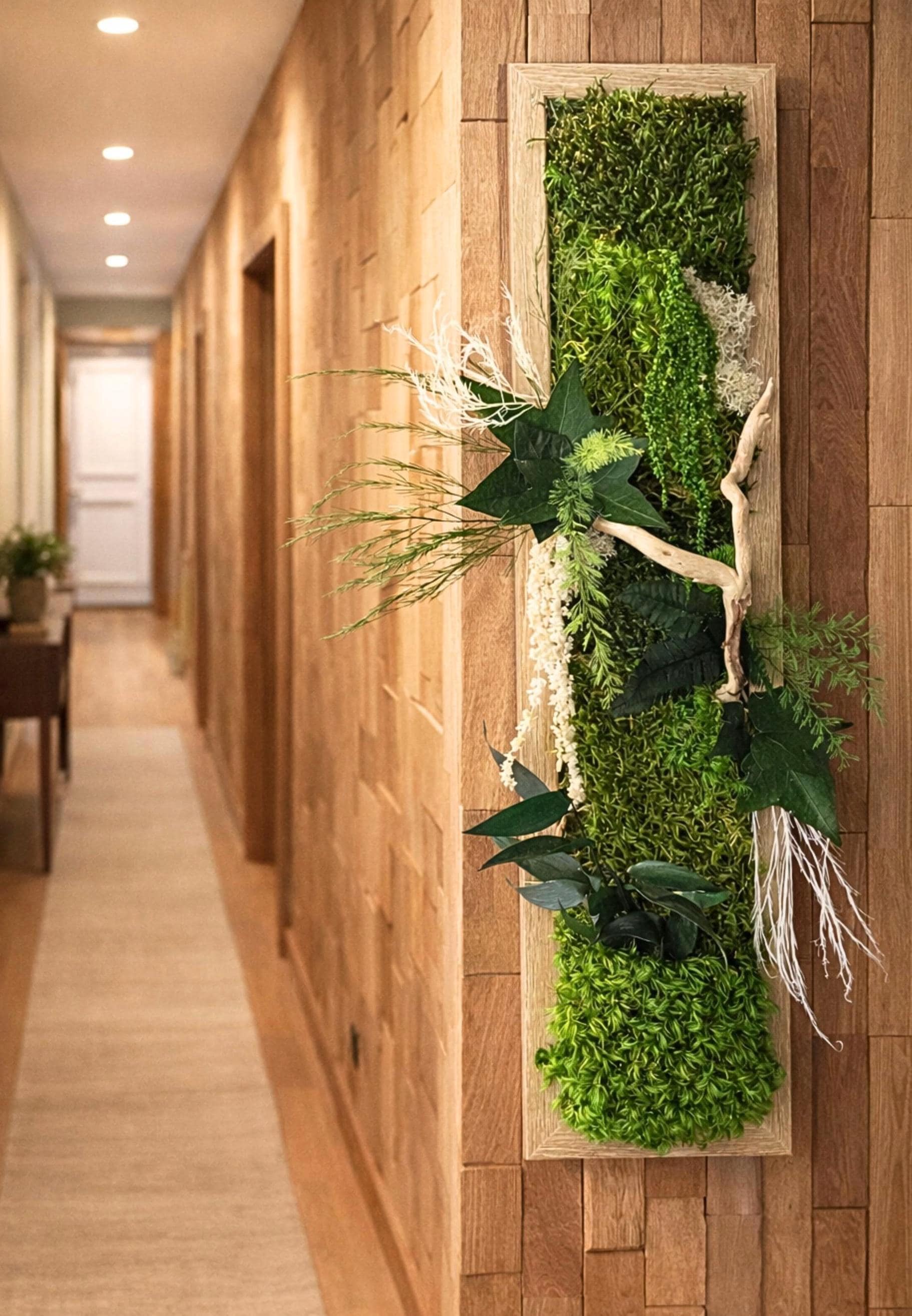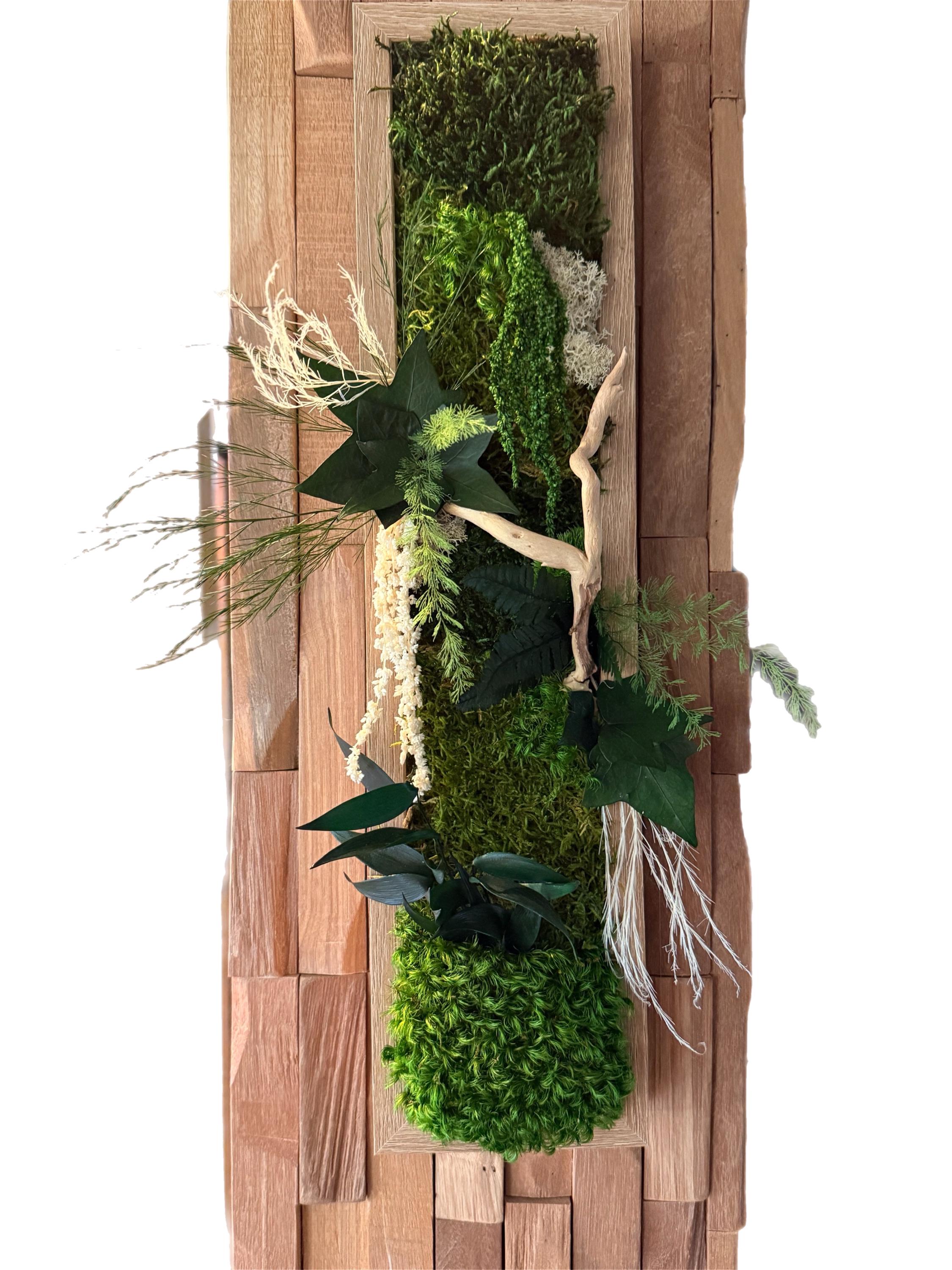 Apportez une touche de nature et de relief à votre intérieur avec ce cadre végétal vertical étroit, conçu à partir de végétaux stabilisés soigneusement assemblés.