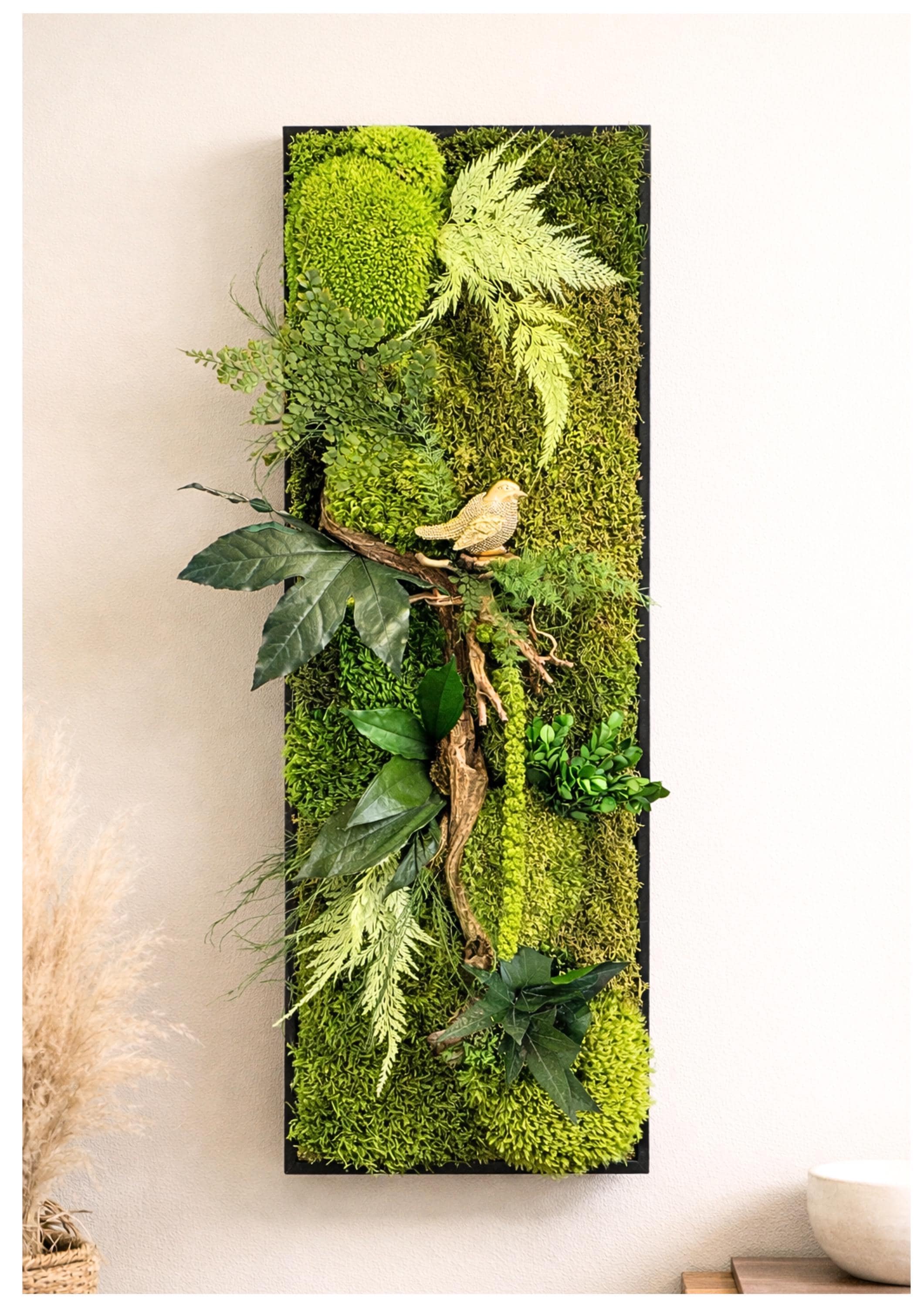 Apportez un morceau de nature dans votre intérieur avec ce cadre végétal stabilisé vertical de 76 x 26 cm, composé de mousses naturelles, feuillages texturés et d’une branche en bois accueillant un petit oiseau décoratif.