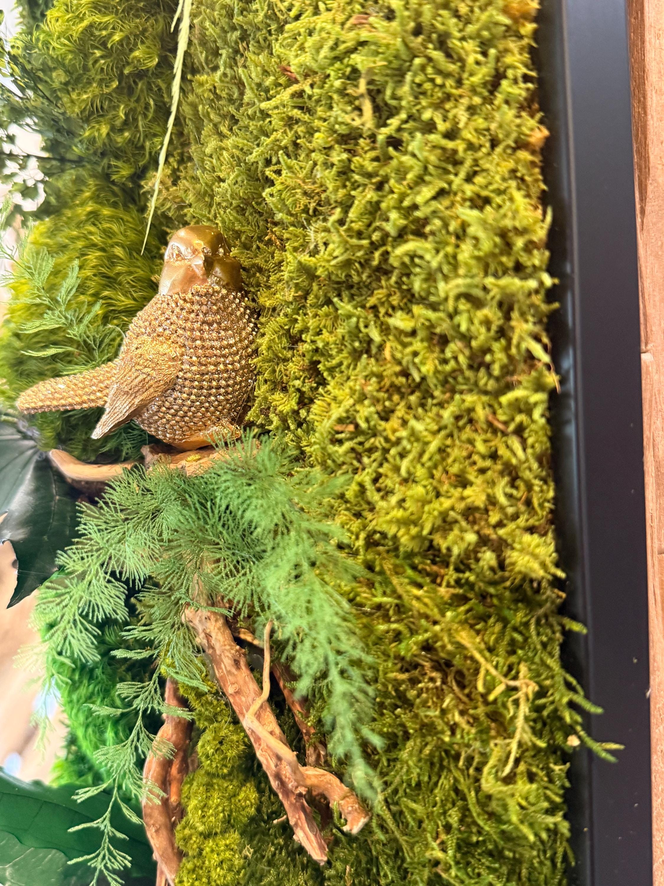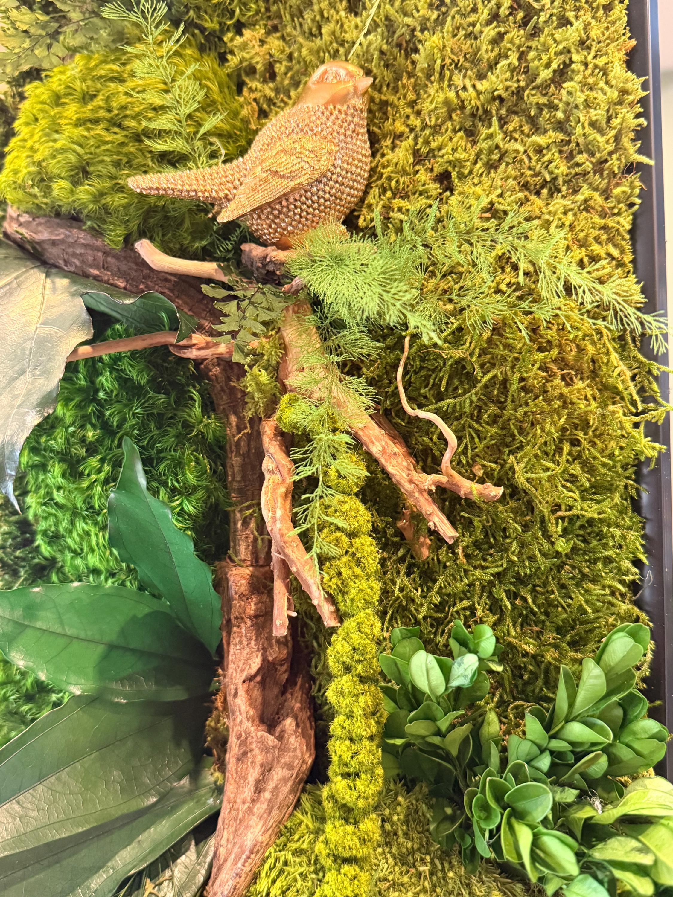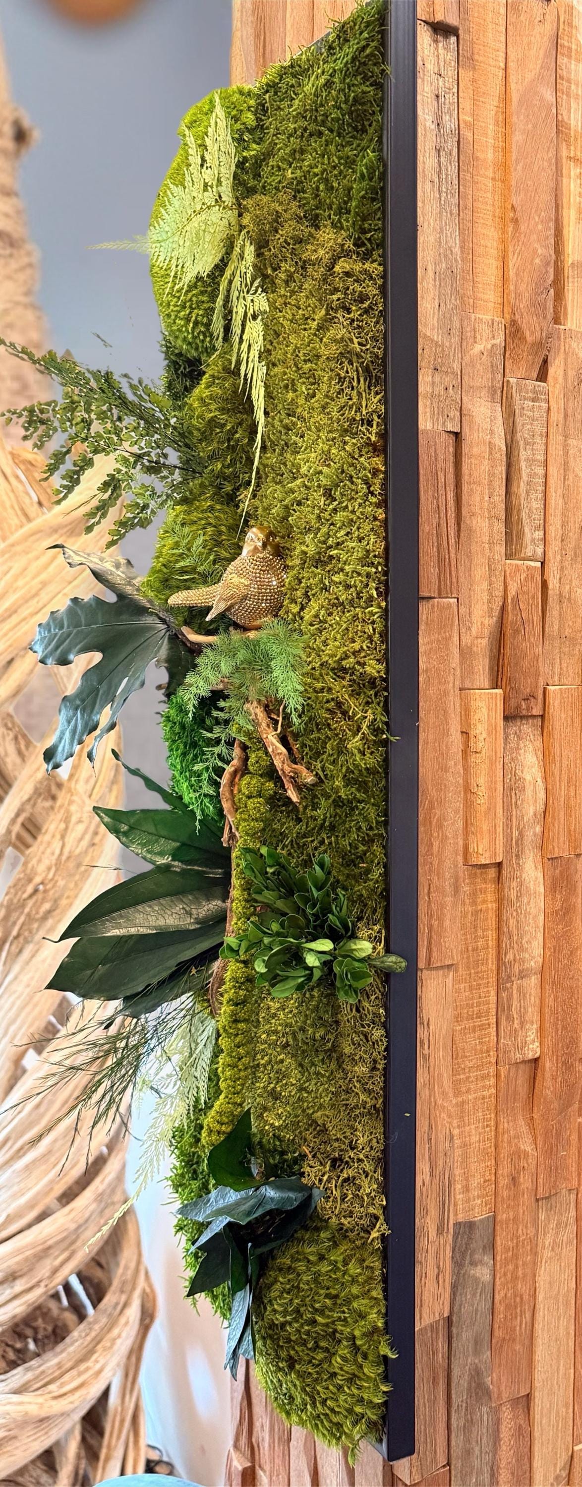 Ce tableau végétal a été imaginé comme une scène naturelle immersive, où les mousses forment un paysage végétal dense et apaisant.