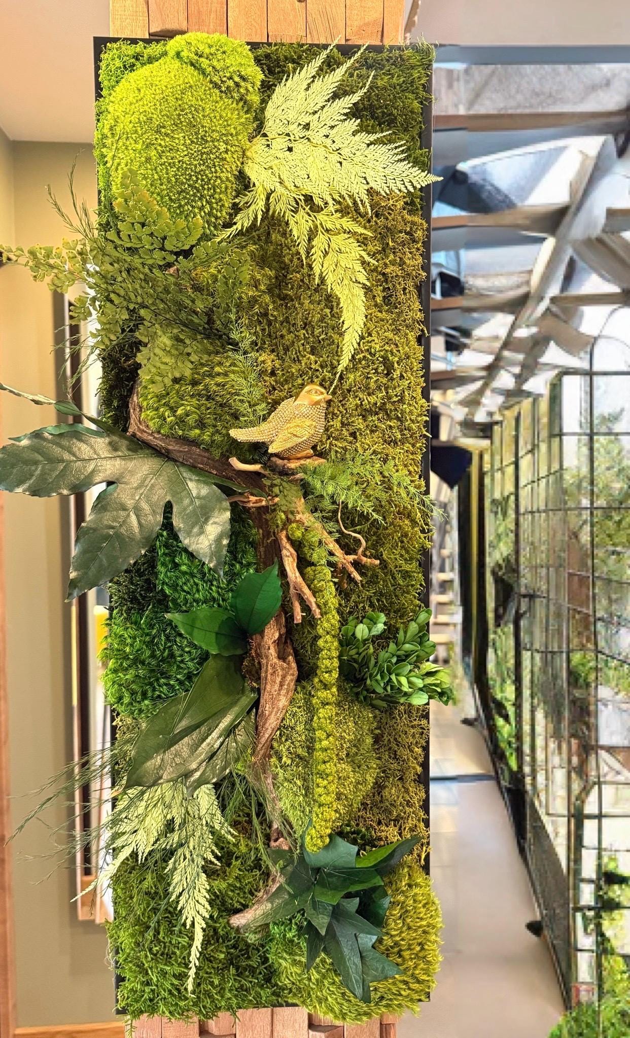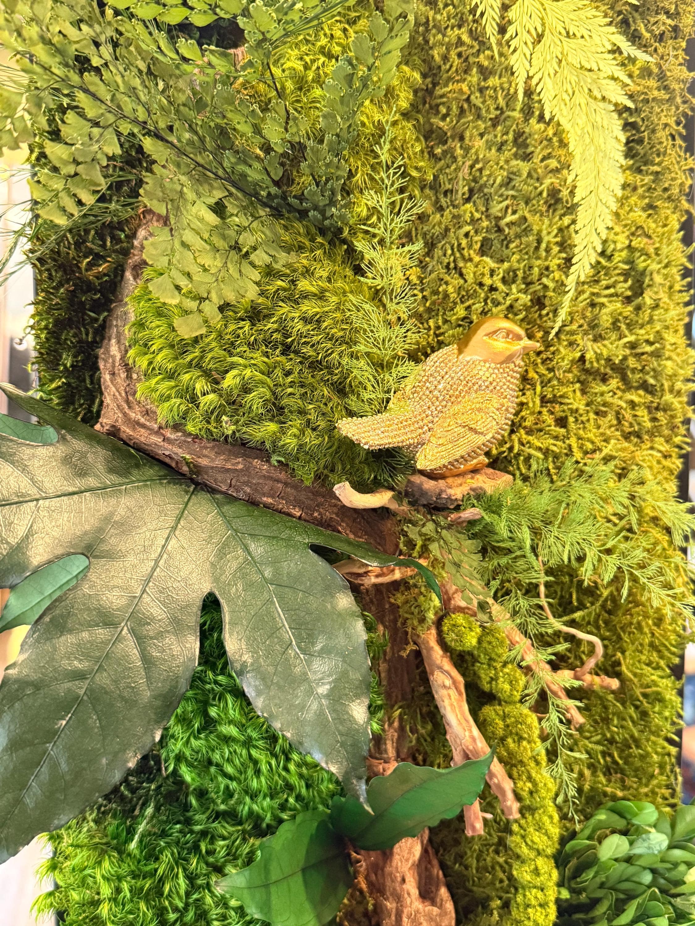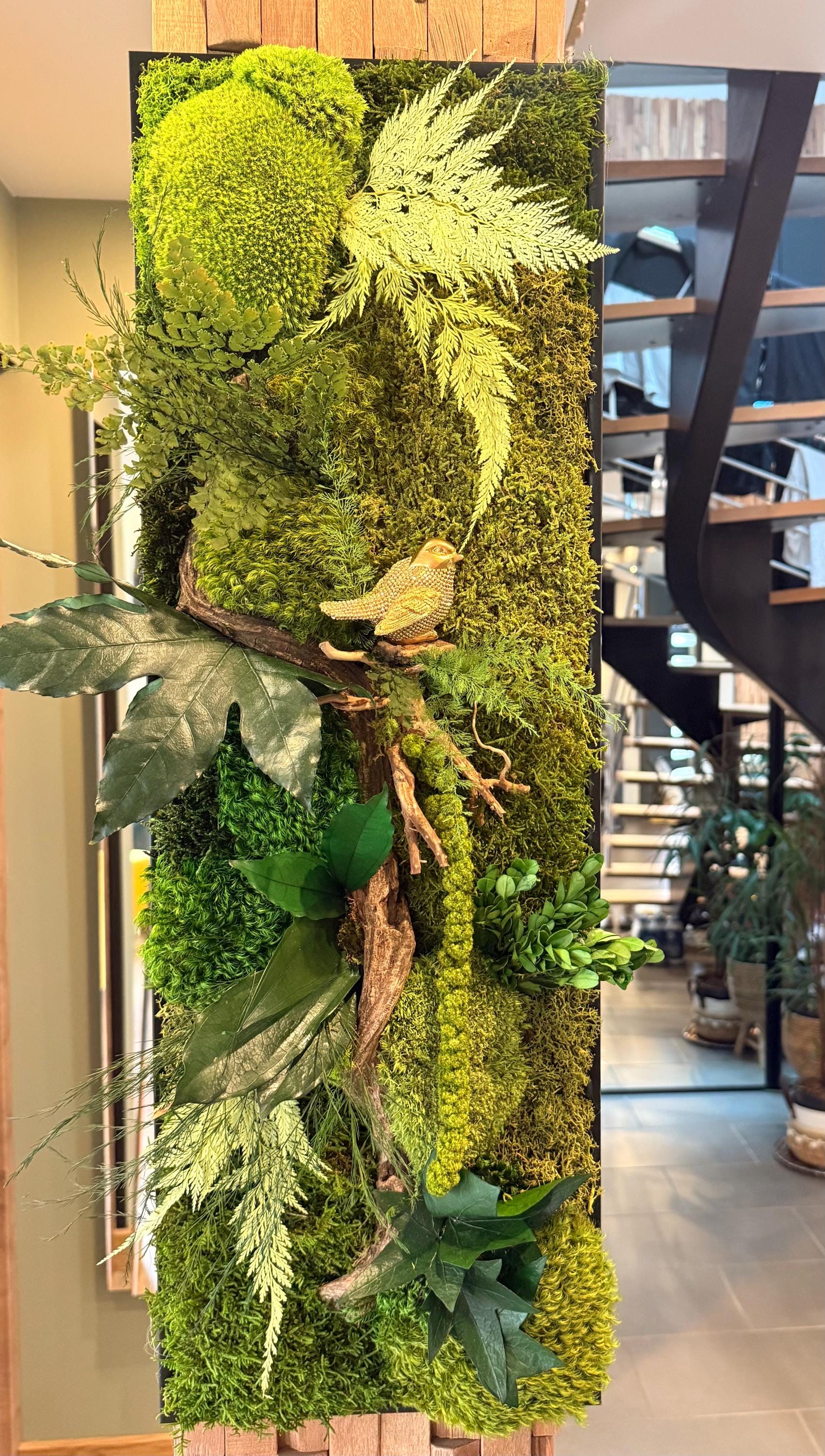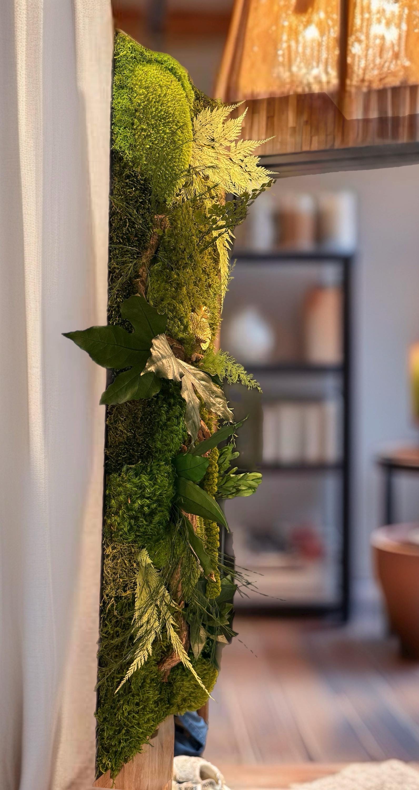 Ce tableau végétal a été imaginé comme une scène naturelle immersive, où les mousses forment un paysage végétal dense et apaisant.