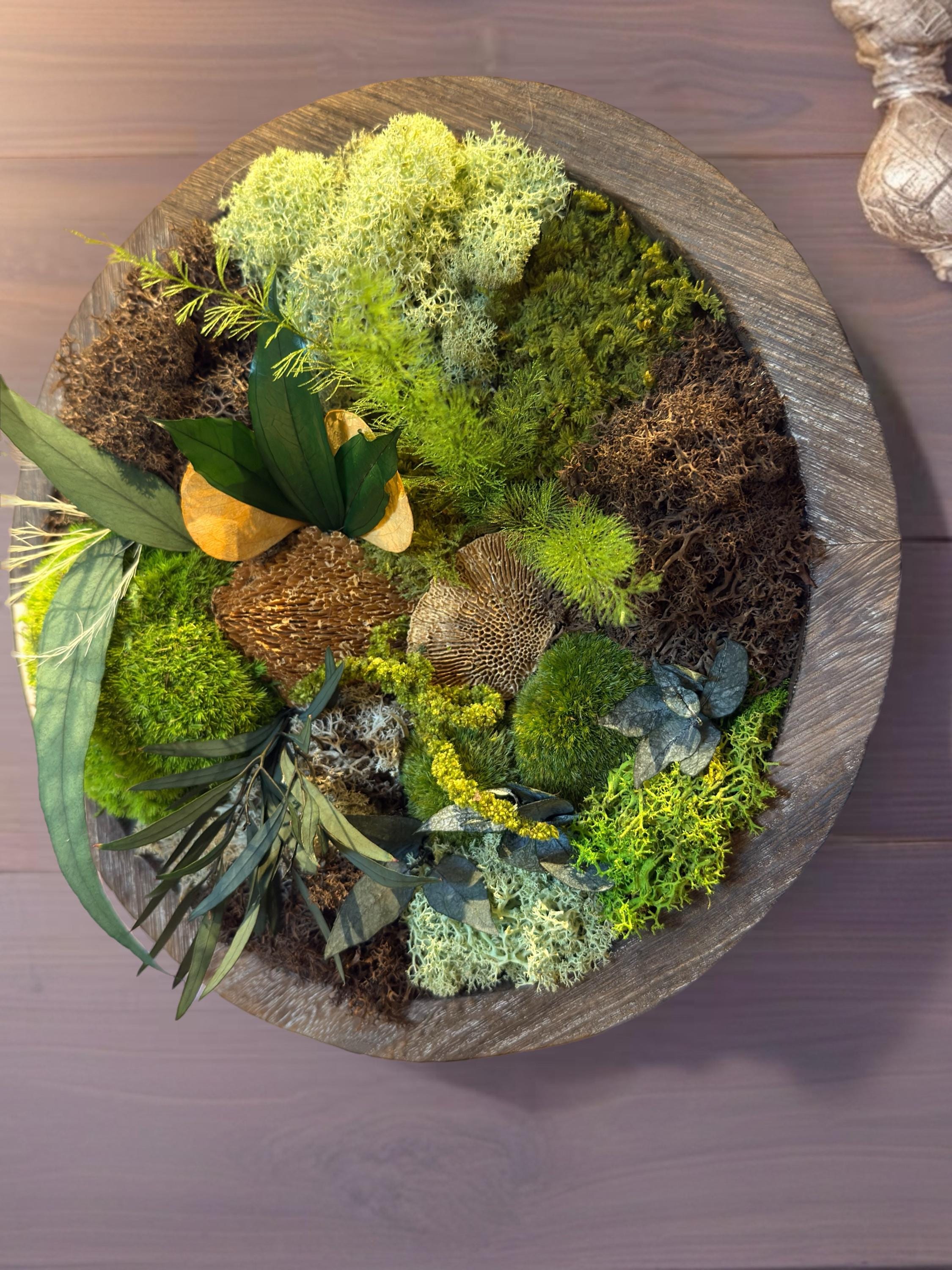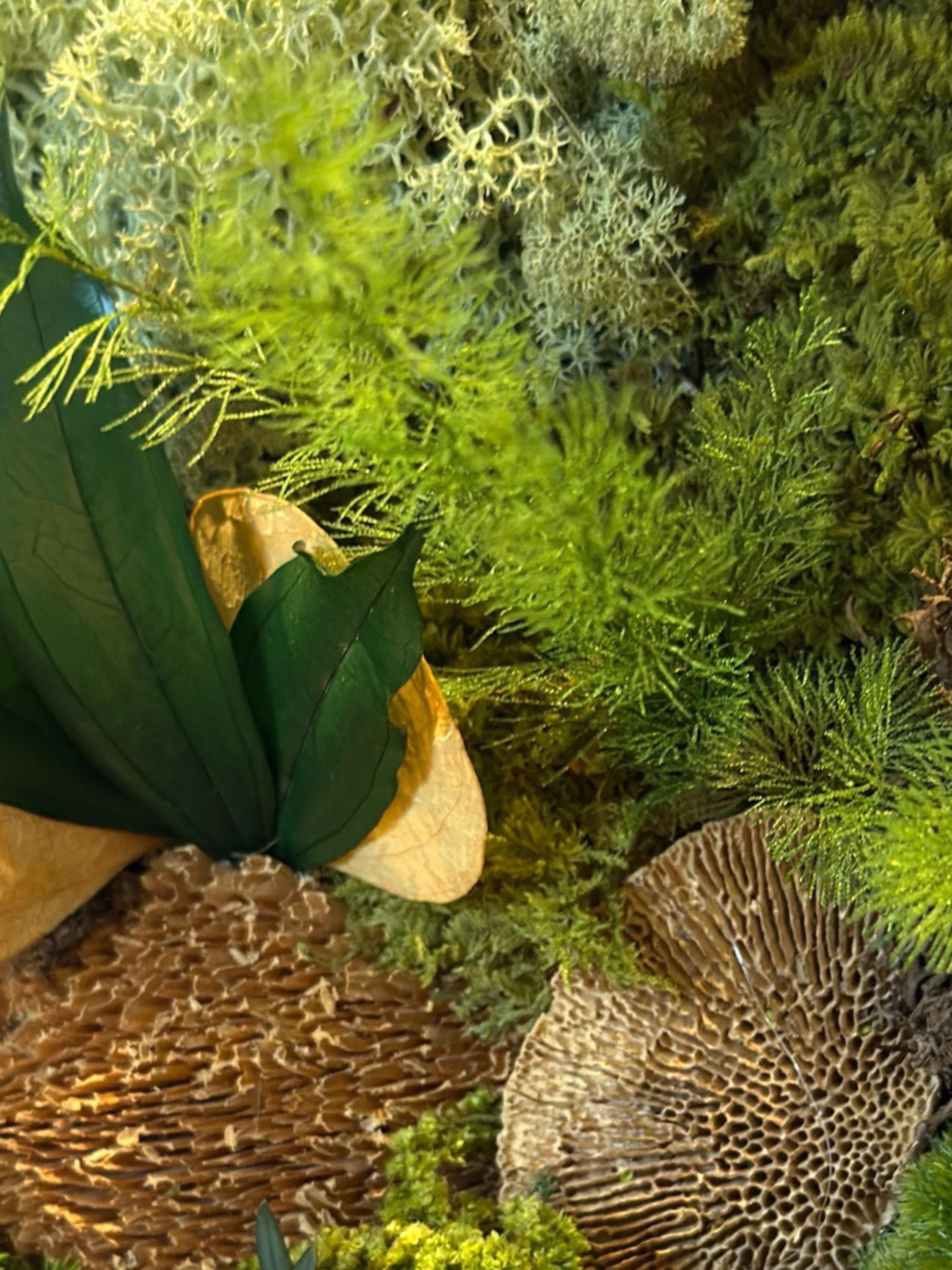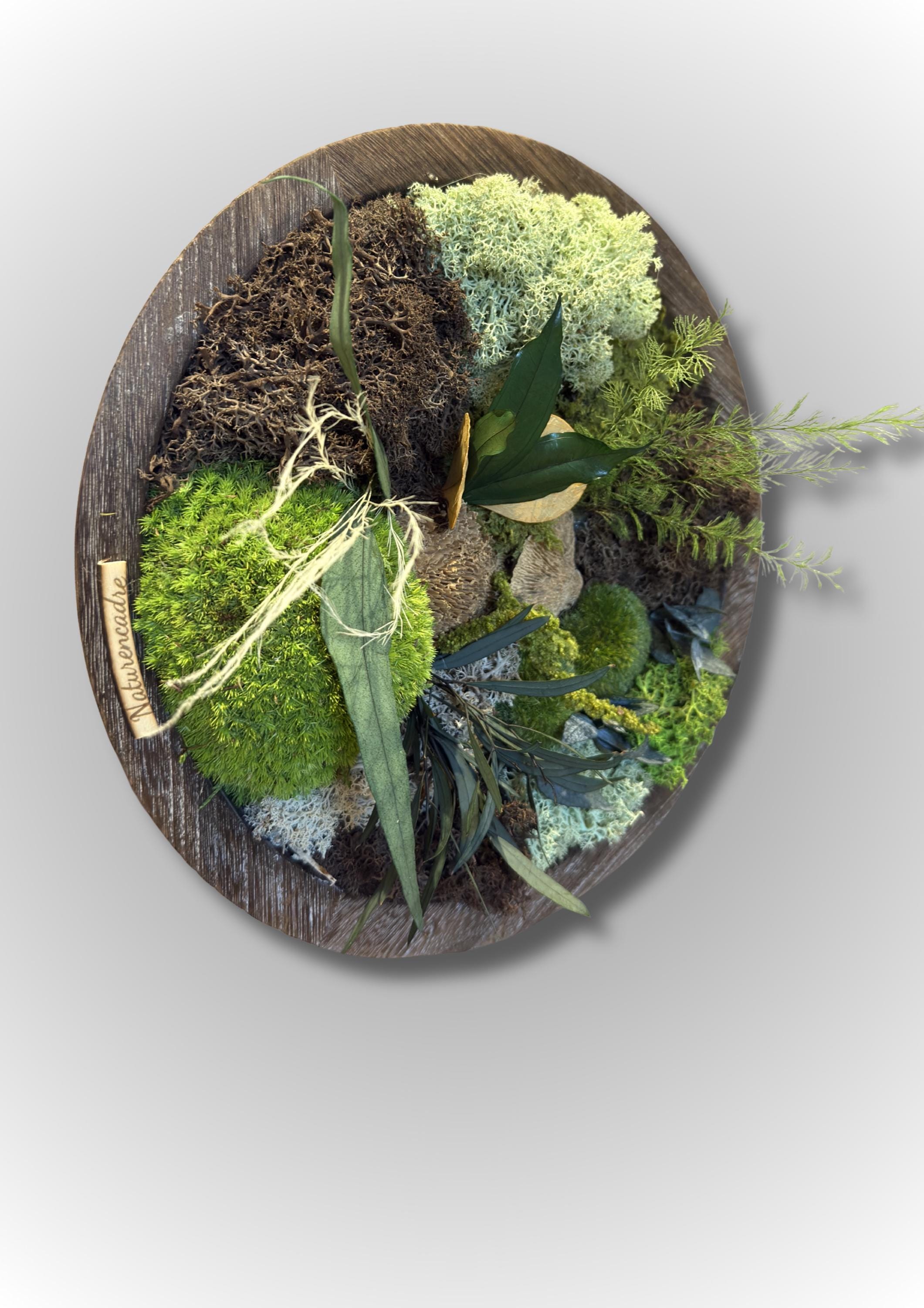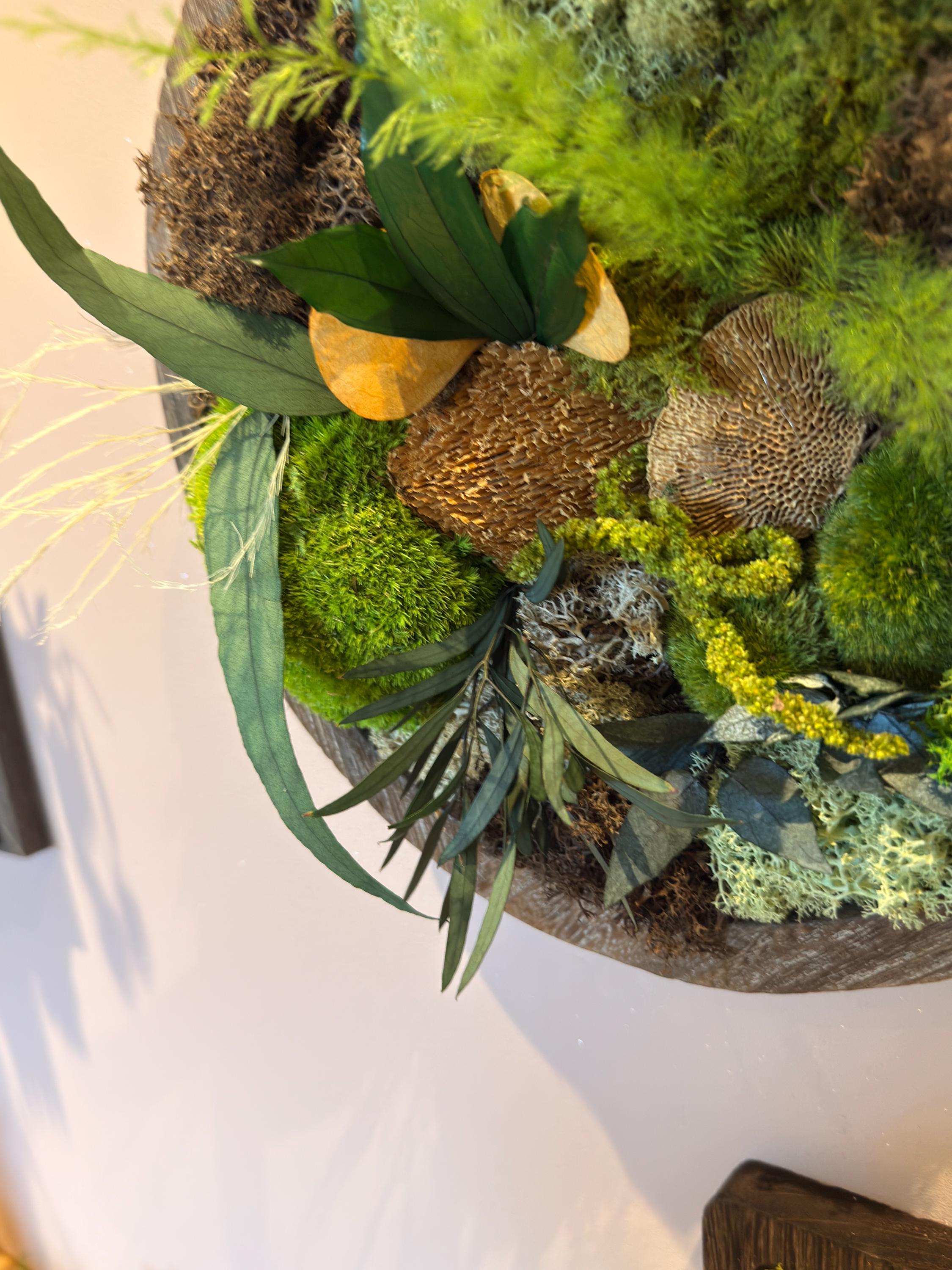 Il associe différentes variétés de mousses stabilisées, lichen et feuillages naturels, soigneusement assemblés pour créer une composition harmonieuse et vivante.