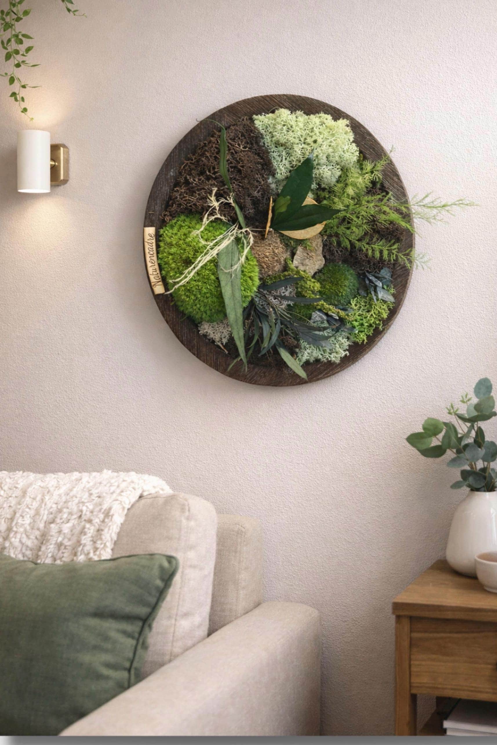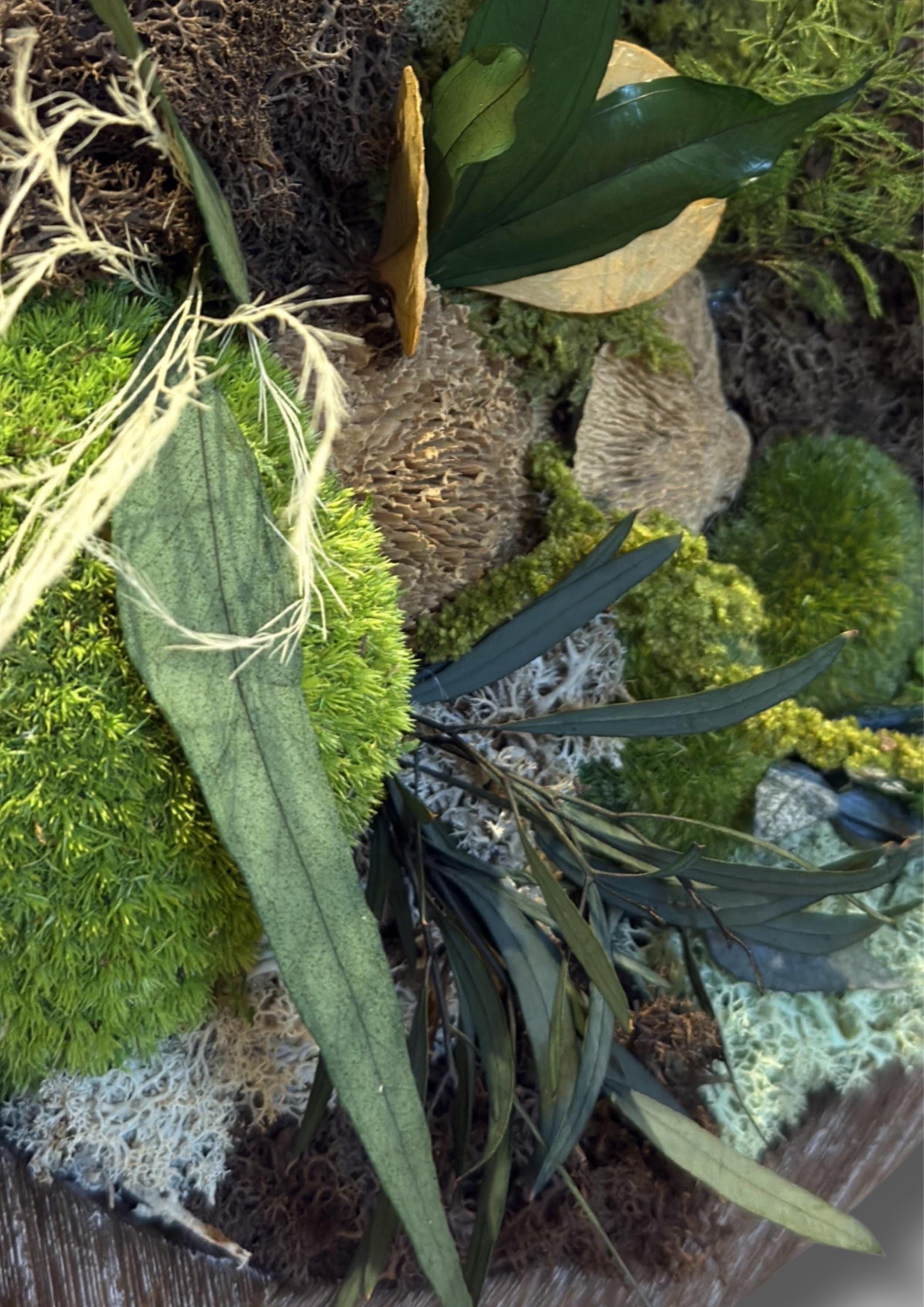 Chaque composition est unique et associe différentes textures de mousses et feuillages pour créer un relief naturel et apaisant.