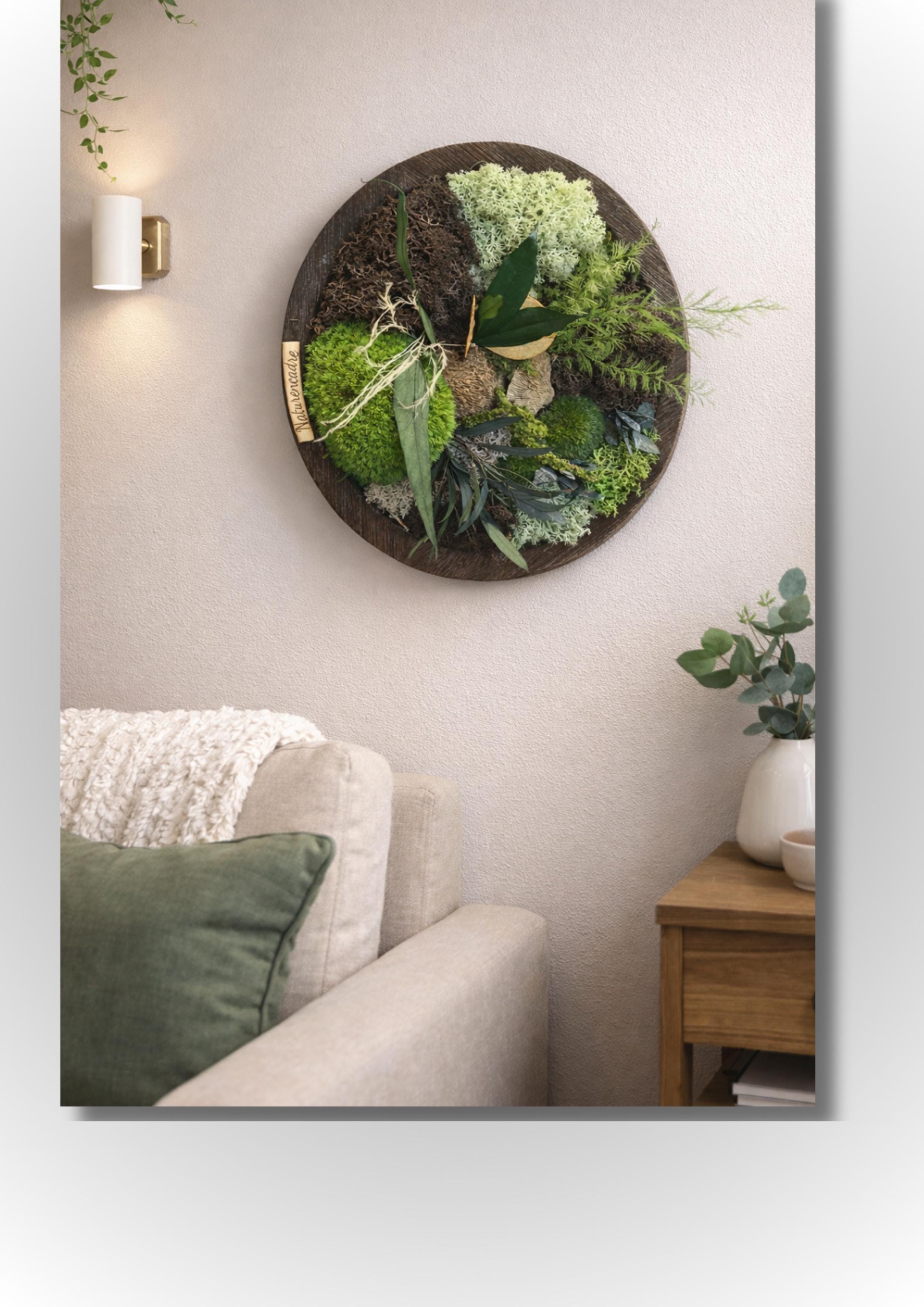Apportez une touche de nature à votre intérieur avec ce cadre végétal rond de 28 cm, entièrement réalisé à la main avec des végétaux stabilisés sans entretien.
