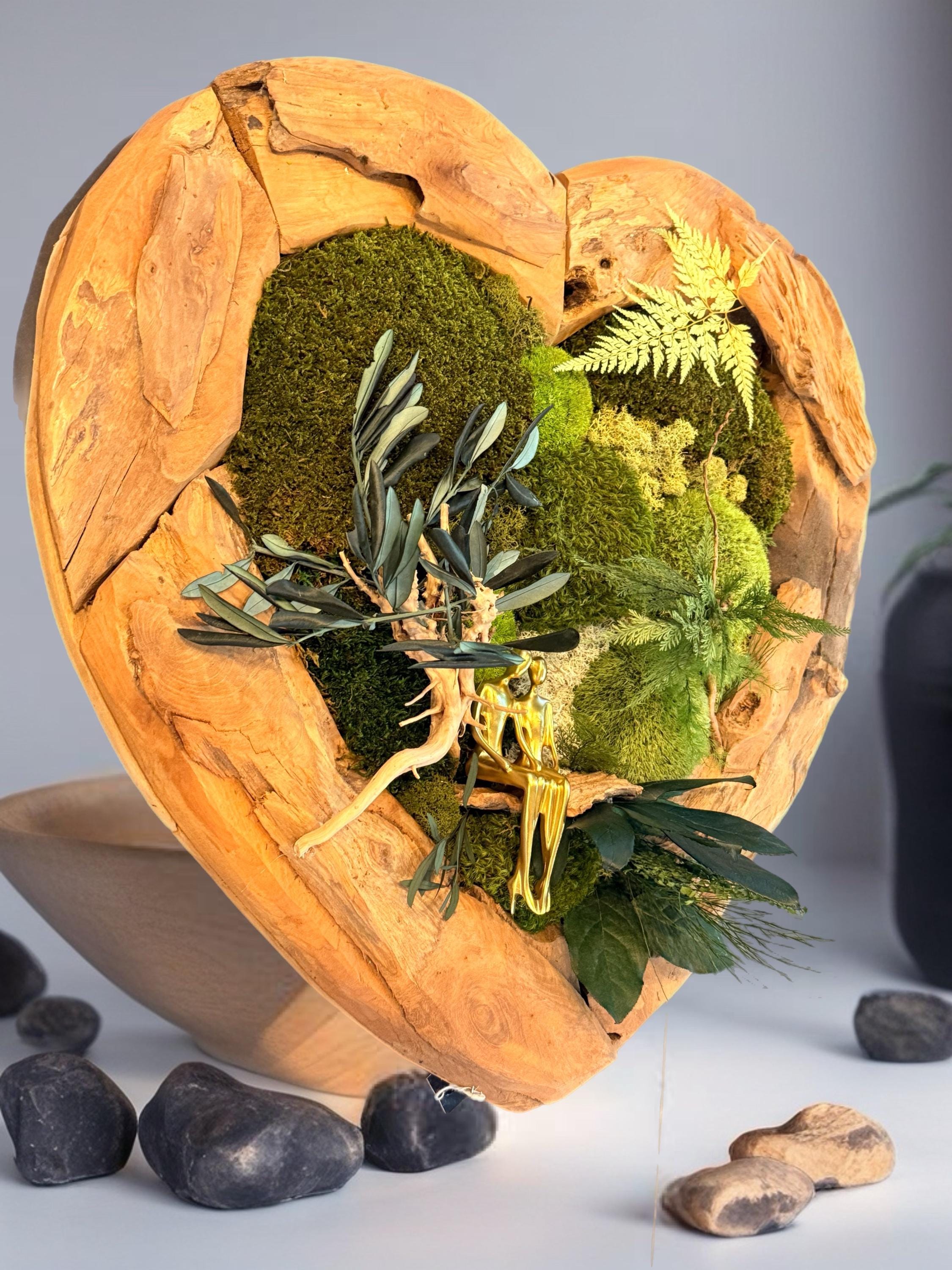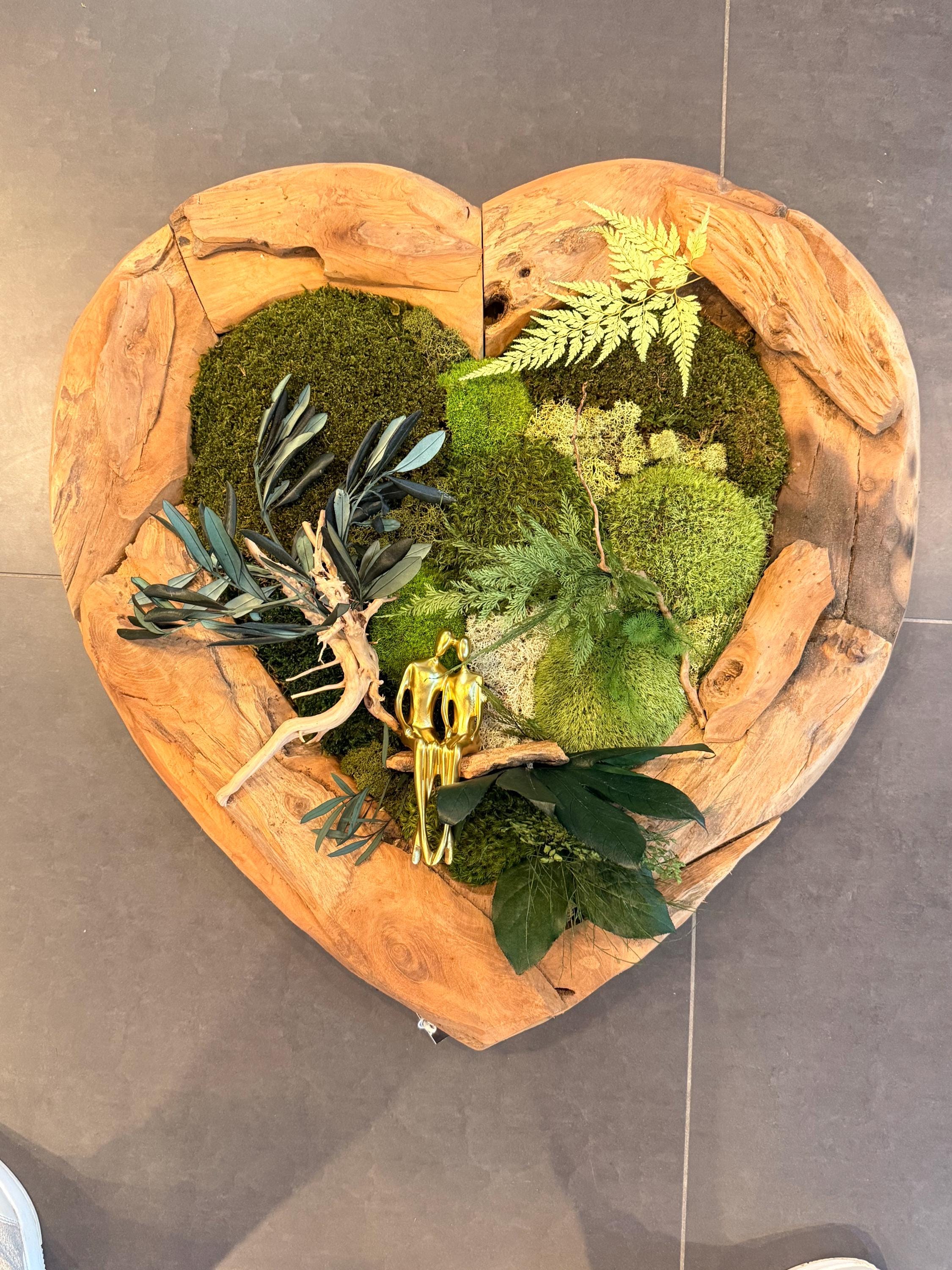 FaçonnĂ© dans un bois noble aux nuances chaleureuses, ce cĆur rĂ©vĂšle un travail artisanal authentique. Chaque courbe du teck met en valeur une composition vĂ©gĂ©tale dĂ©licate mĂȘlant mousses stabilisĂ©es, feuillages et textures naturelles pour un rendu Ă la fois vivant, apaisant et raffinĂ©.