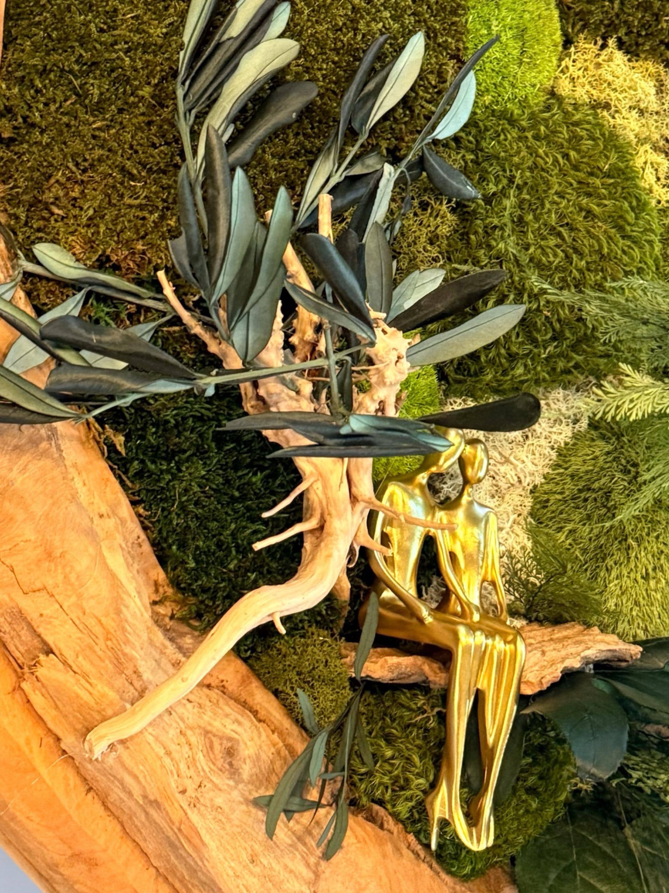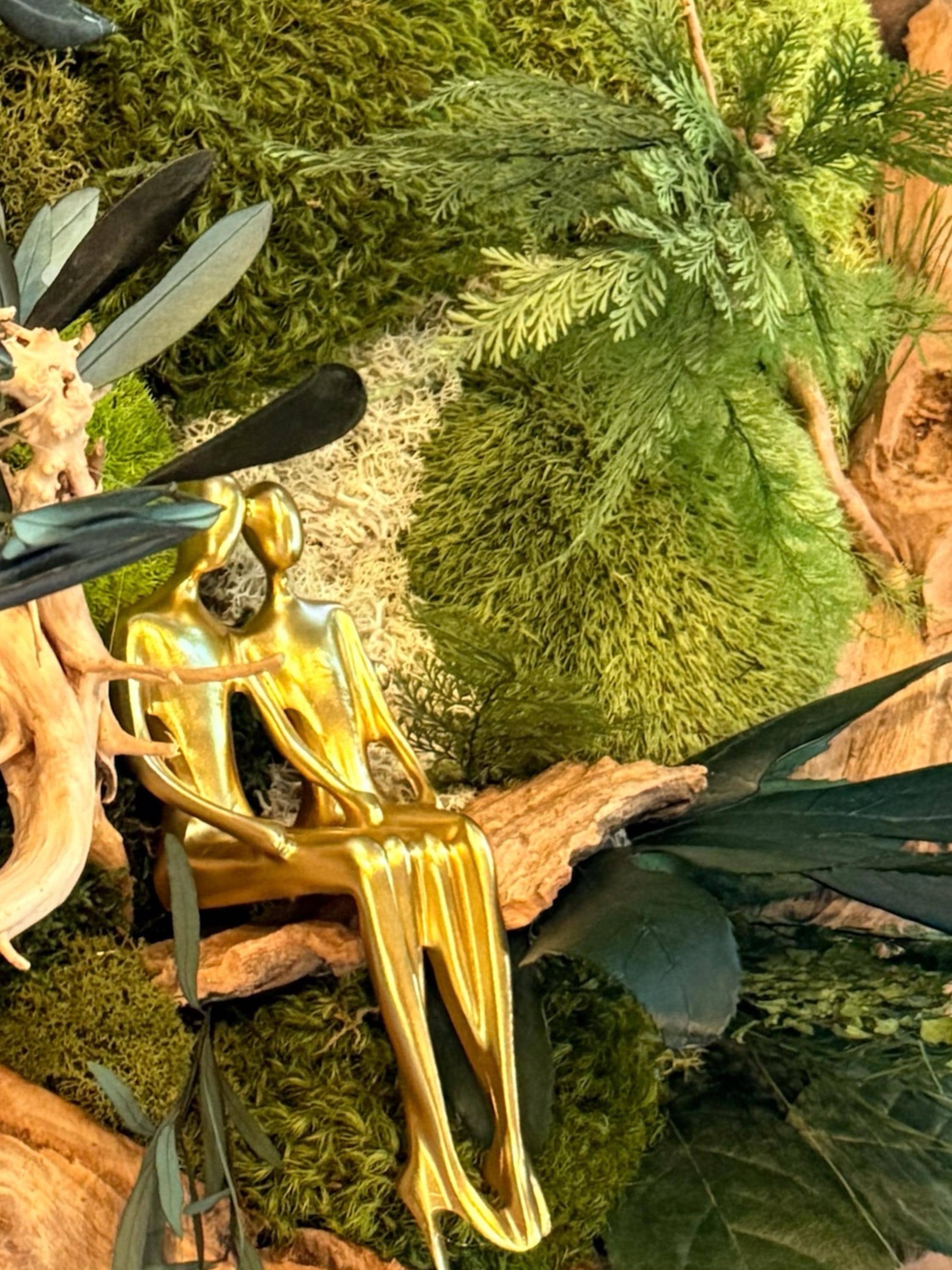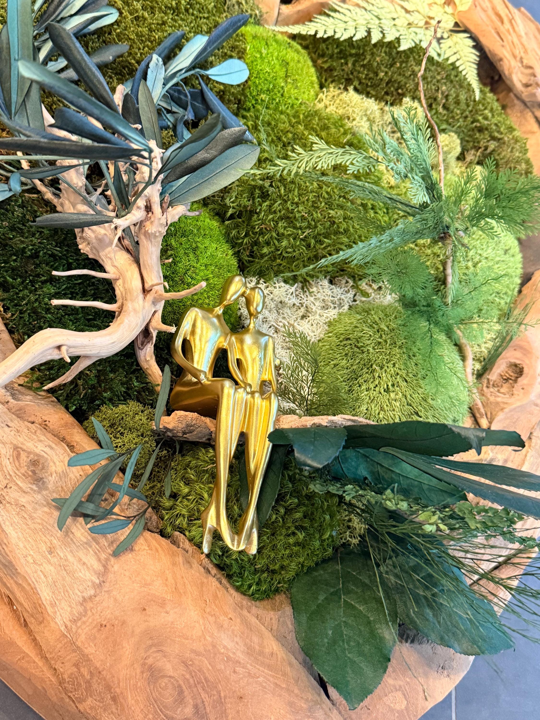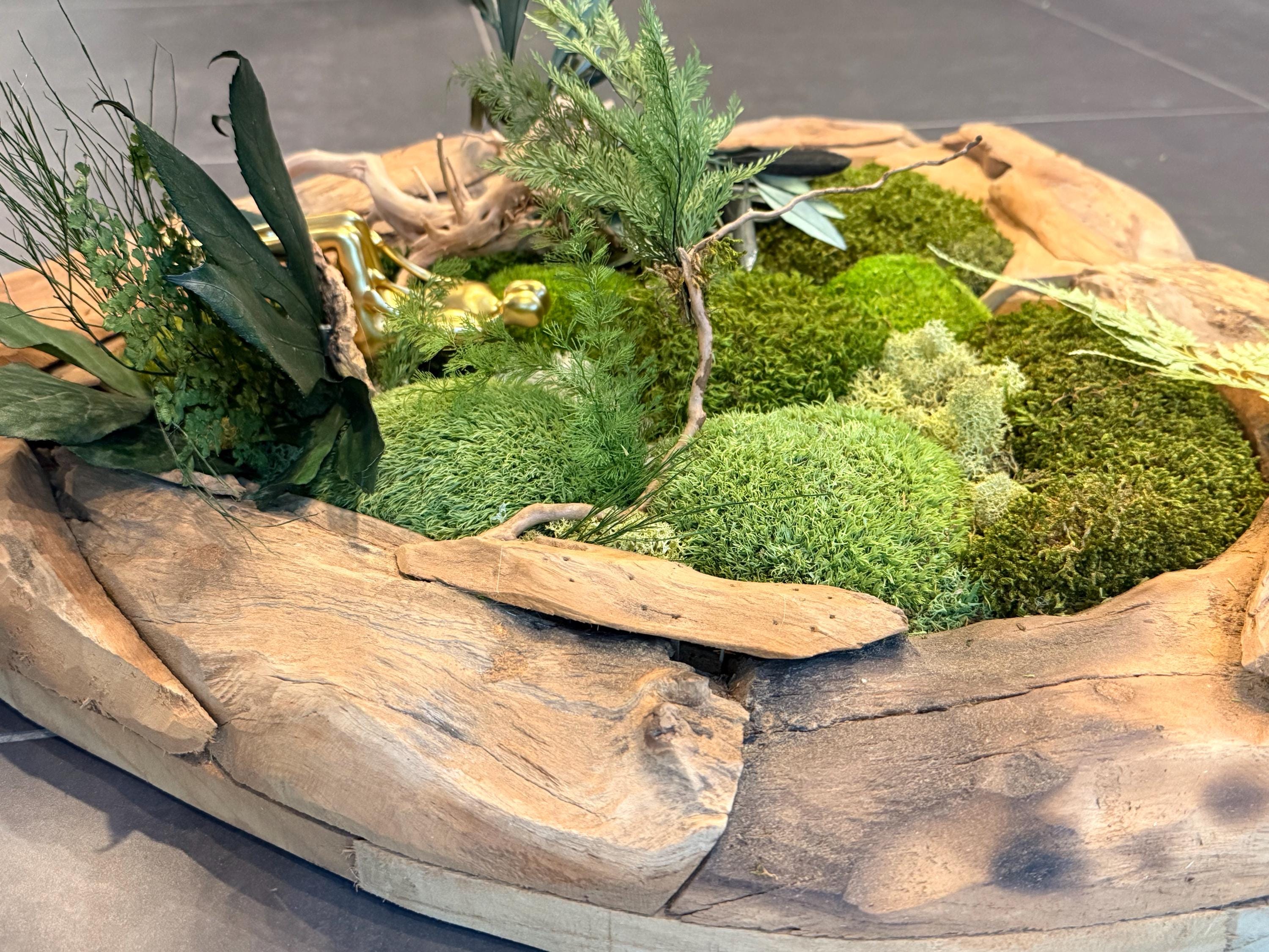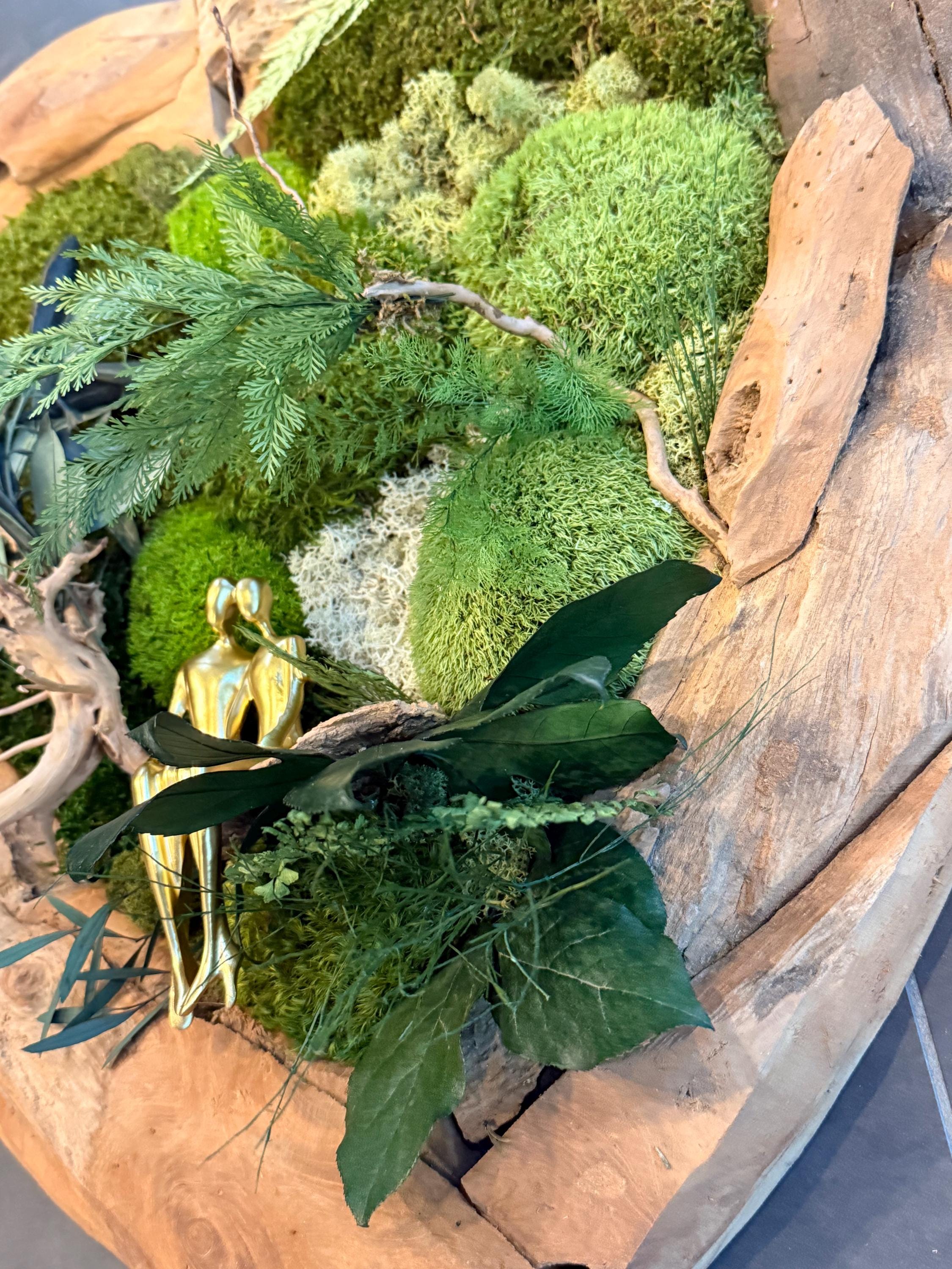Au centre, les différentes nuances de vert créent une harmonie douce, évoquant un paysage miniature. Les éléments végétaux sont soigneusement disposés pour offrir du relief, du mouvement et une véritable présence décorative.