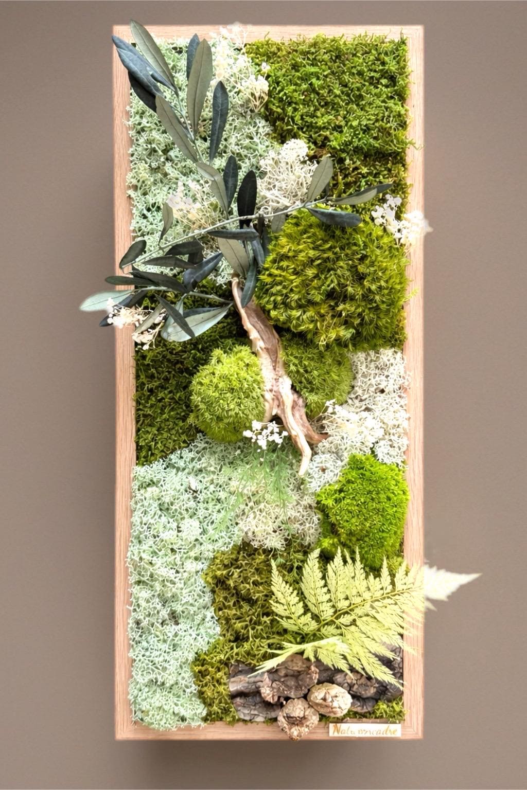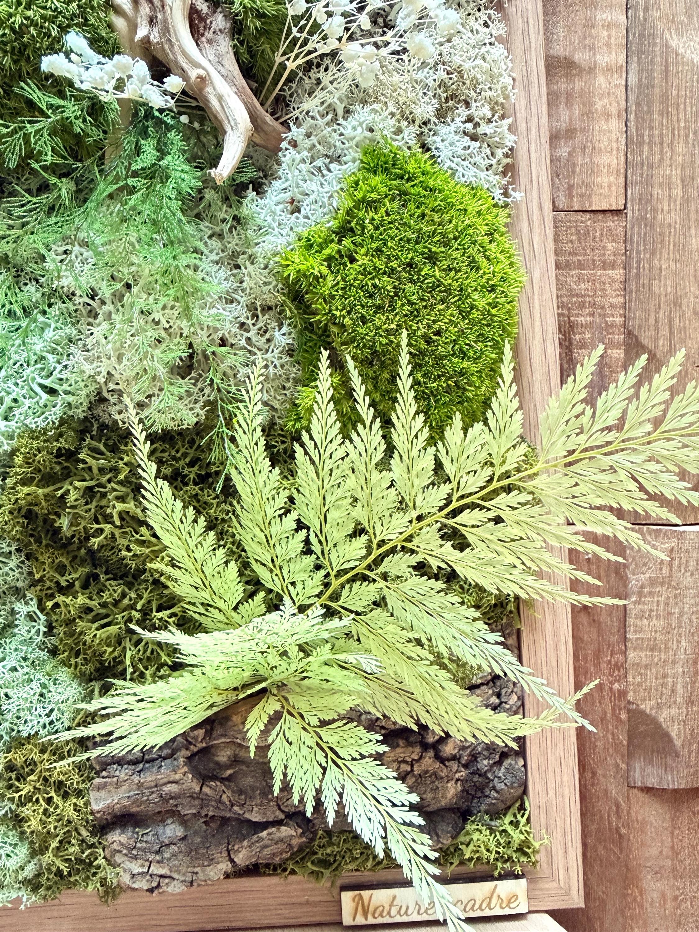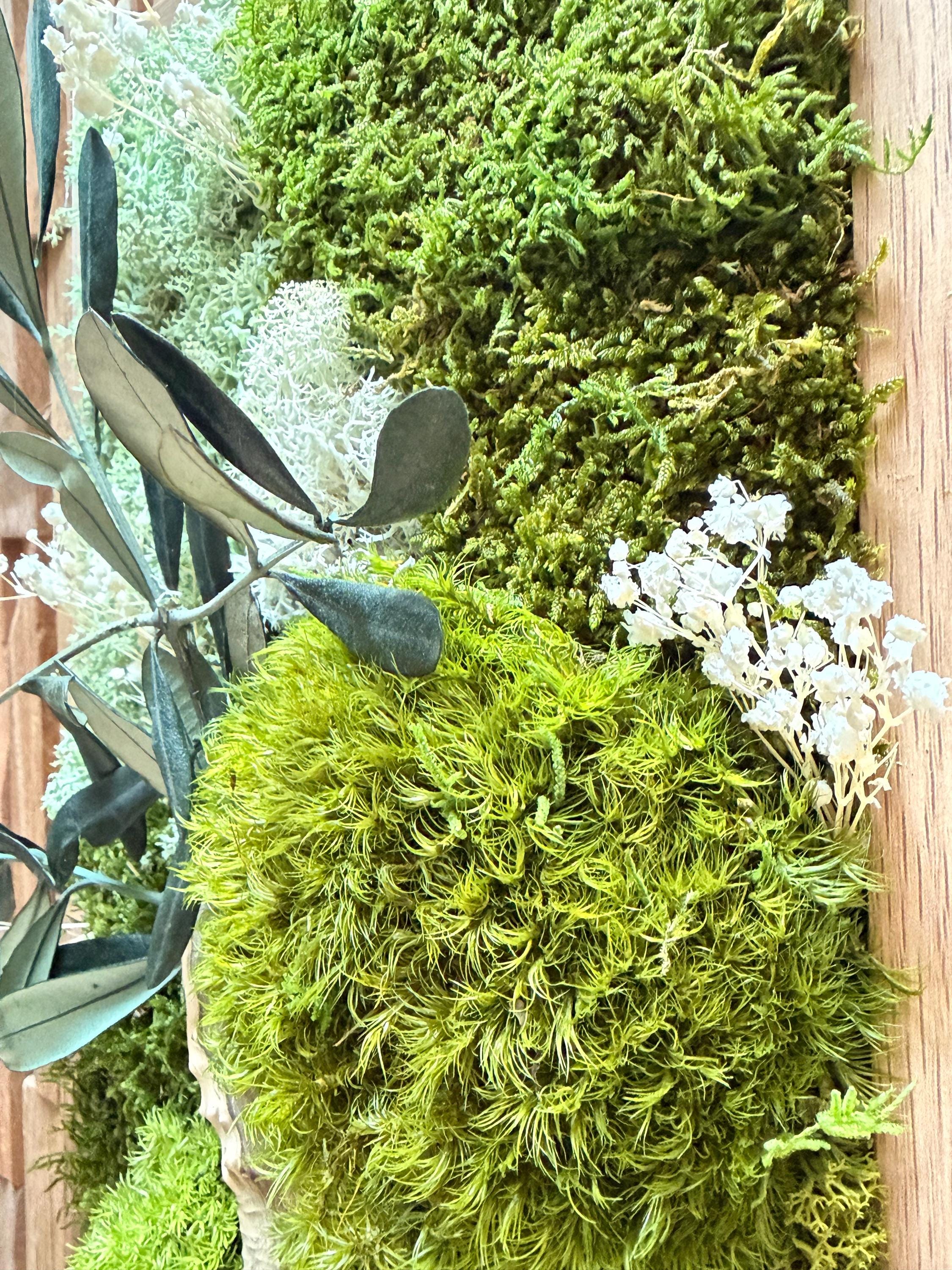 Réalisé à la main avec des végétaux naturels stabilisés, ce tableau végétal associe différentes textures de mousses, du lichen délicat, de l’eucalyptus et une pièce de bois flotté, créant une composition harmonieuse et vivante.