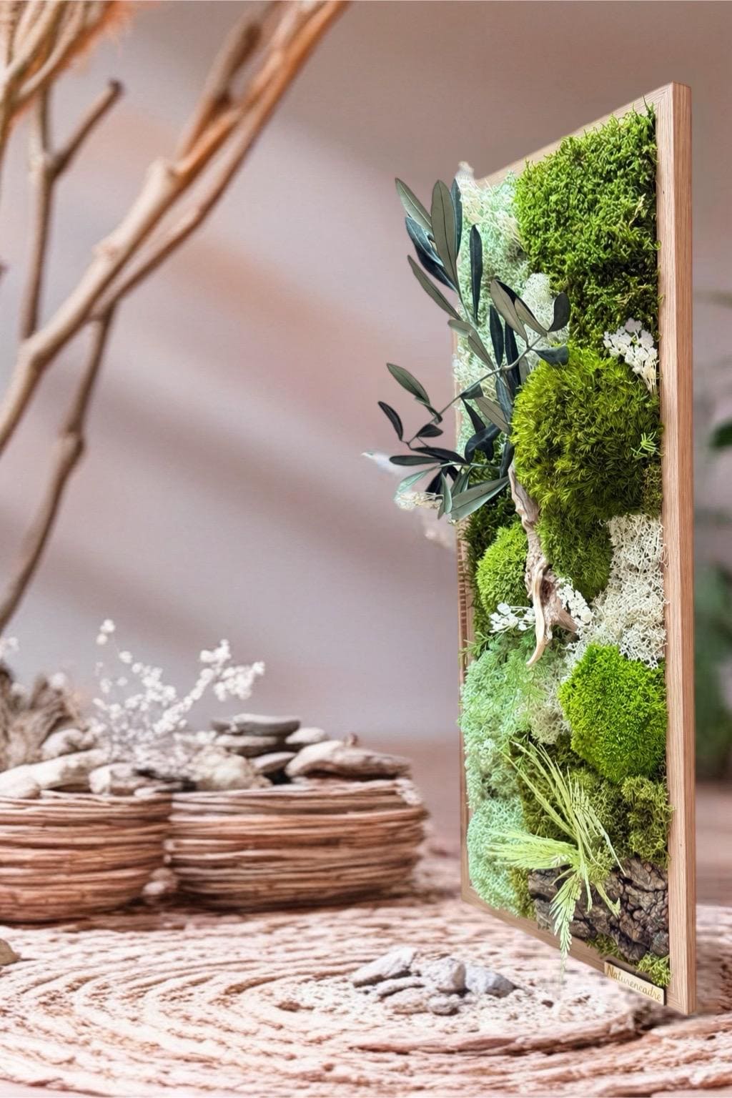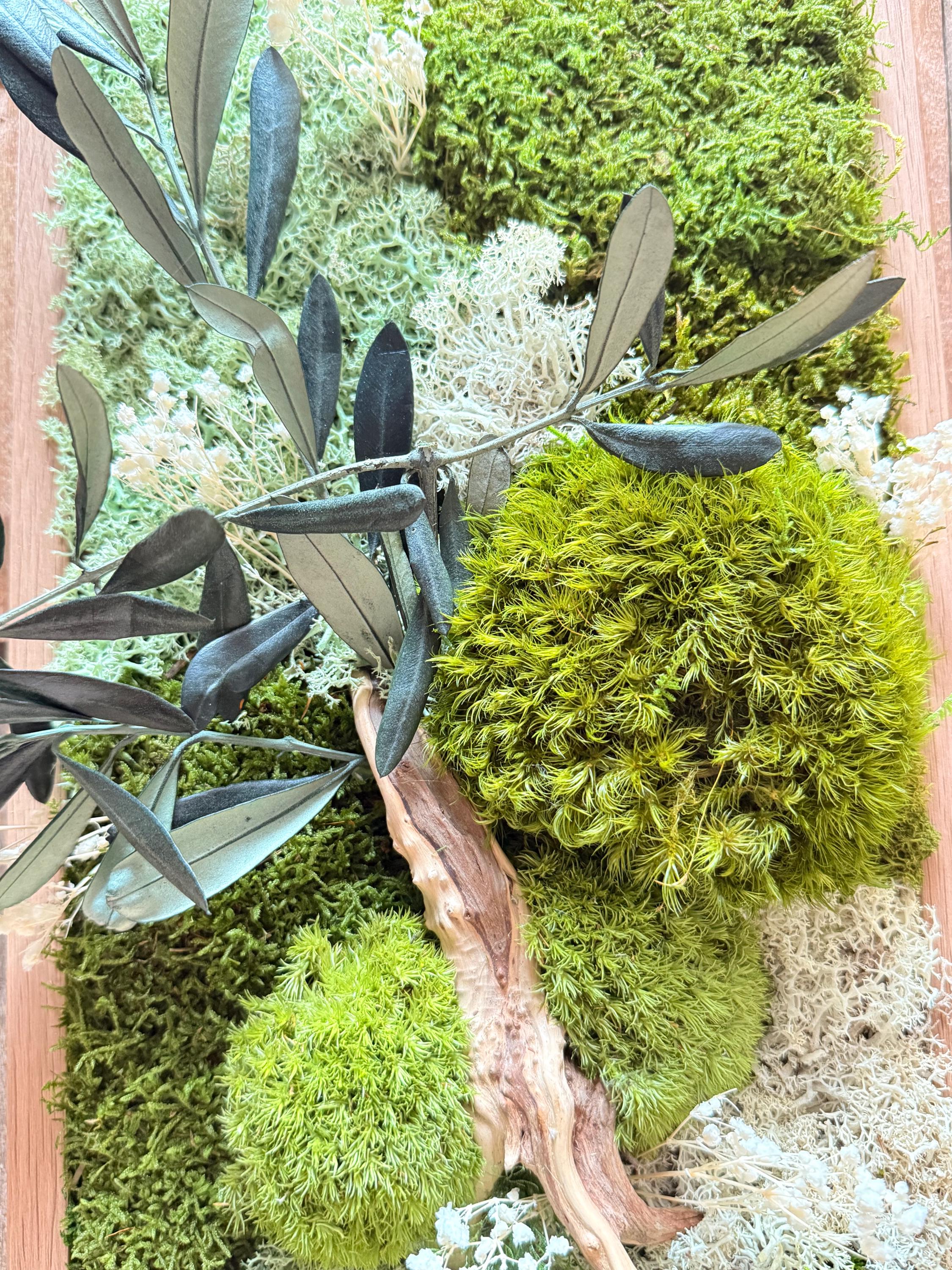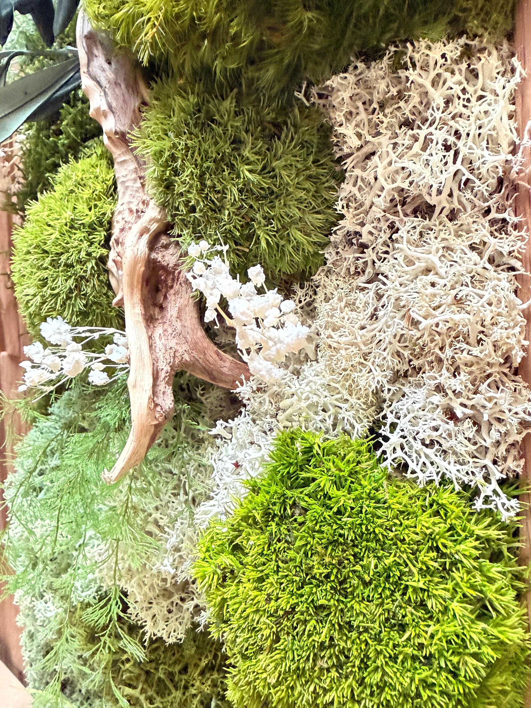 Réalisé à la main avec des végétaux naturels stabilisés, ce tableau végétal associe différentes textures de mousses, du lichen délicat, de l’eucalyptus et une pièce de bois flotté, créant une composition harmonieuse et vivante.