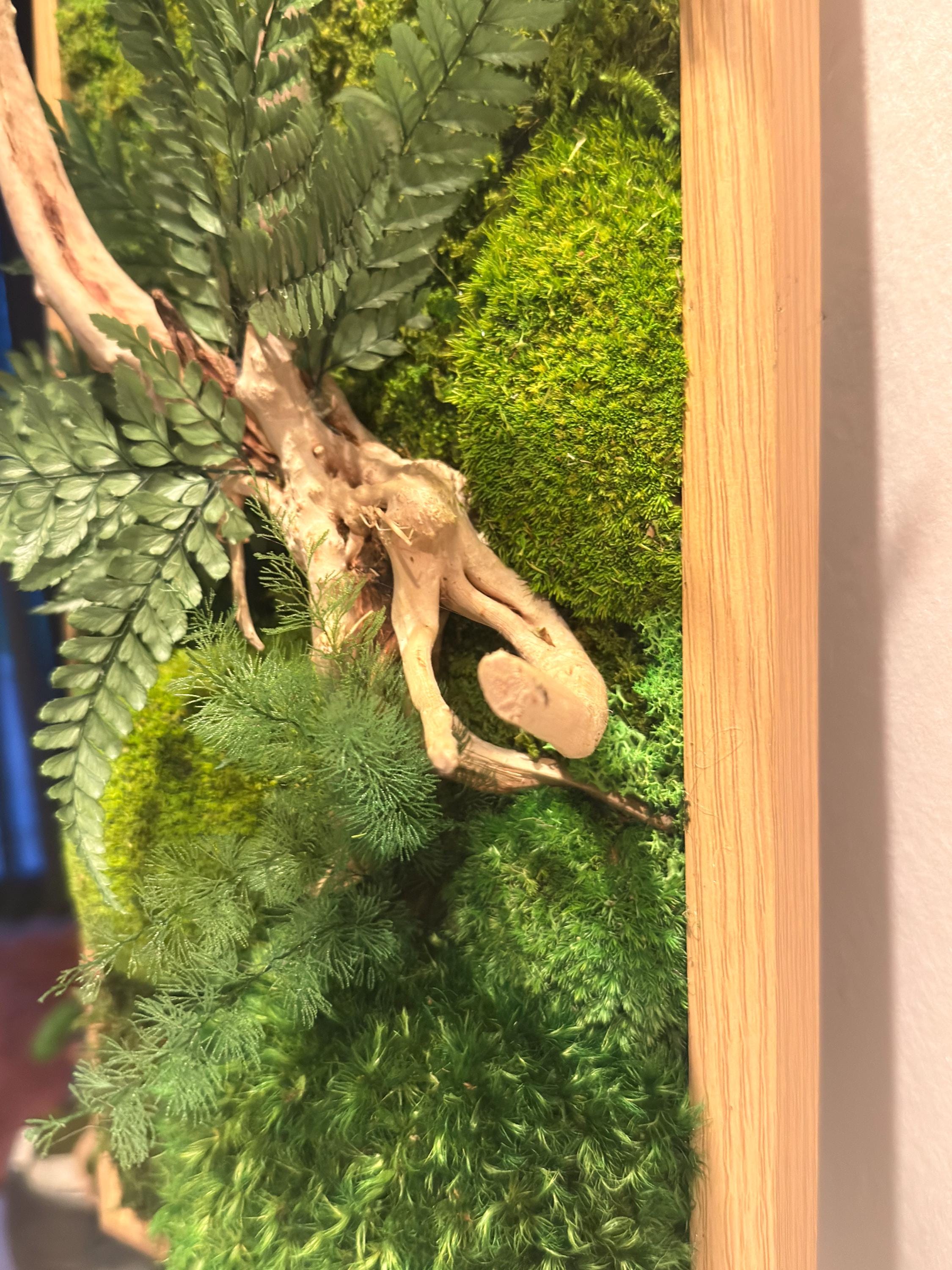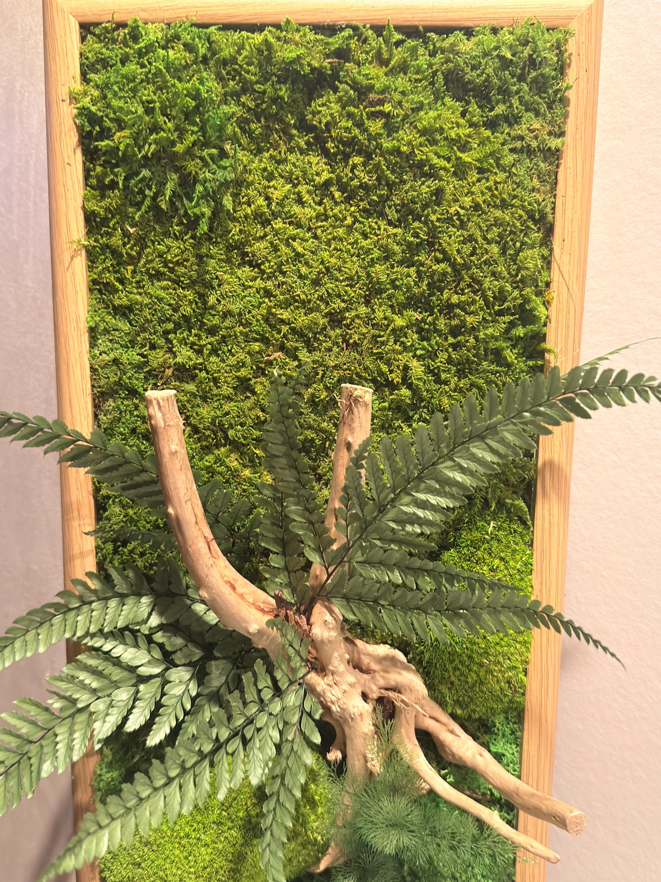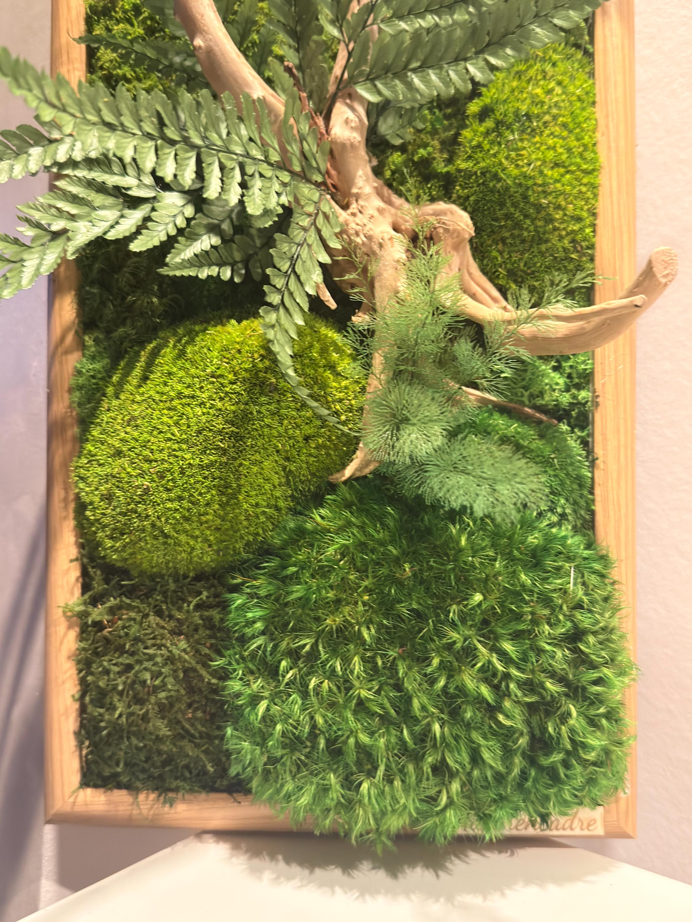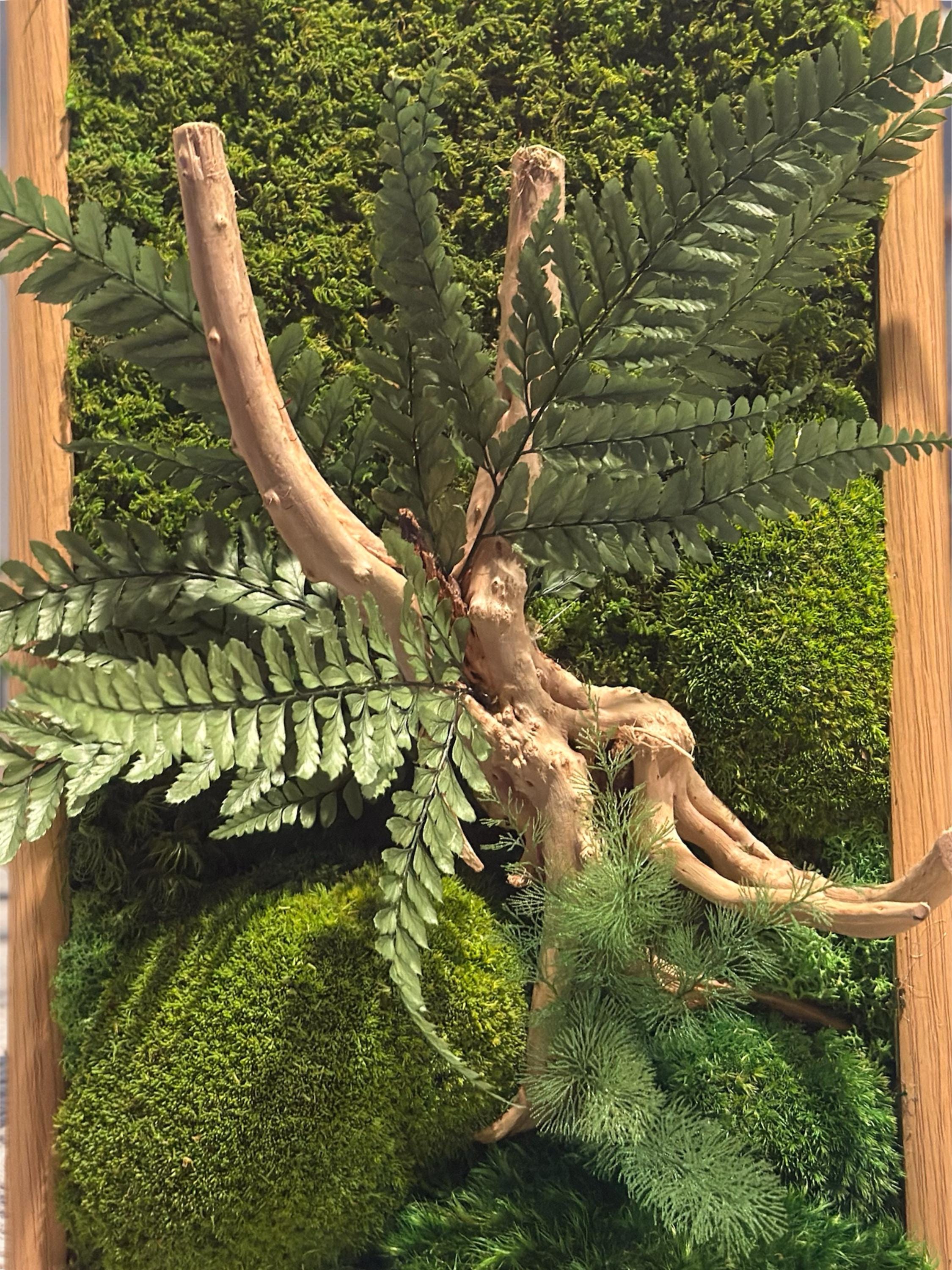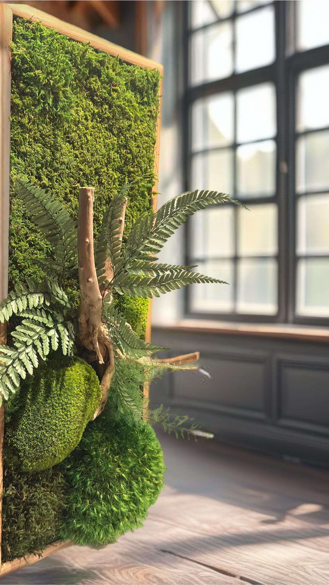 Une création unique mêlant mousses naturelles, feuillages délicats et bois flotté pour un effet forêt moderne et structuré.
