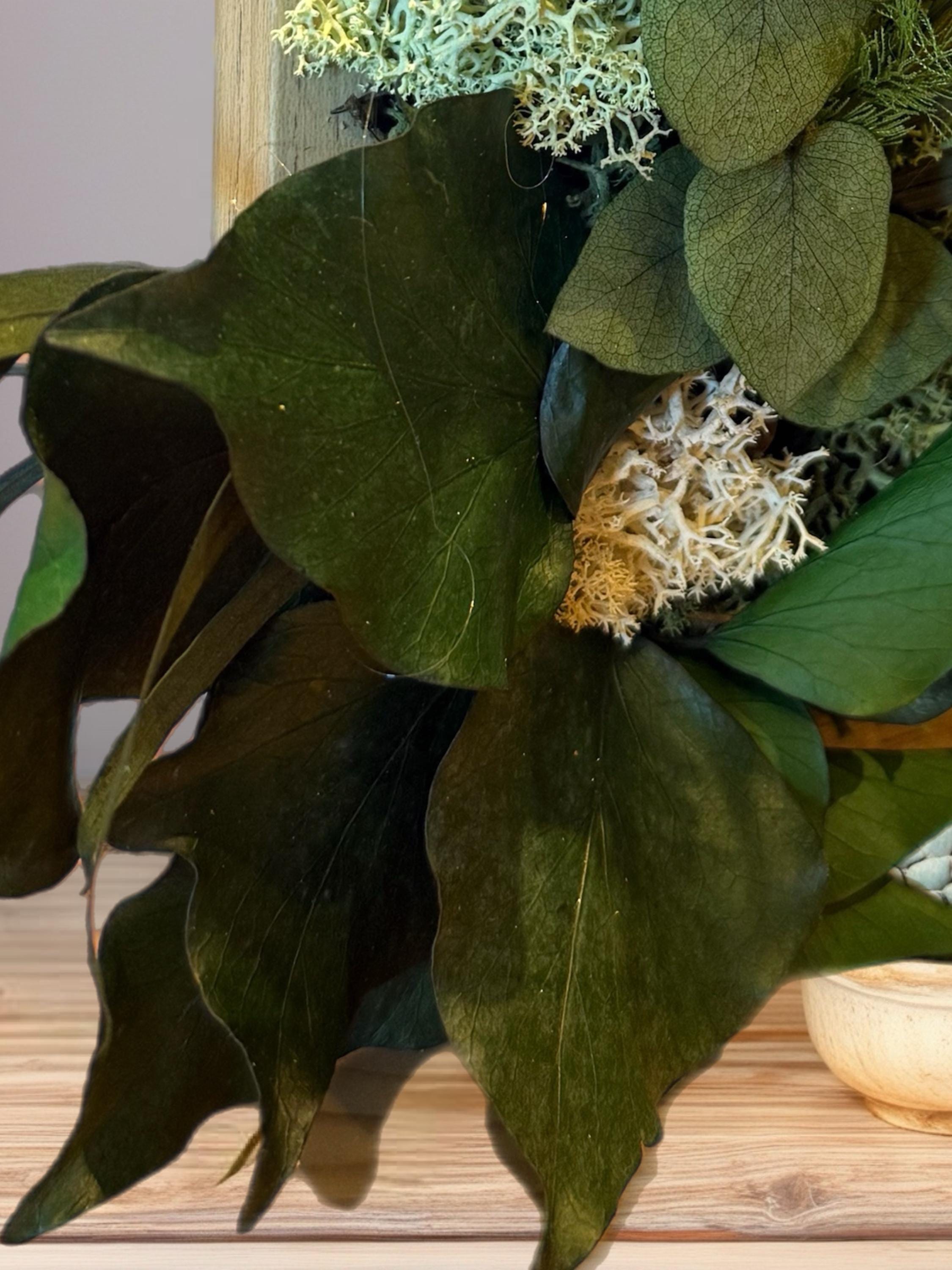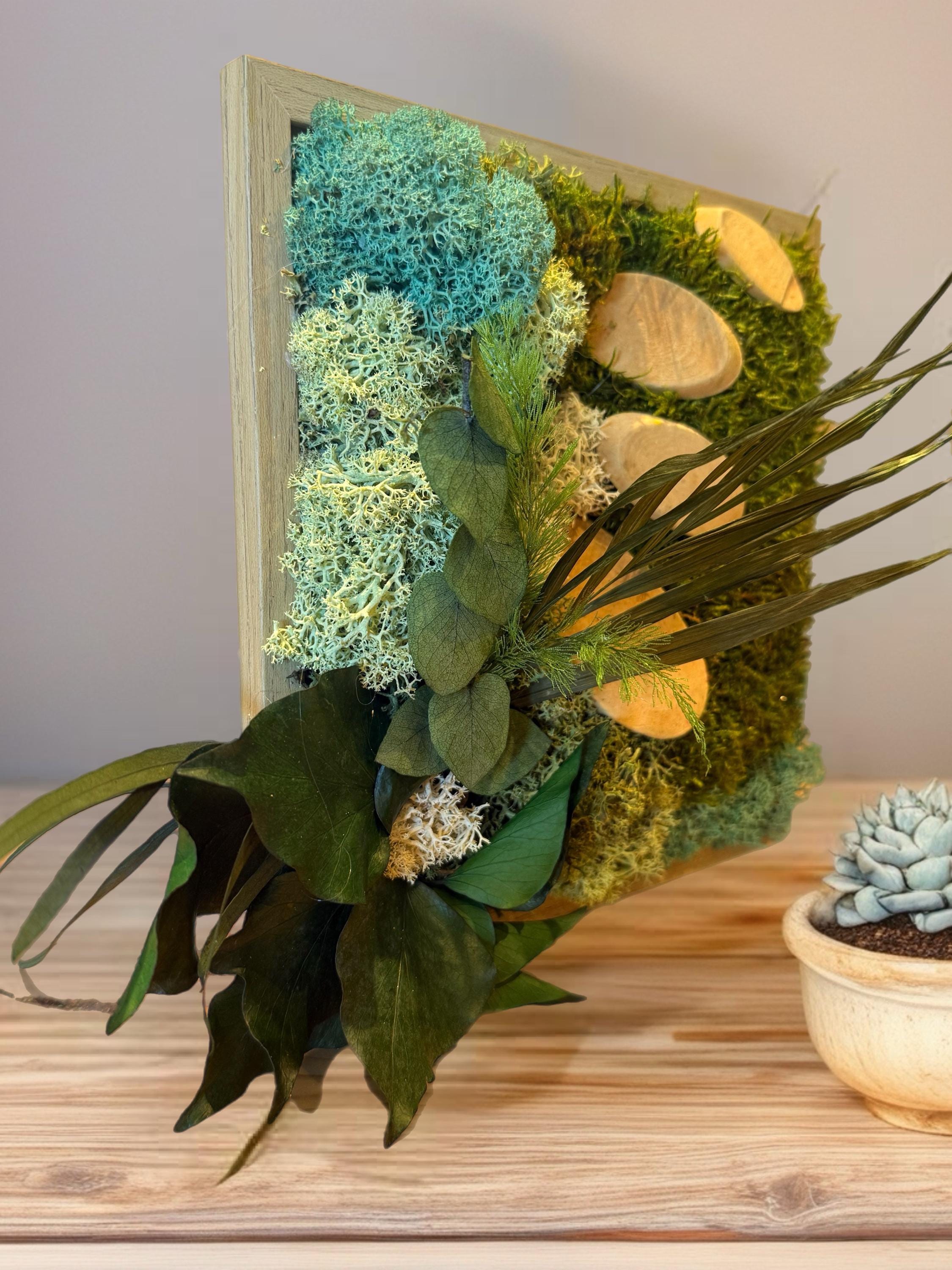 Une création végétale unique aux nuances vertes et bleutées, sans entretien, pour une décoration apaisante et élégante 🌿