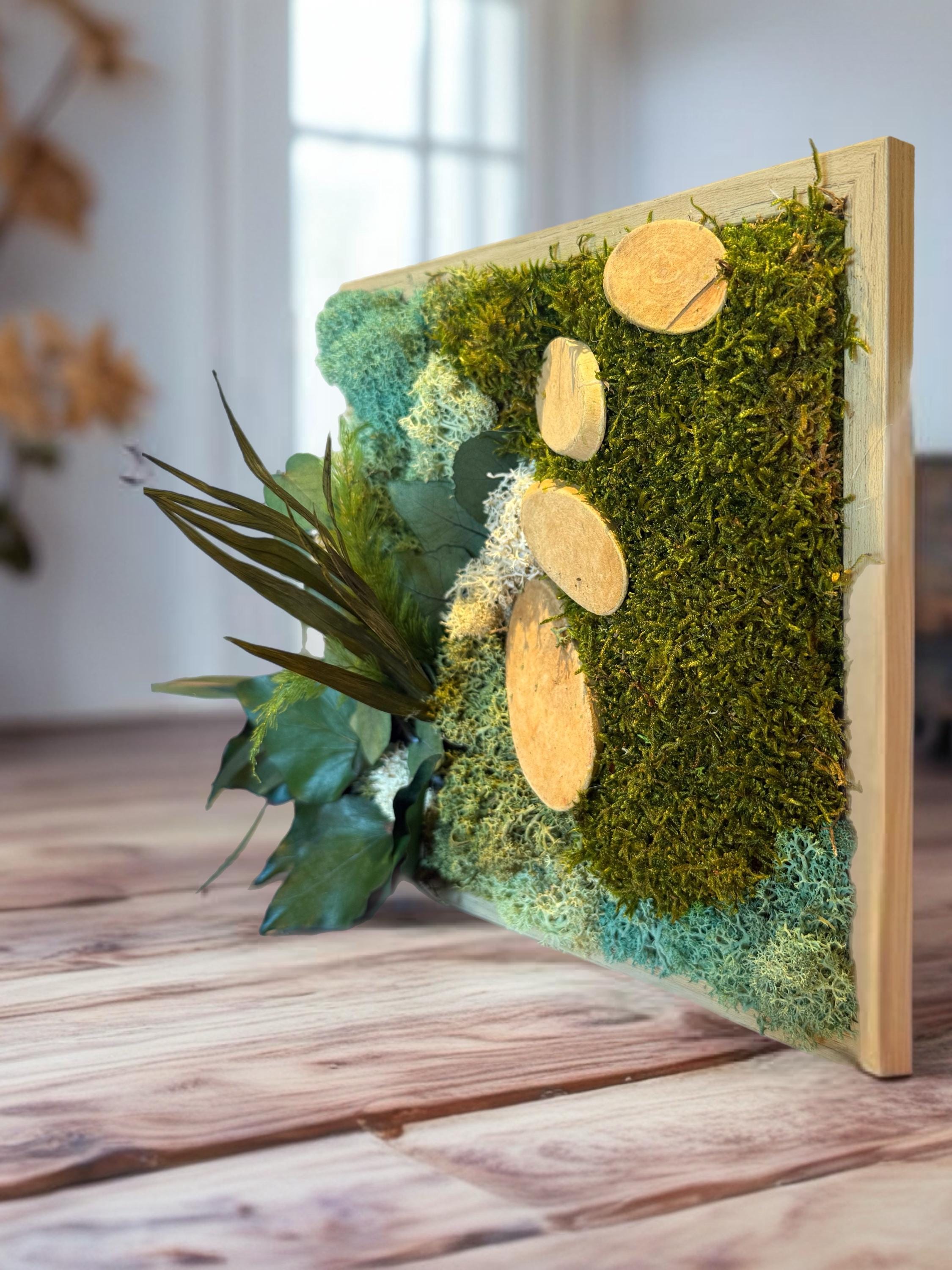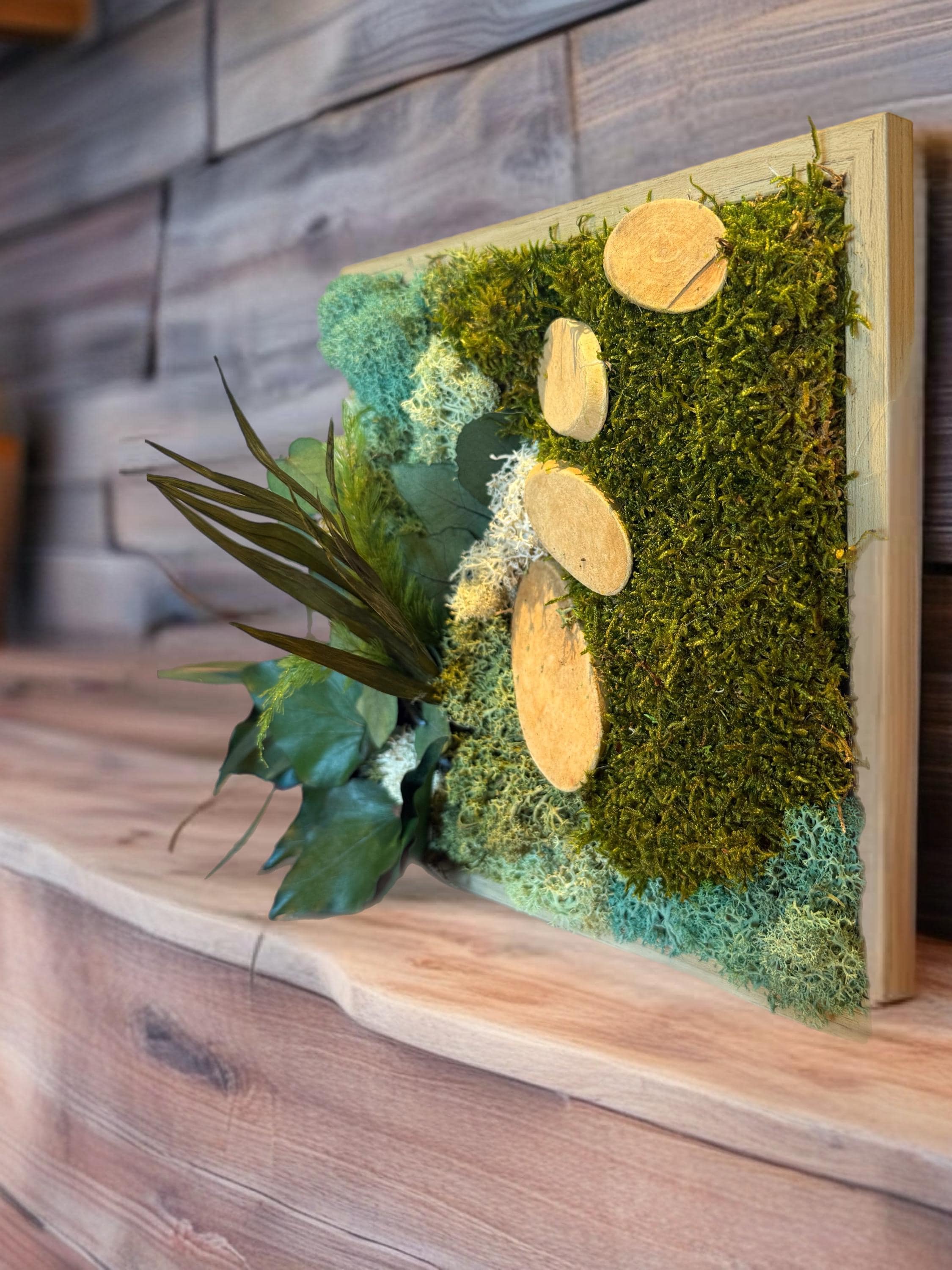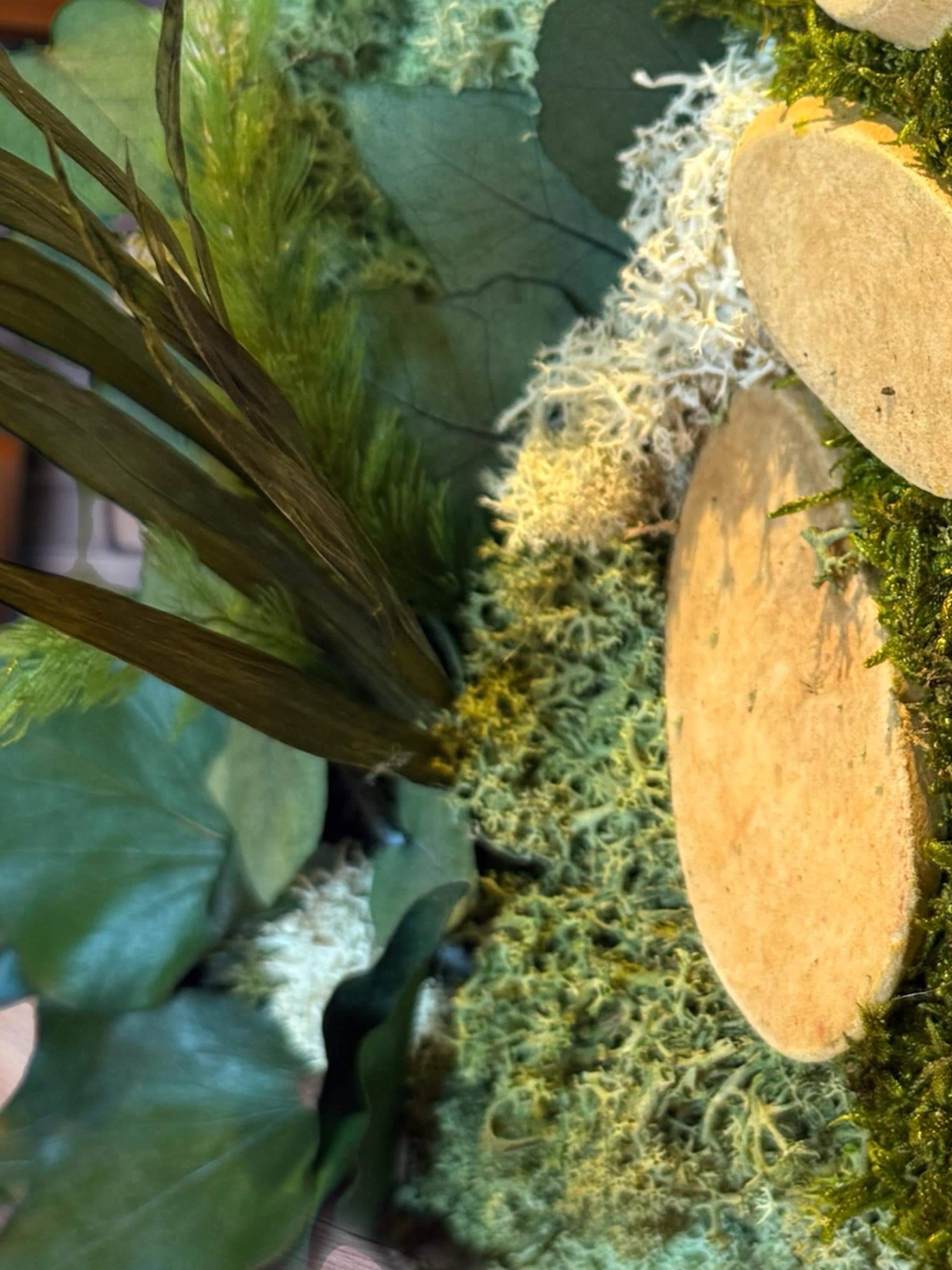 Les différentes mousses stabilisées créent un fond riche en textures, tandis que le feuillage en relief apporte mouvement et légèreté.