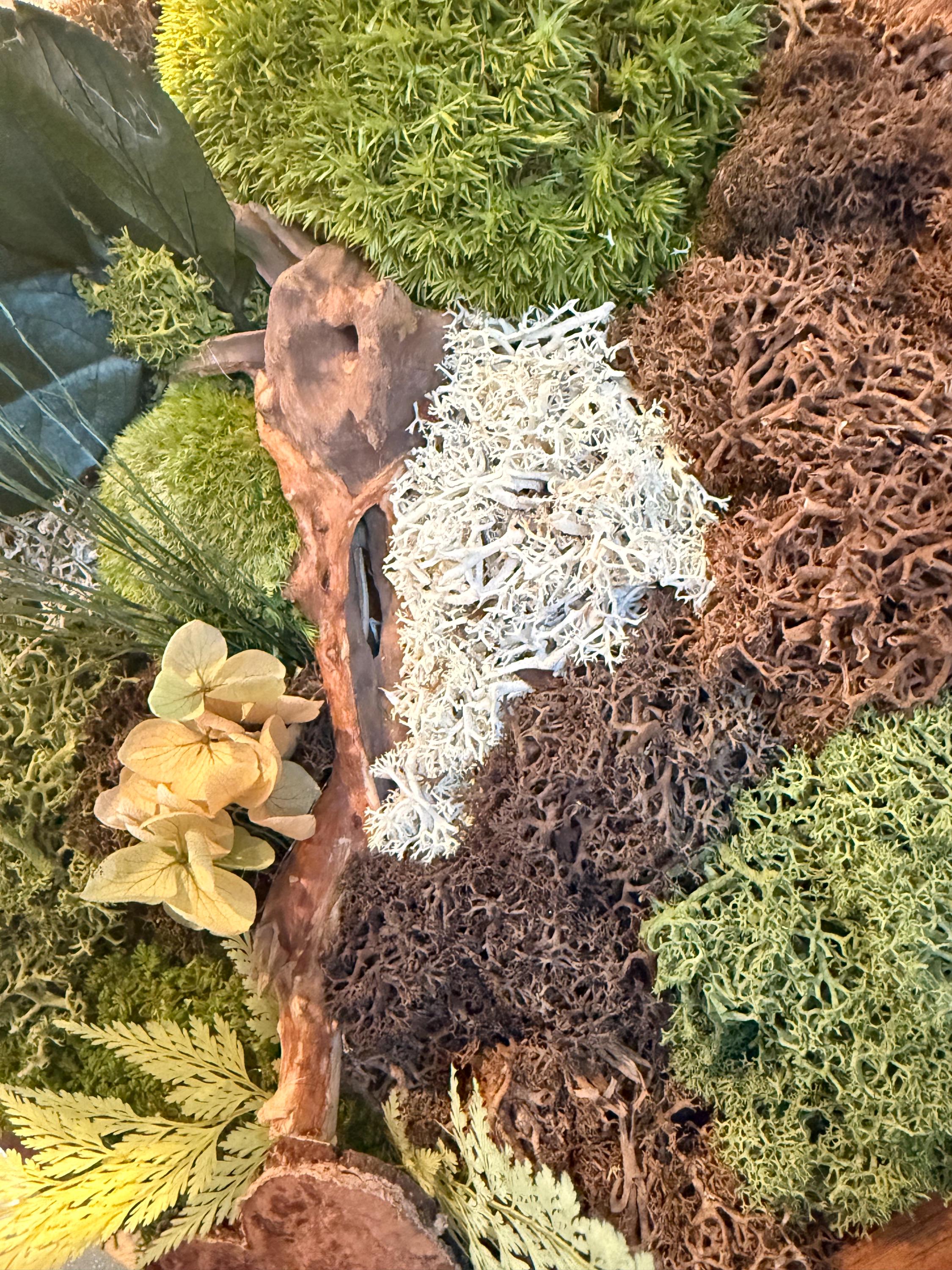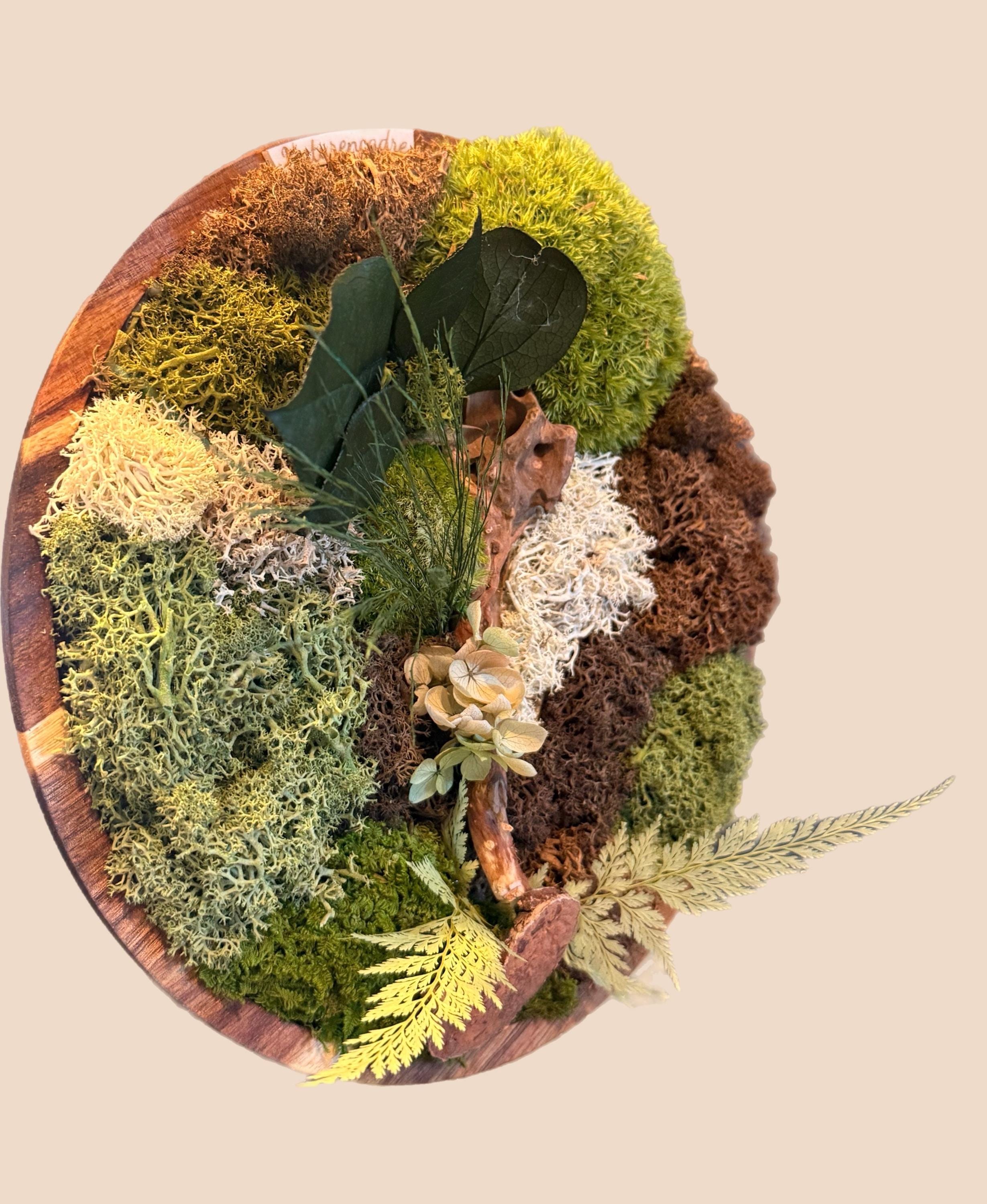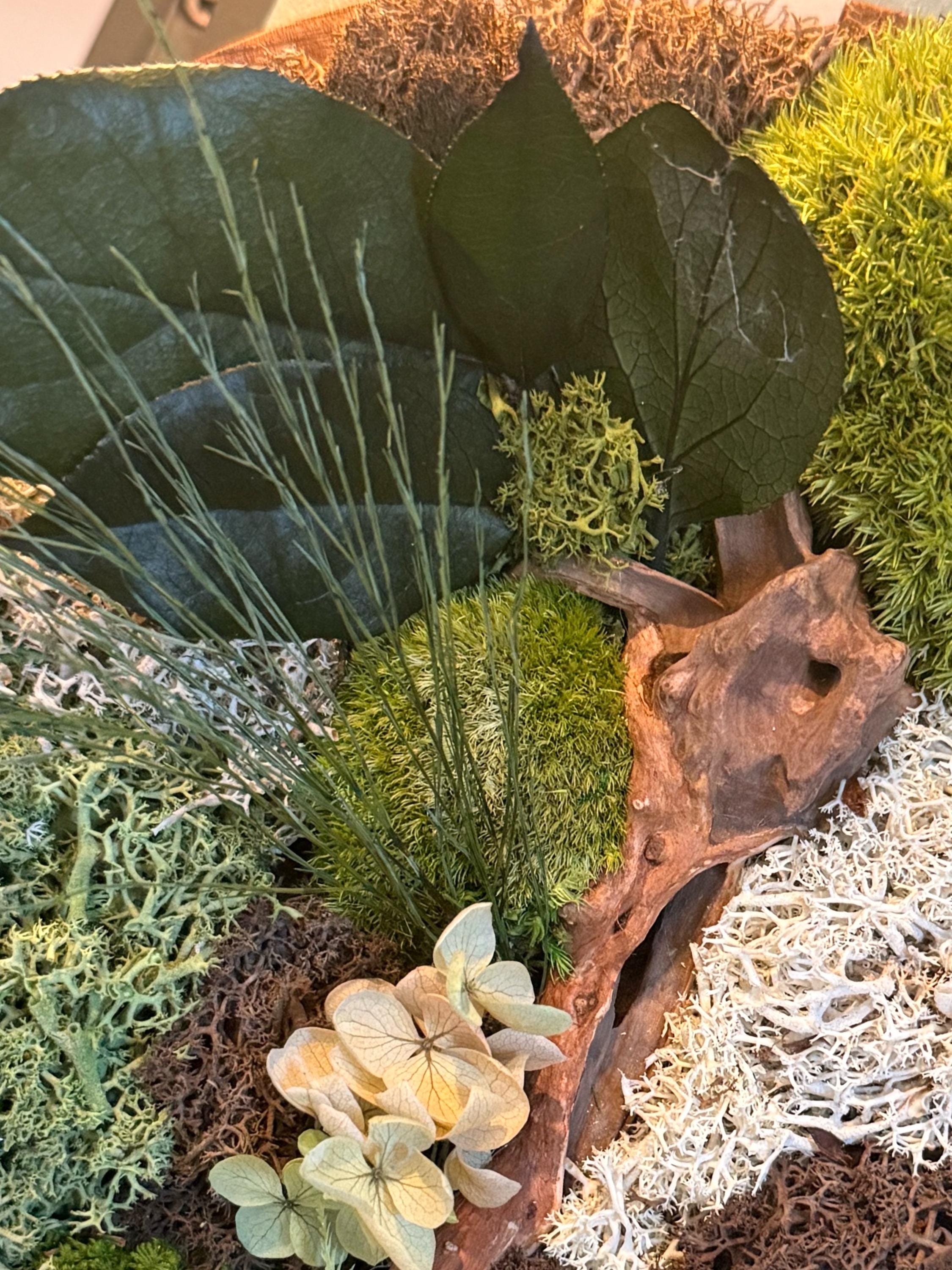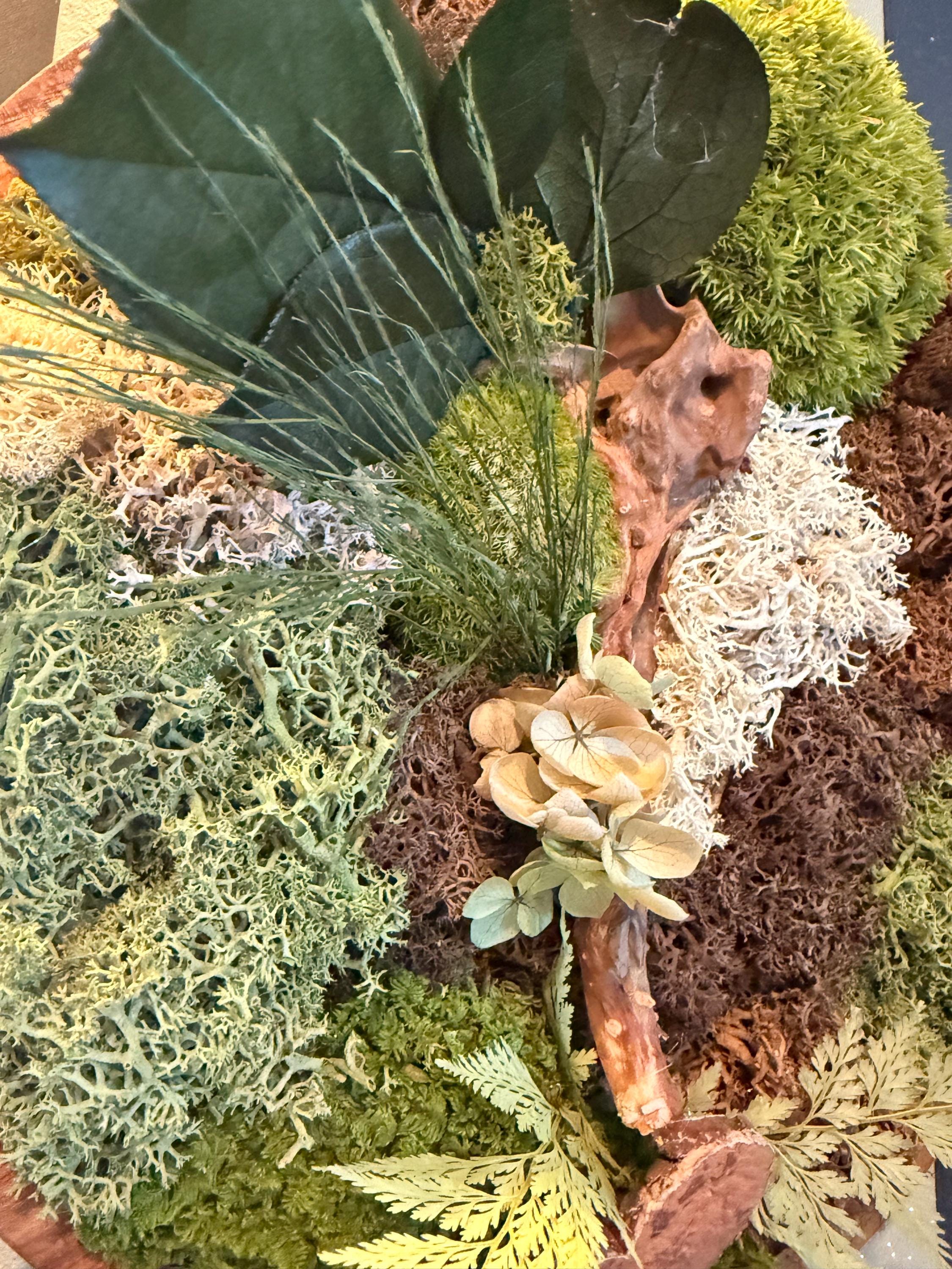 Sa composition harmonieuse mêle différentes textures de mousses, feuillages et éléments naturels, dans des nuances profondes de vert, sublimées par des touches de vert sauge, tendance et intemporelle.