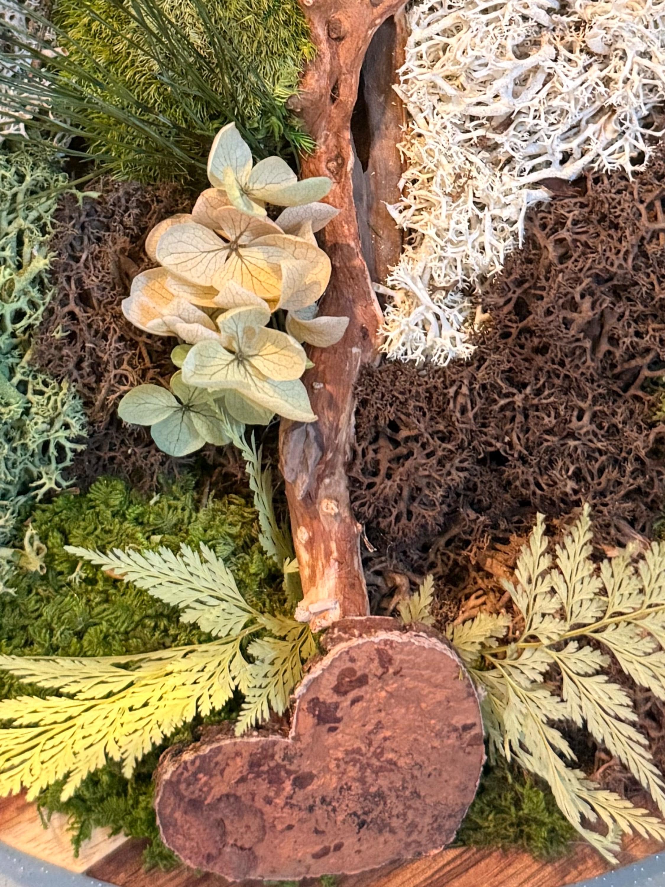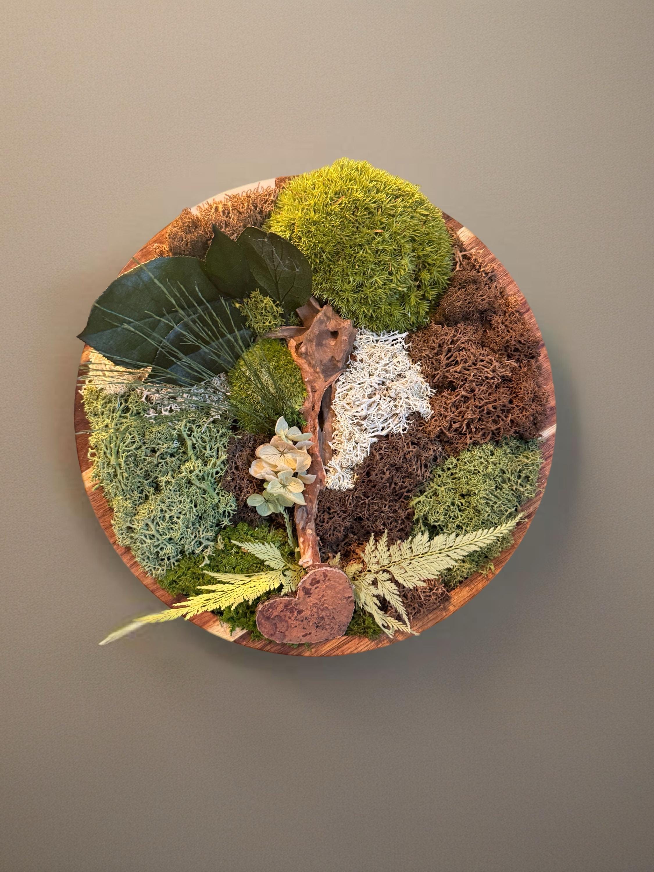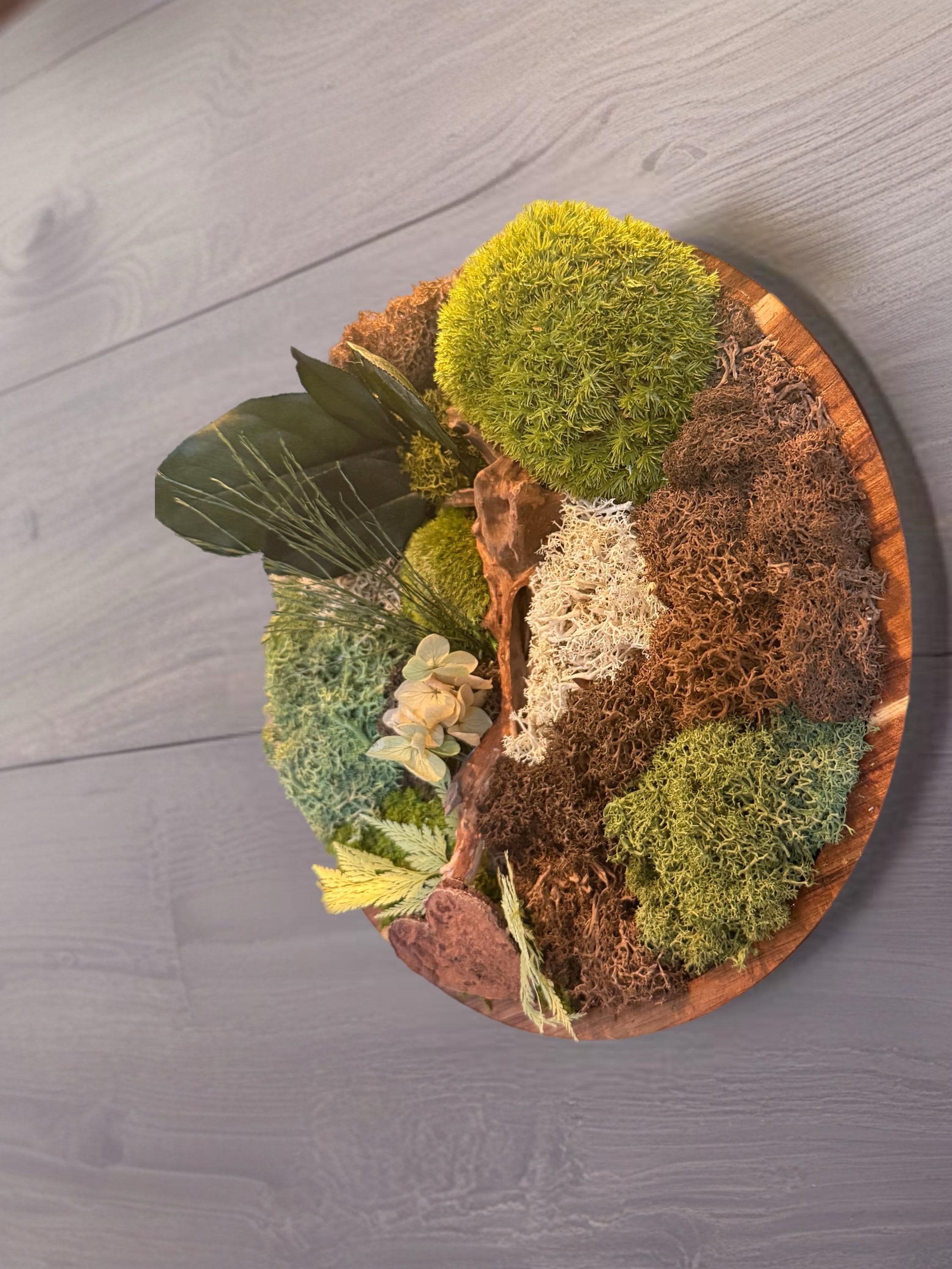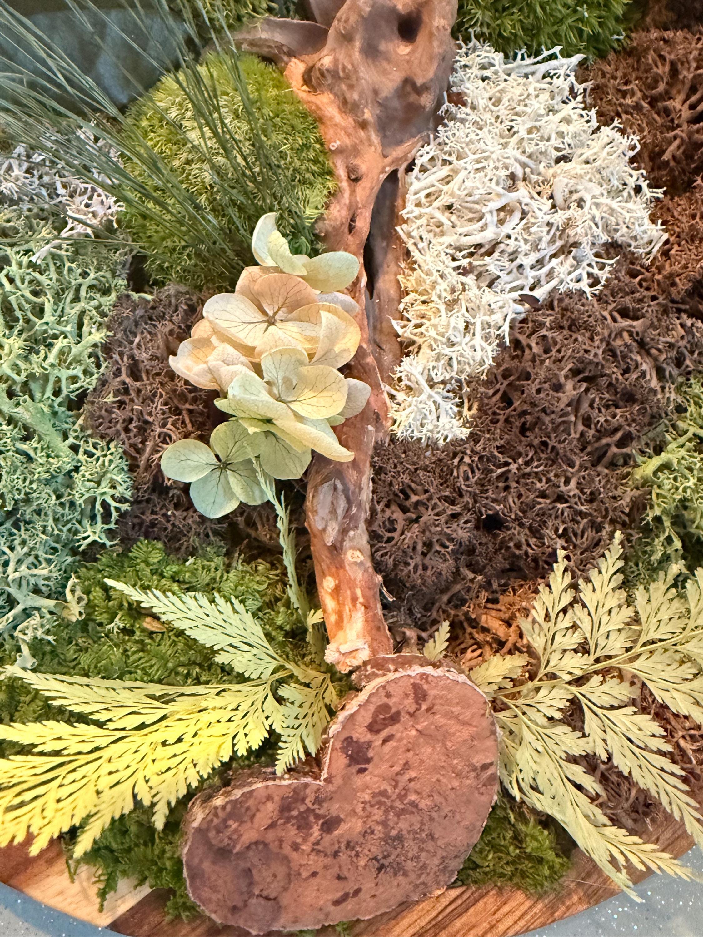 Sa composition harmonieuse mêle différentes textures de mousses, feuillages et éléments naturels, dans des nuances profondes de vert, sublimées par des touches de vert sauge, tendance et intemporelle.