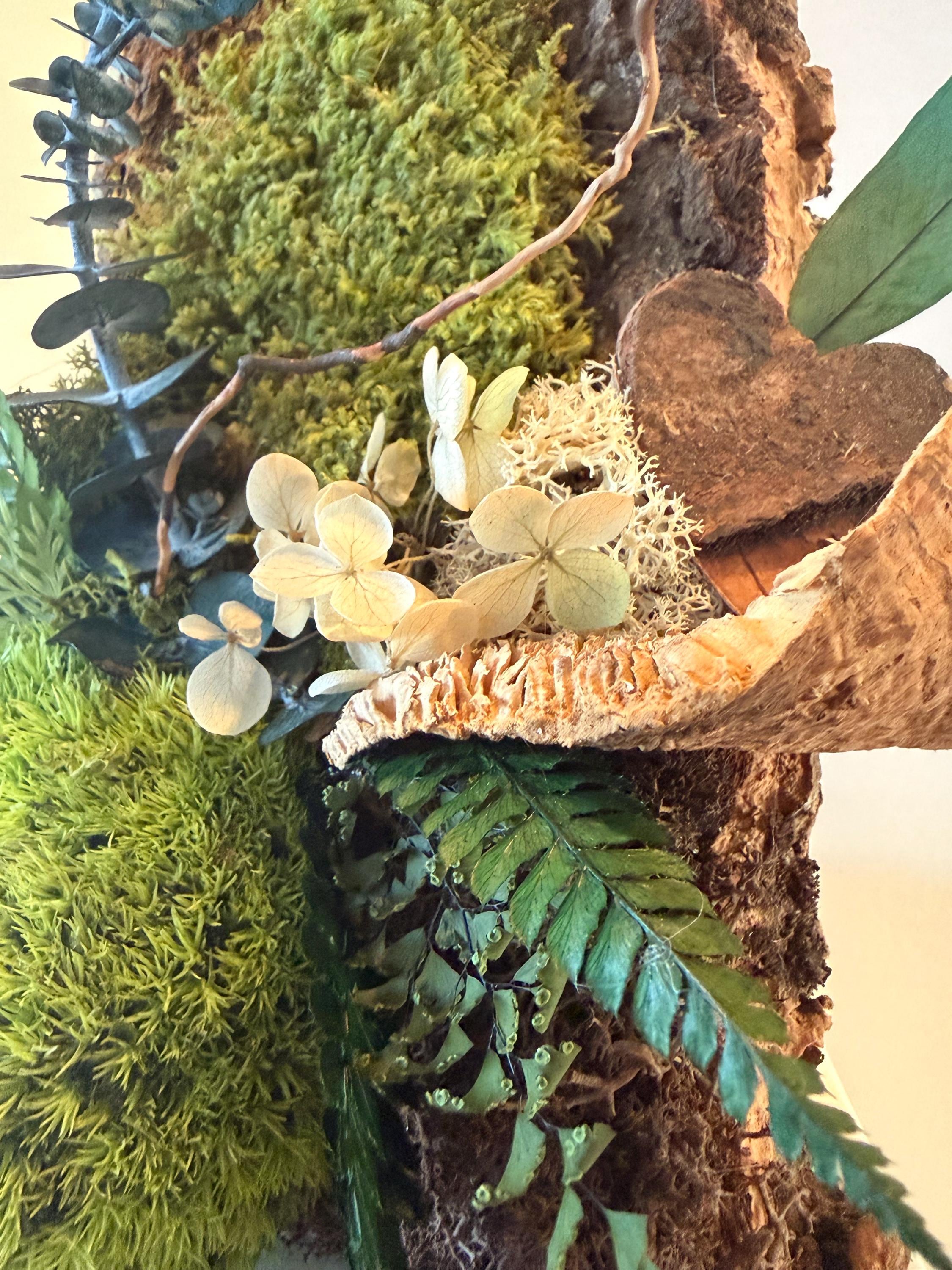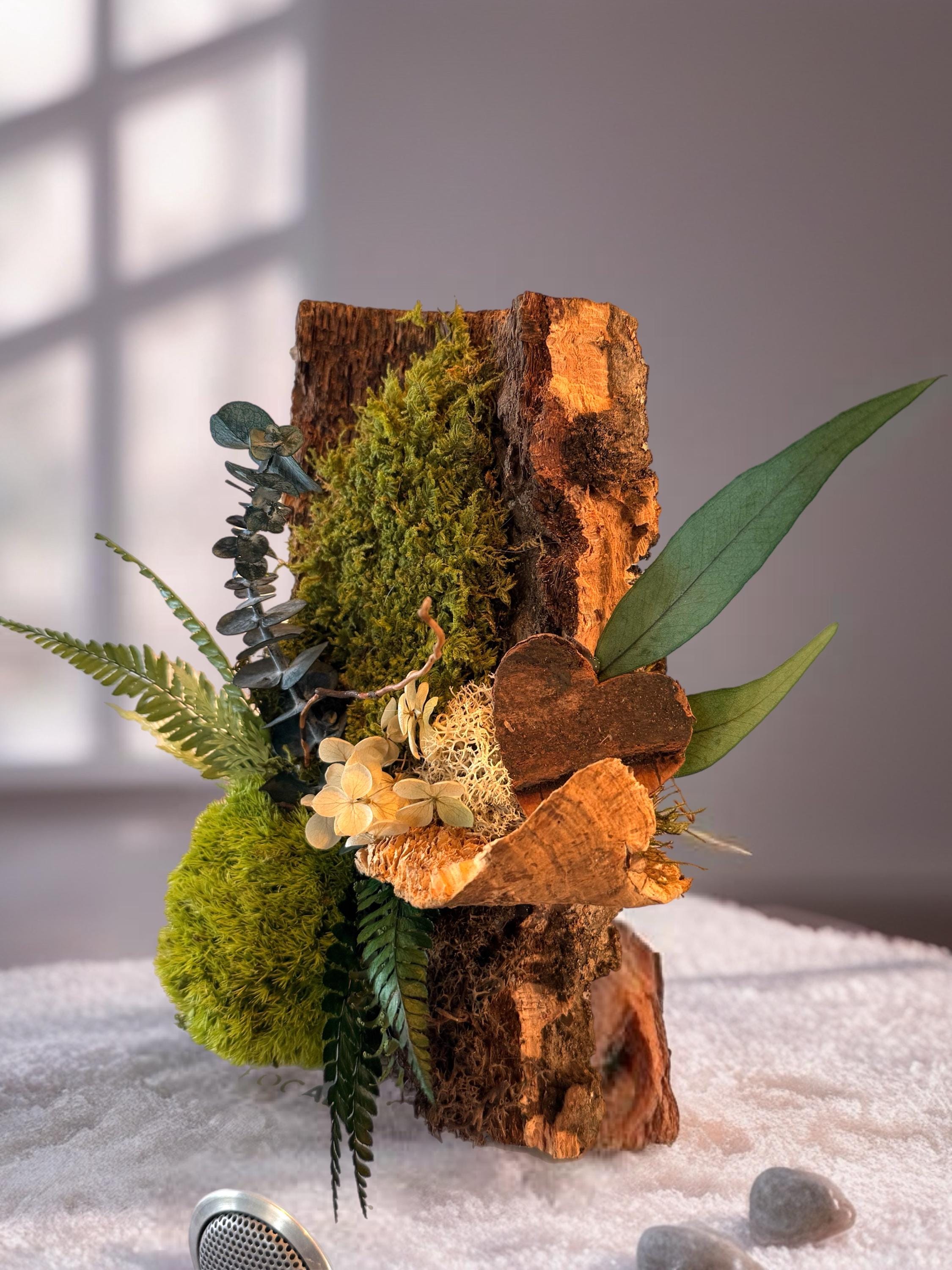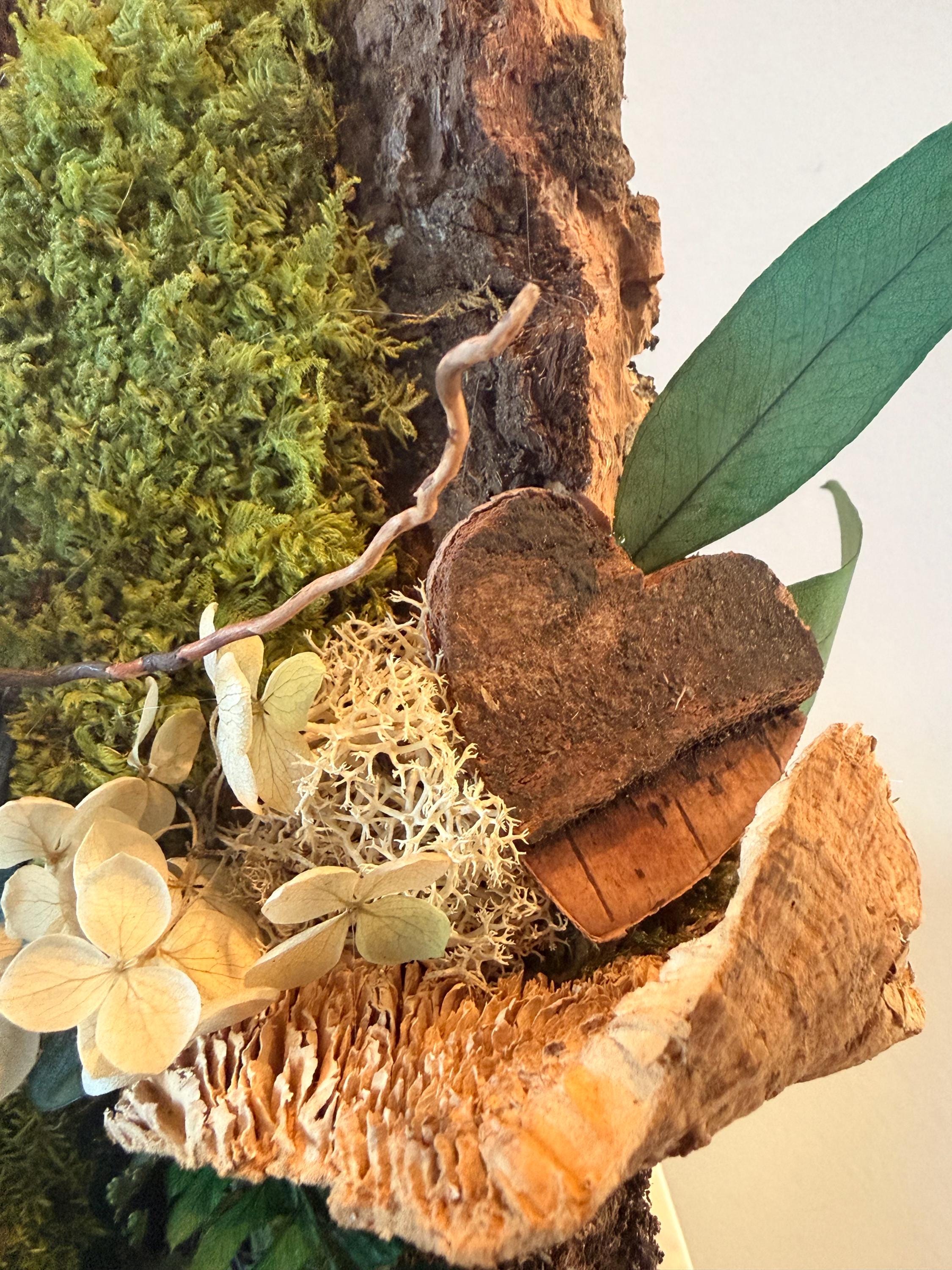 Réalisé à partir d’un morceau d’écorce naturelle, il met en valeur une composition harmonieuse de végétaux stabilisés soigneusement sélectionnés. Le petit cœur en bois apporte une dimension symbolique et chaleureuse, idéale pour une décoration pleine de sens.