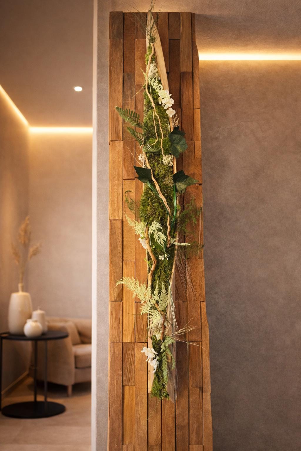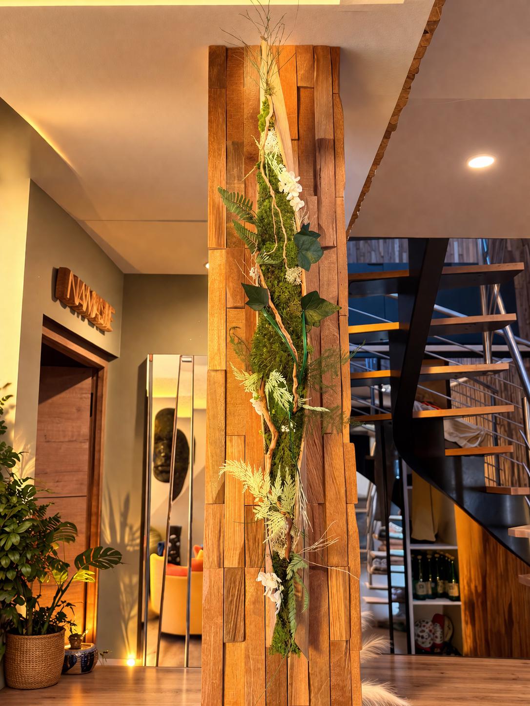 The contrast between warm wood, lush greenery, and raw palm texture creates a unique, modern, and calming visual effect.