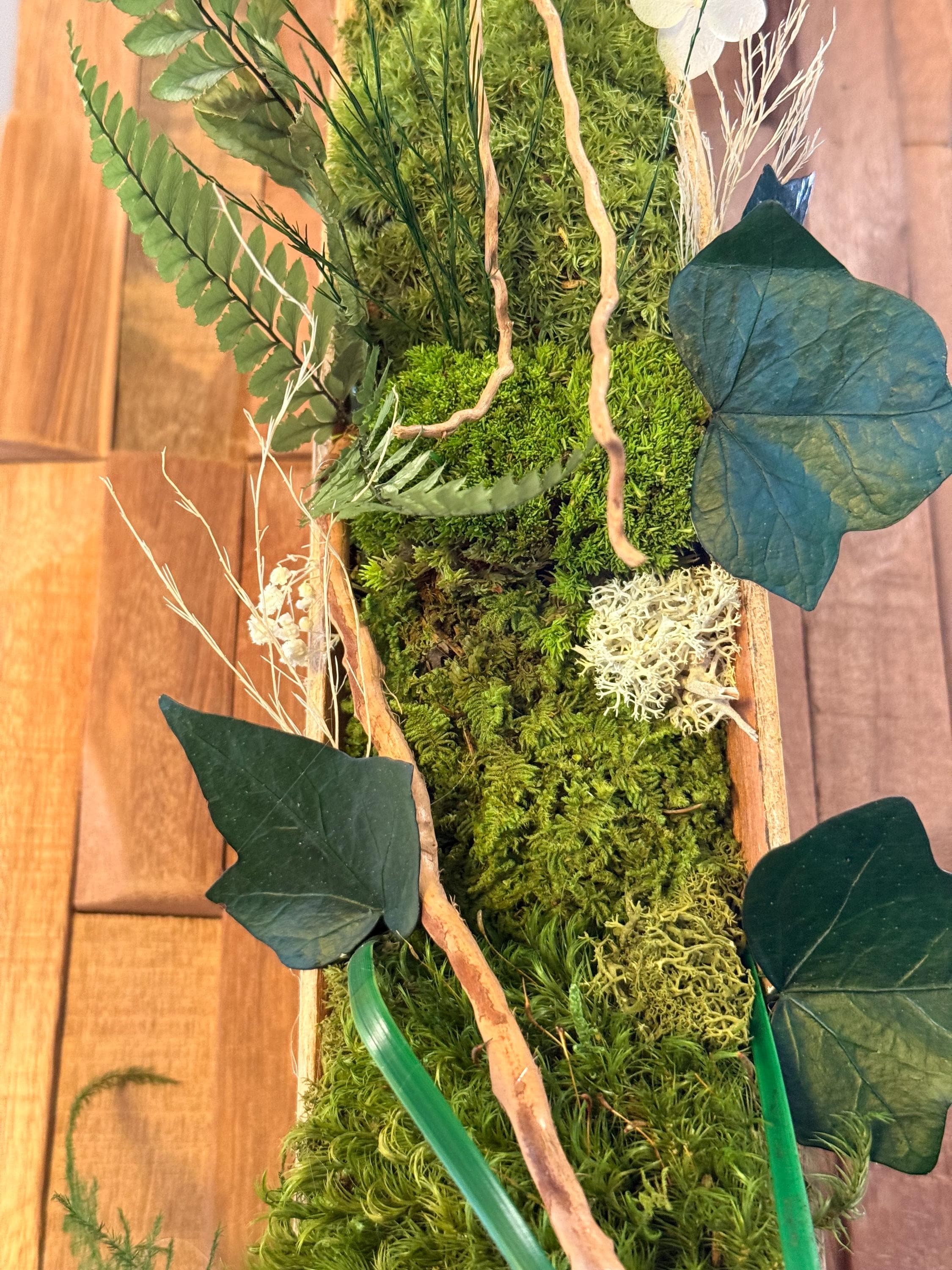 Built on a textured wooden base, it features a refined composition of preserved moss, delicate foliage, and carefully selected natural elements.