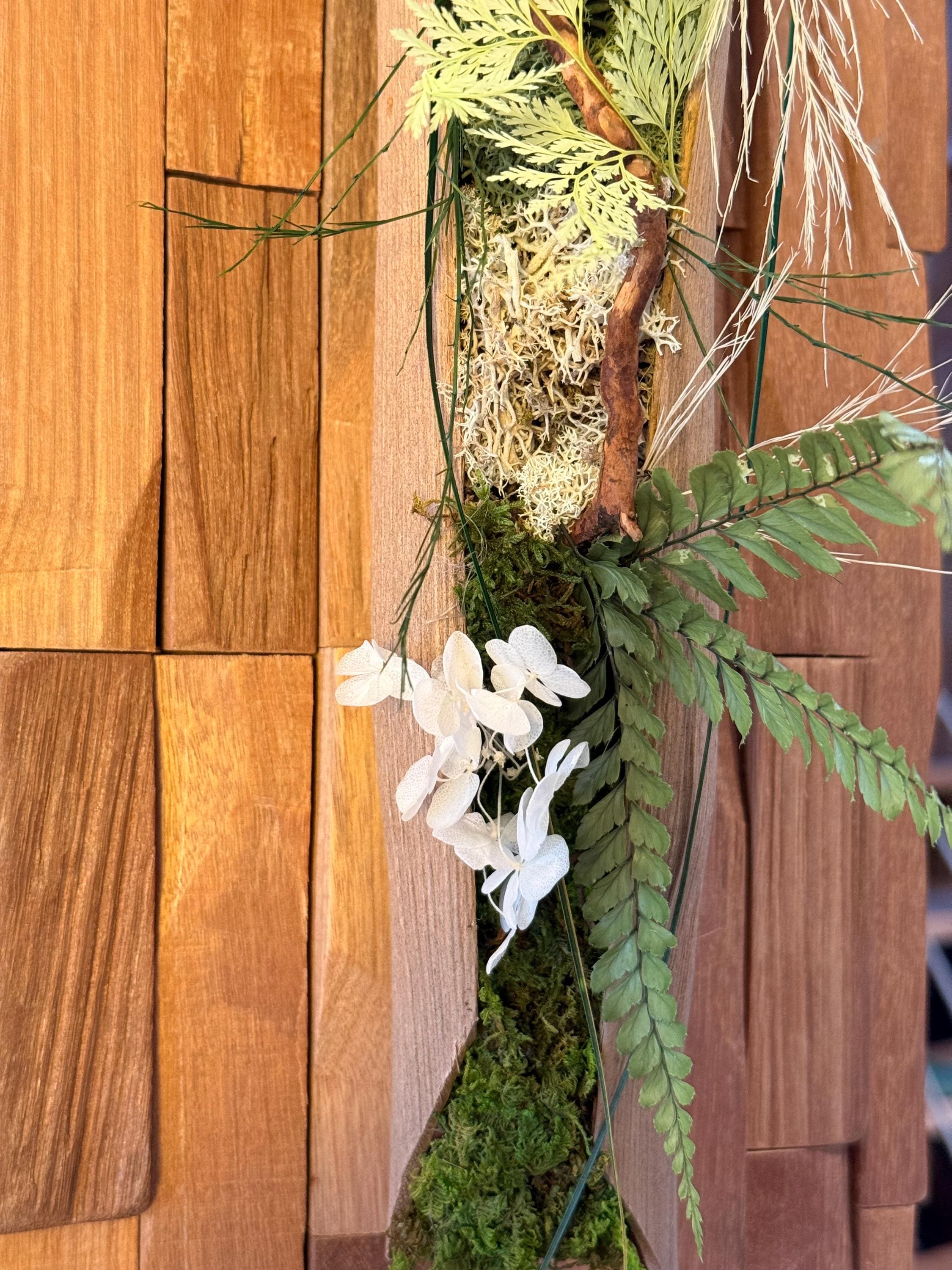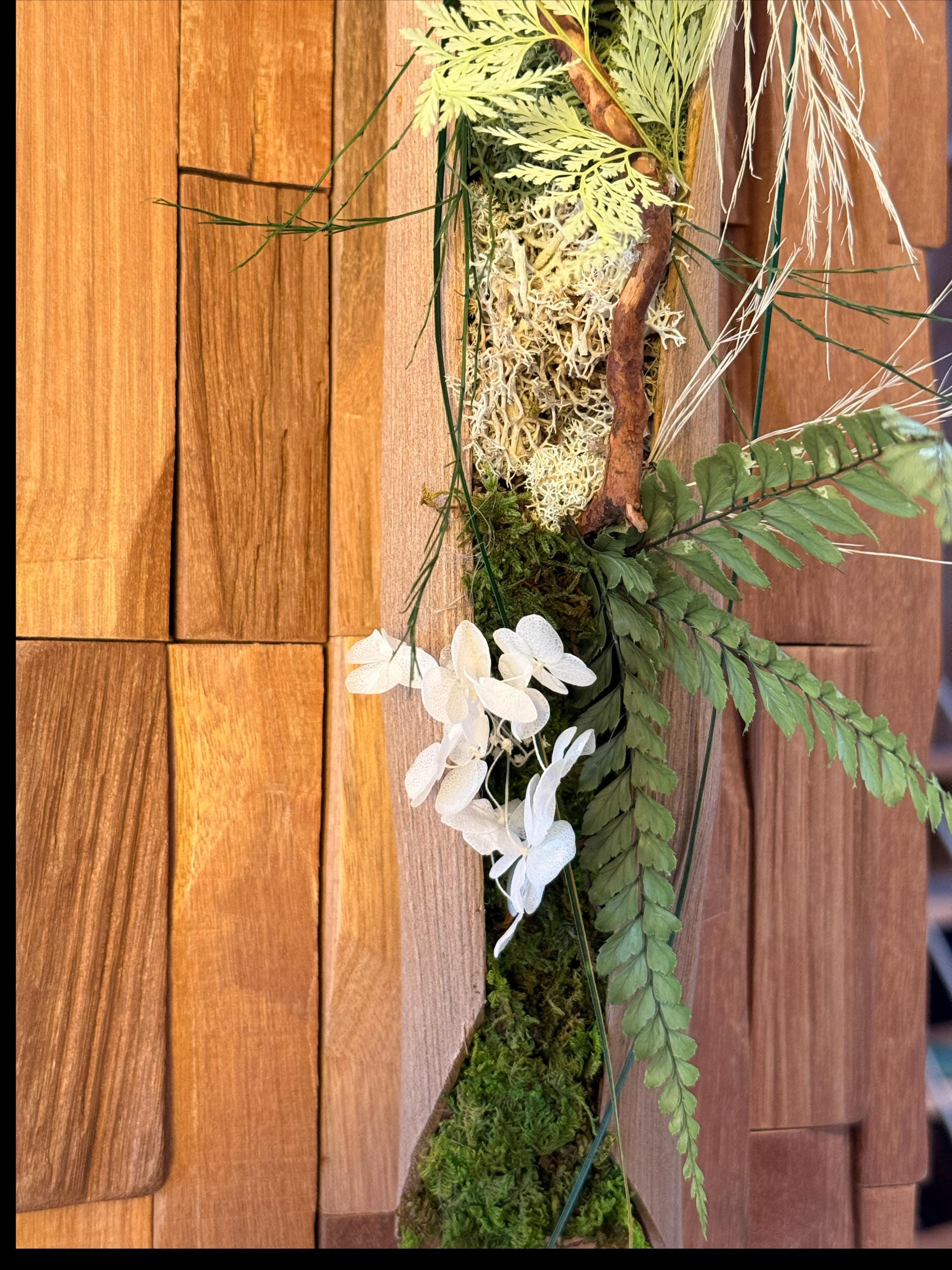 Sa structure en bois texturé aux reliefs graphiques accueille une composition végétale harmonieuse mêlant mousse stabilisée, feuillages délicats et éléments naturels soigneusement sélectionnés.