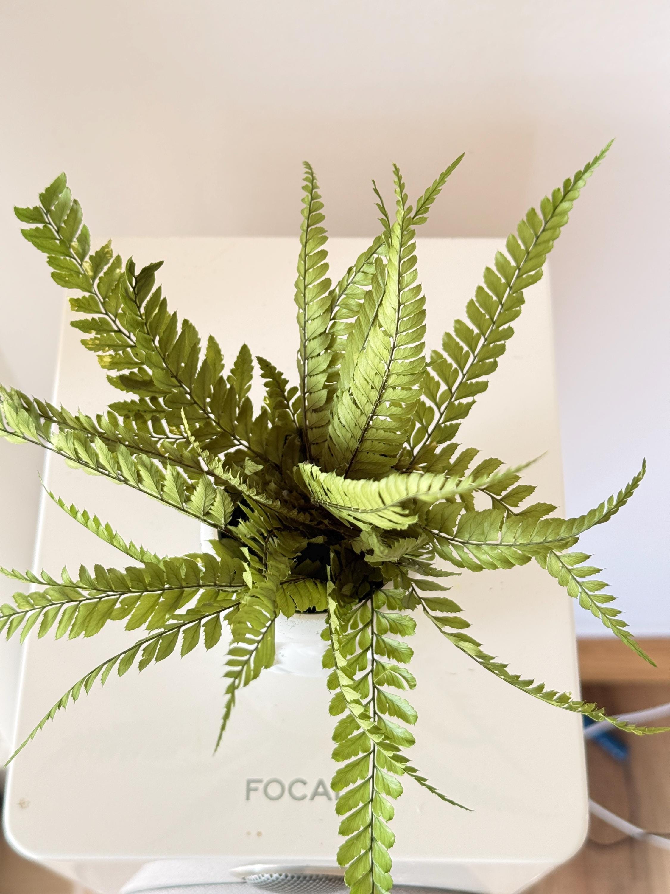 Sa finition blanche mate met en valeur les lignes du visage, tandis que la fougère stabilisée apporte légèreté, mouvement et douceur végétale.