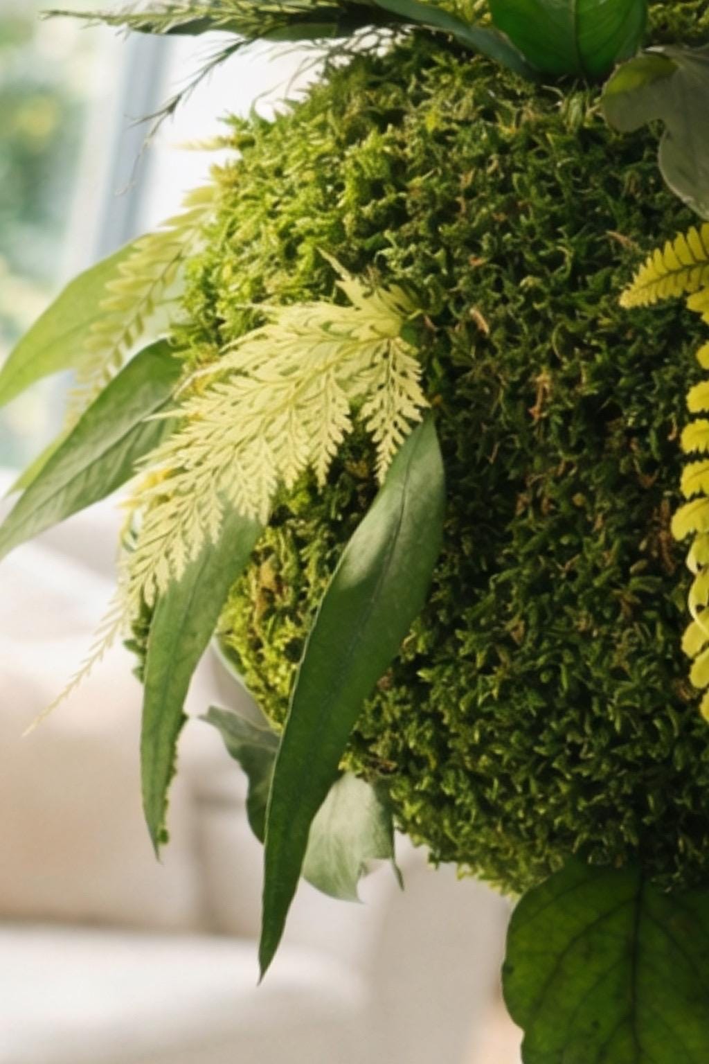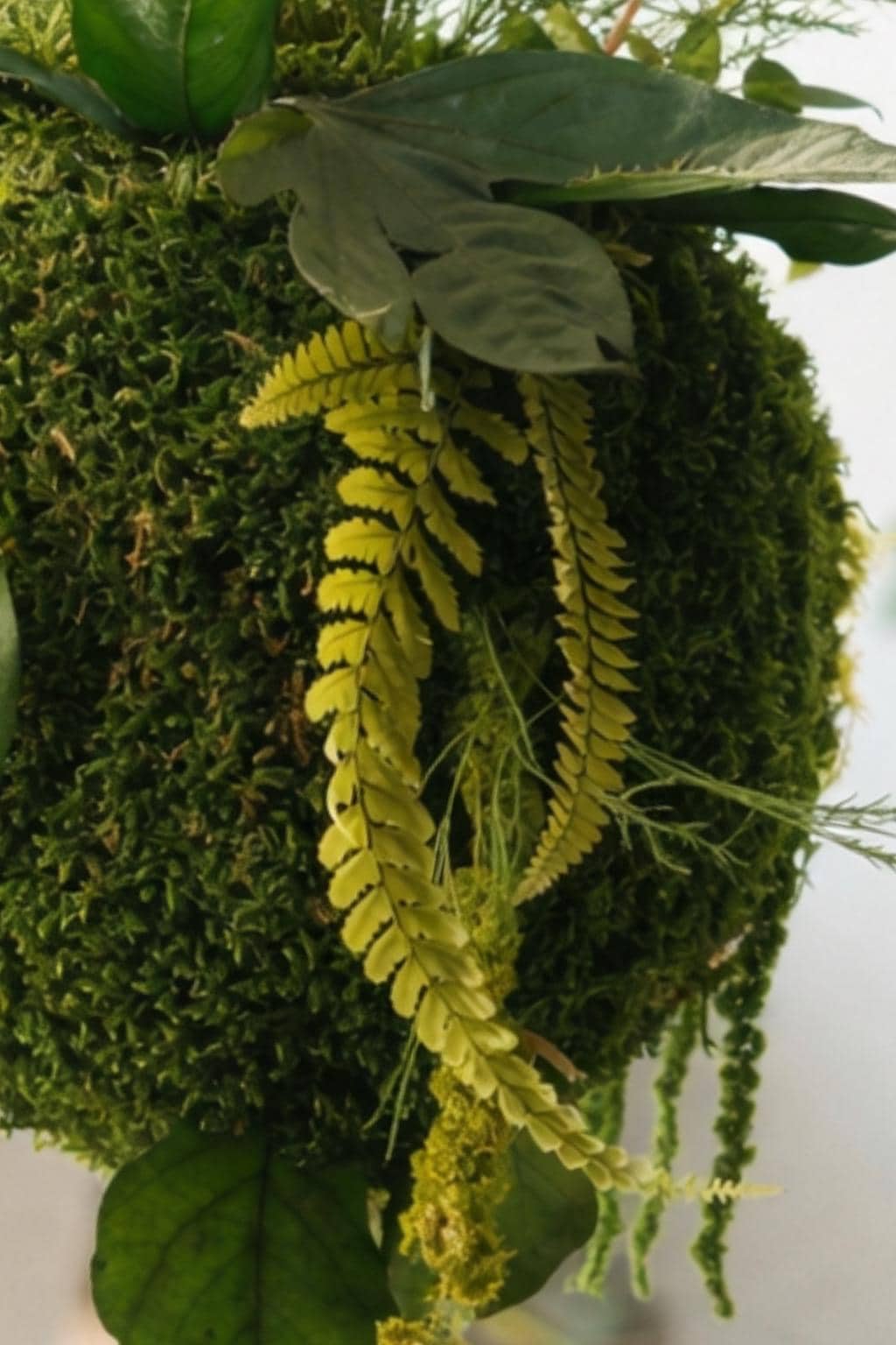 Cette sphère végétale associe mousse naturelle, feuillages délicats et lignes graphiques pour créer une décoration aérienne, idéale dans un hall d’entrée, une cage d’escalier, un salon ou un espace professionnel.